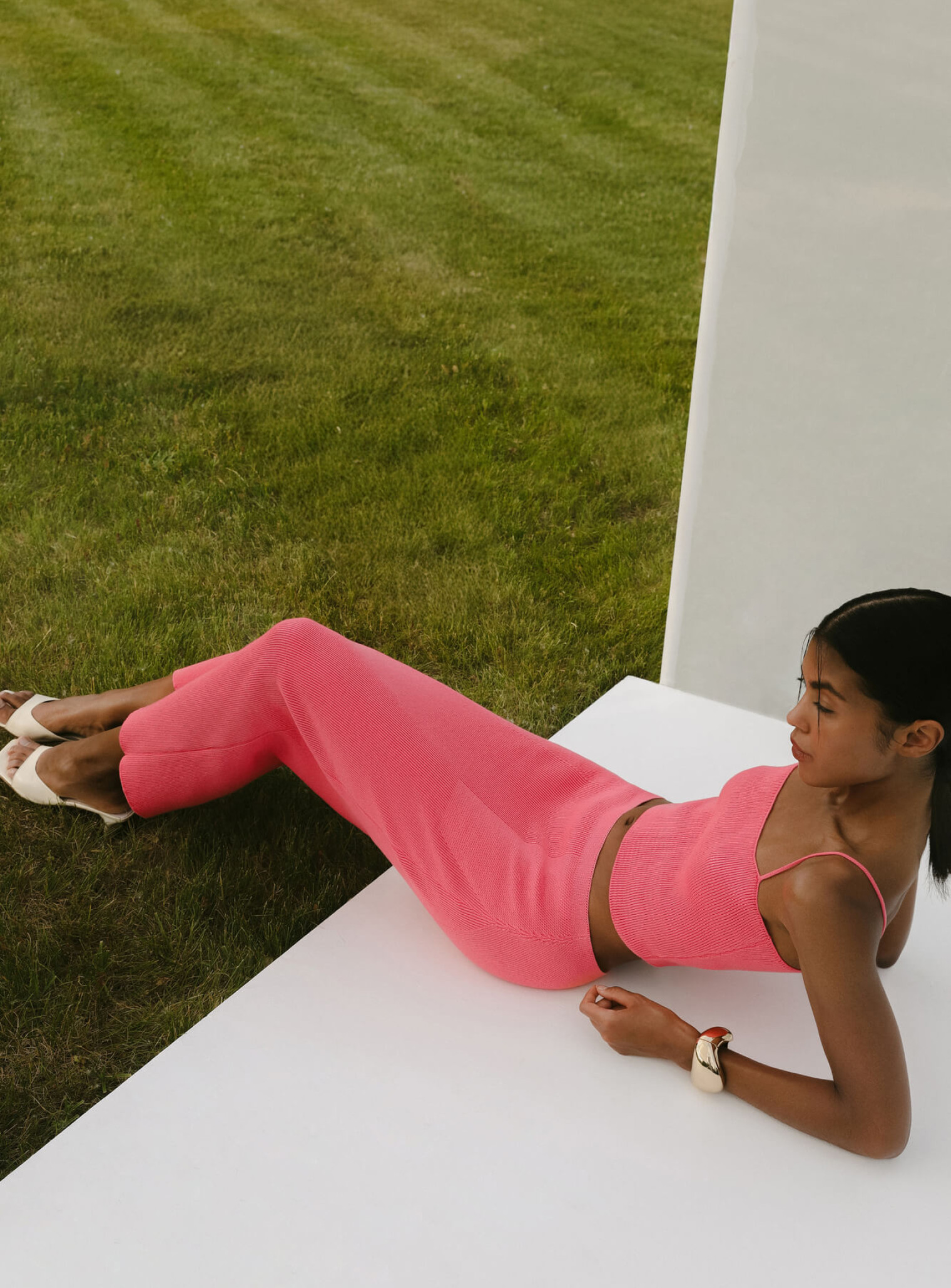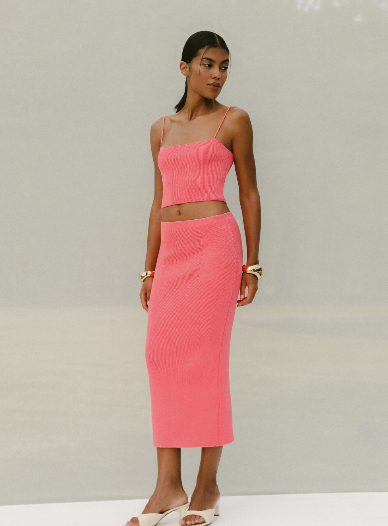 Базовый комплект из топа бандо на тонких бретелях и юбки с рисунком имитацией баски выполнен из фактурной вязки, хорошо тянущейся и облегающей силуэт, подчеркивая линии фигуры. Стильный образ, который освежит ваш летний гардероб благодаря яркой цветовой гамме. Идеальная формула комплекта для повседневной жизни, которую вы можете носить вместе и отдельно, сочетая с любимыми изделиями.