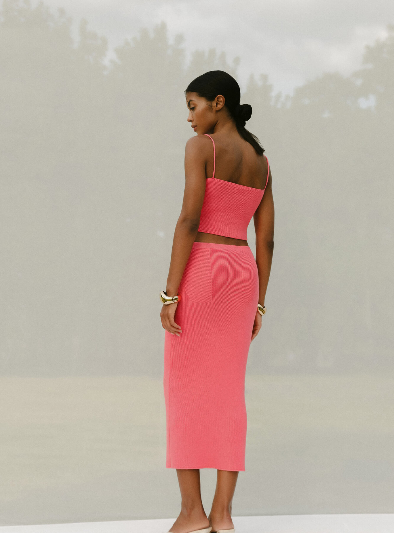 Комплект топ бандо и юбка миди с имитацией баски Леймон коралловый
