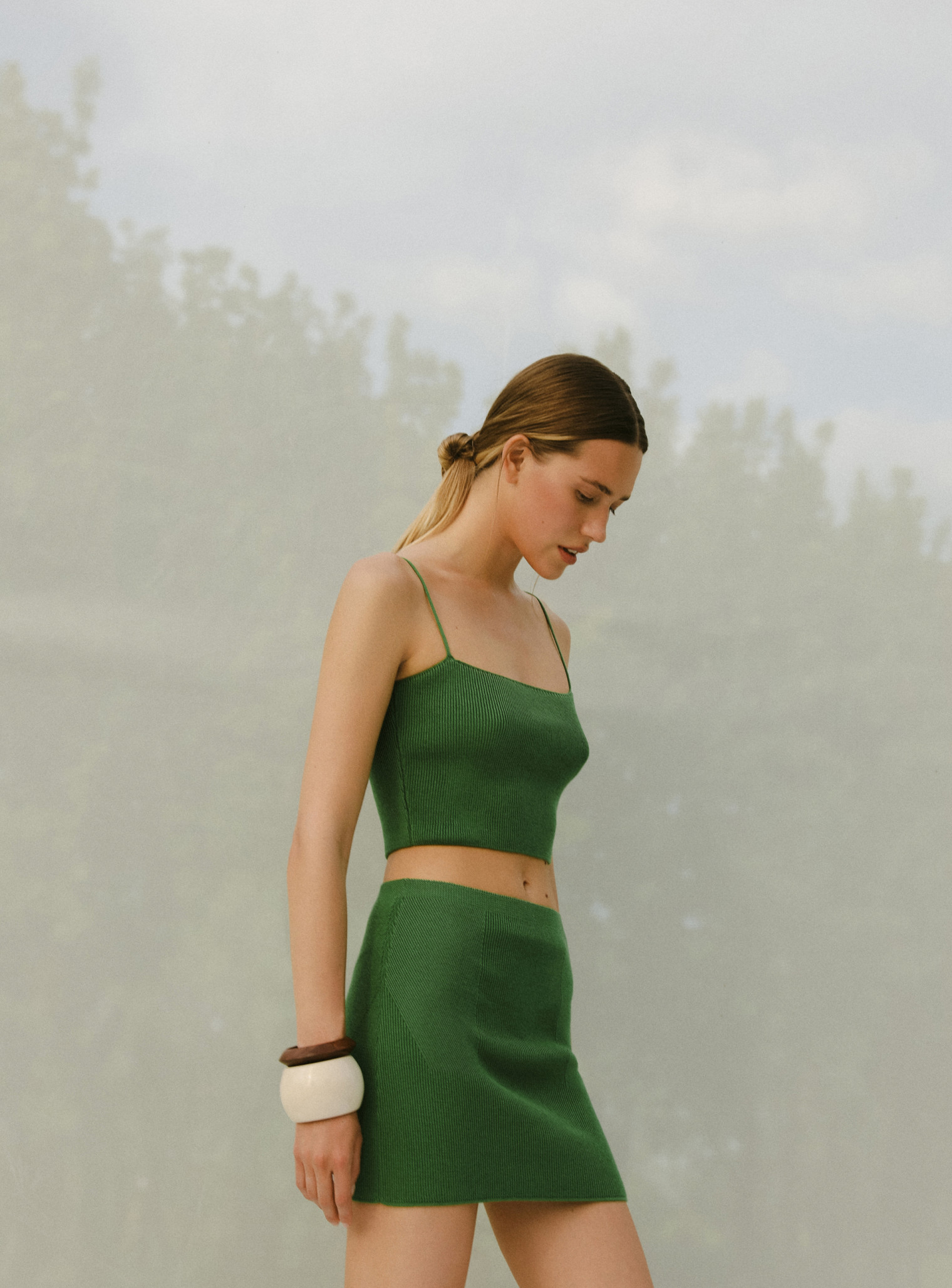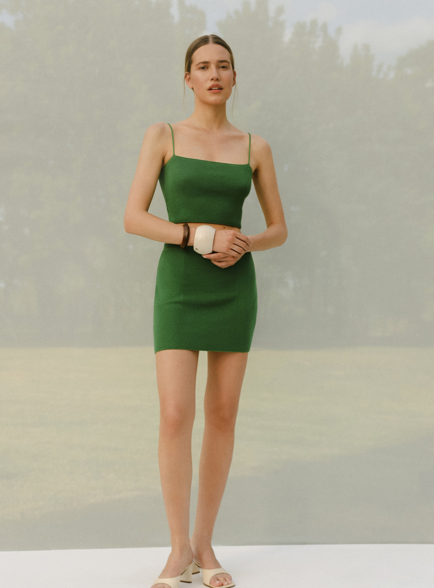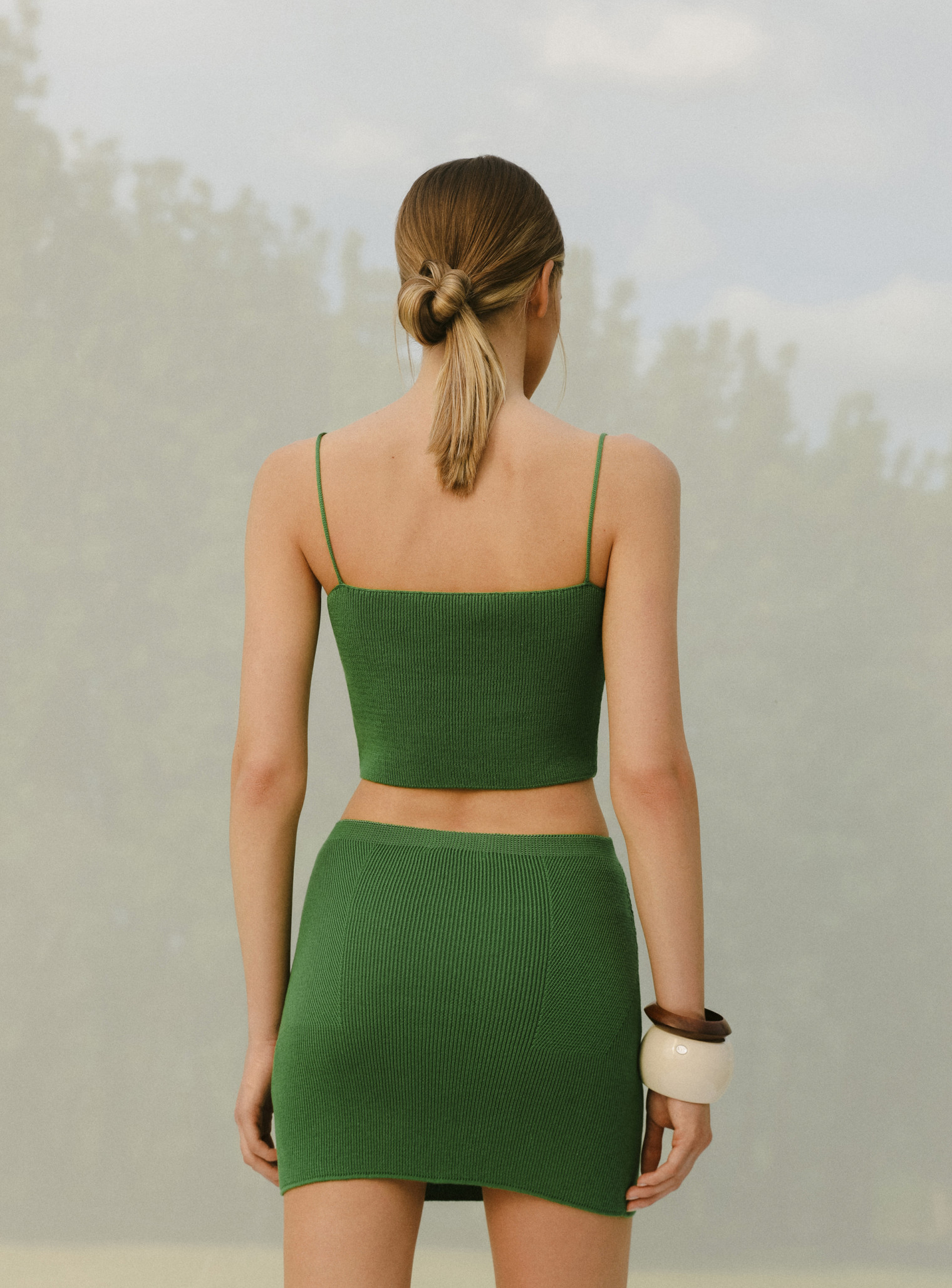 Базовый комплект из топа бандо на тонких бретелях и юбки с рисунком имитацией баски выполнен из фактурной вязки, хорошо тянущейся и облегающей силуэт, подчеркивая линии фигуры. Стильный образ, который освежит ваш летний гардероб благодаря яркой цветовой гамме. Идеальная формула комплекта для повседневной жизни, которую вы можете носить вместе и отдельно, сочетая с любимыми изделиями.