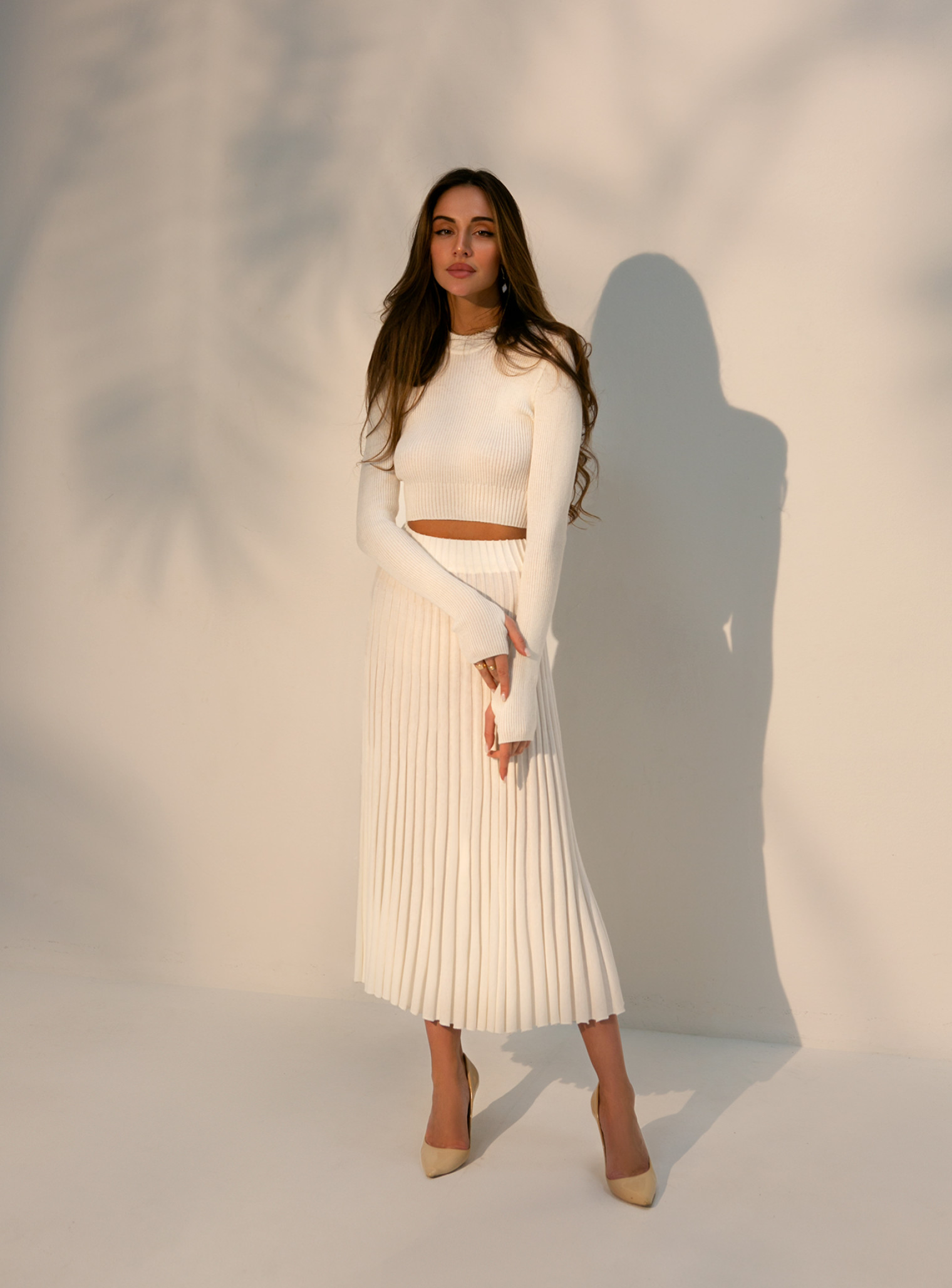 Костюм из хлопкового кроп-топа и юбки-гофре макси молоко