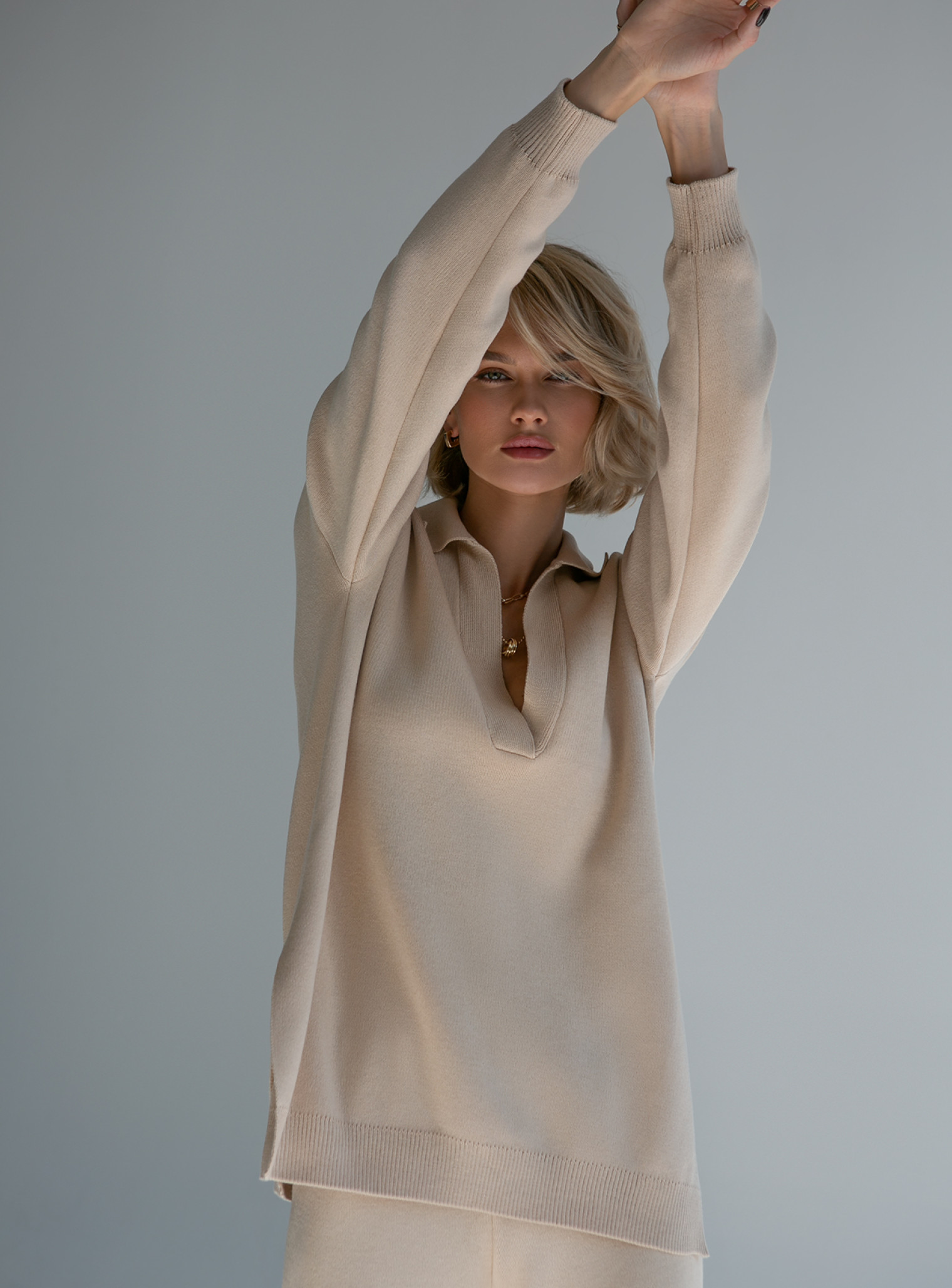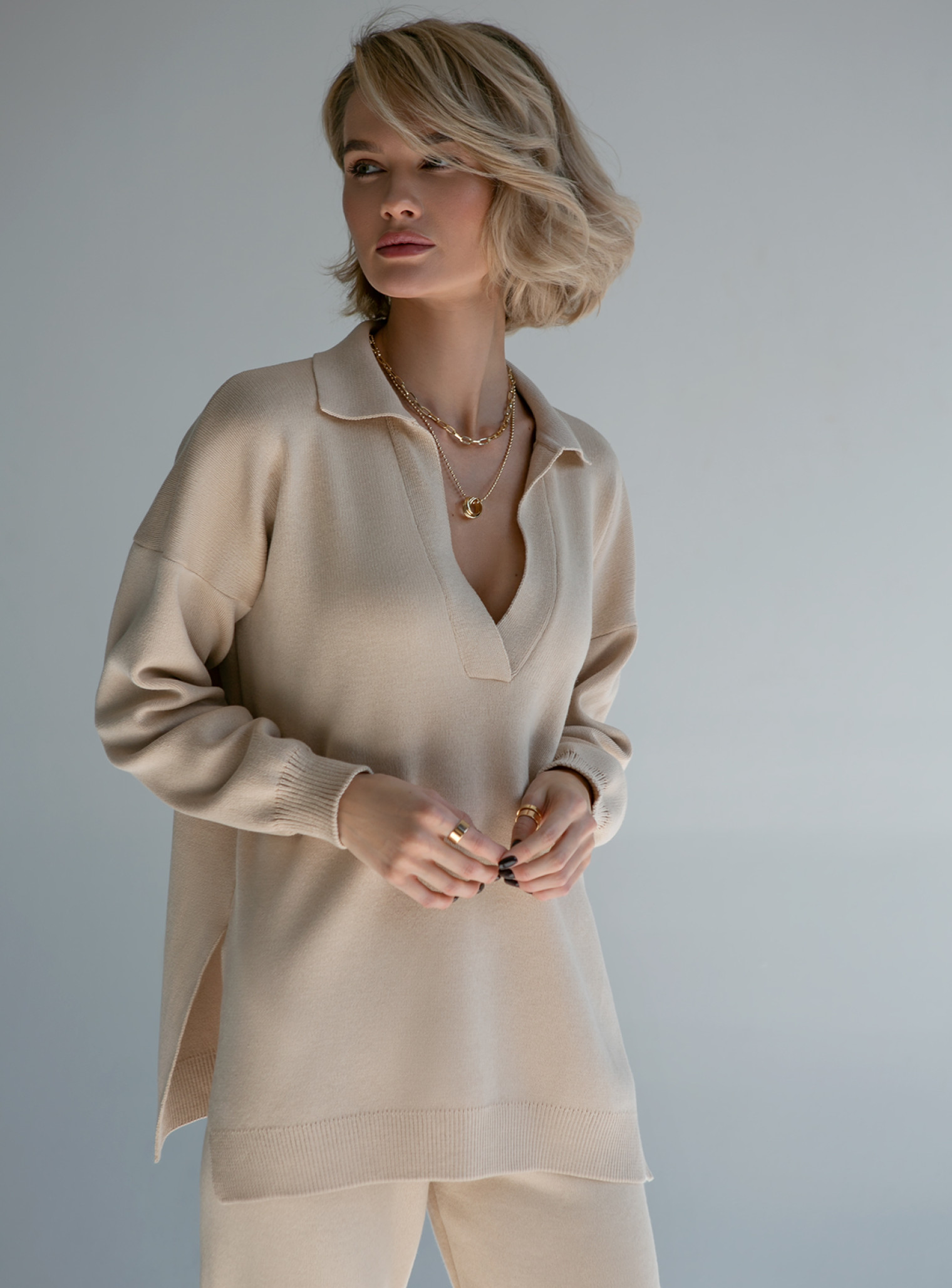Костюм джемпер поло свободного кроя с брюками прямыми из плотного джерси крем