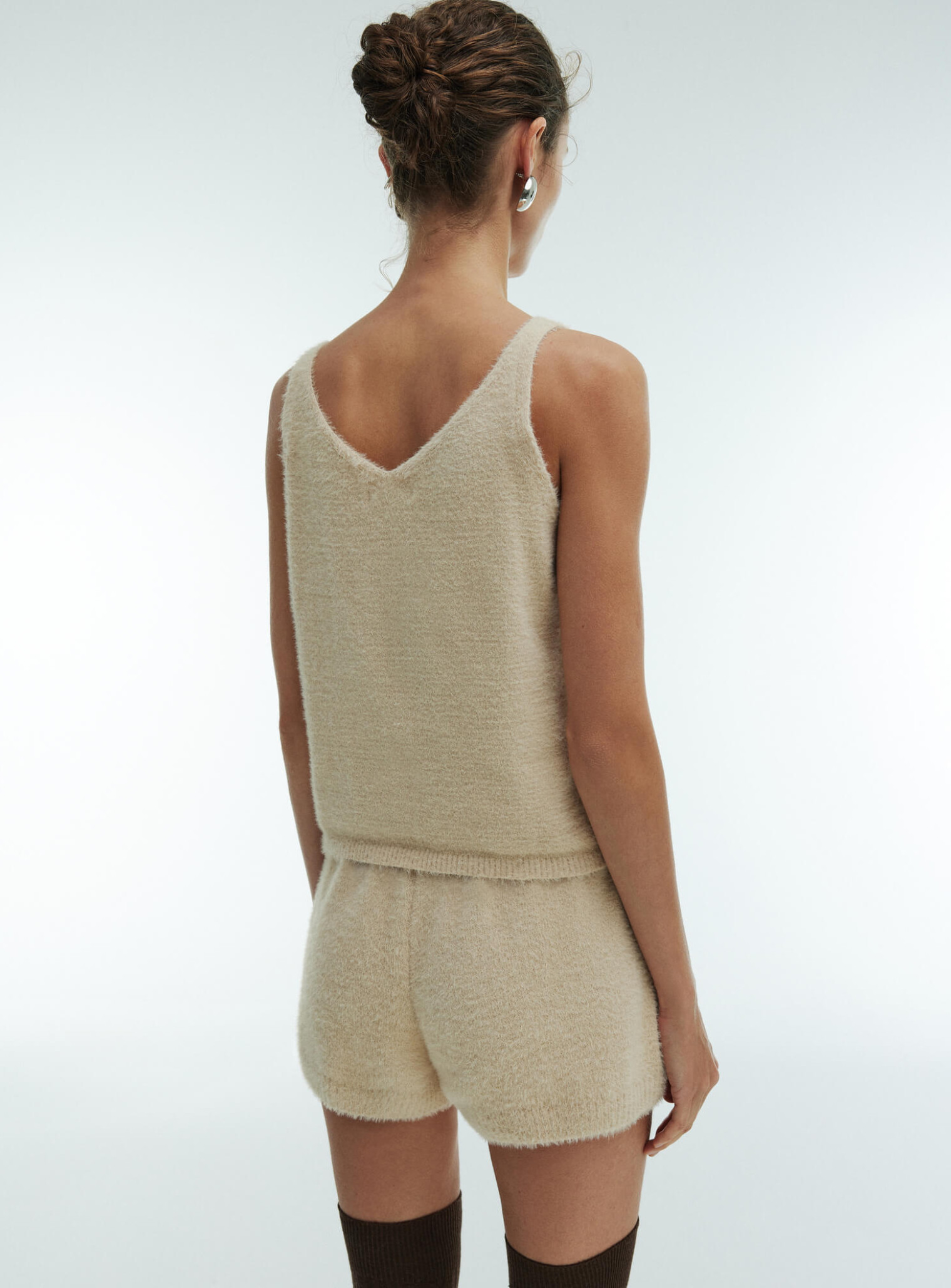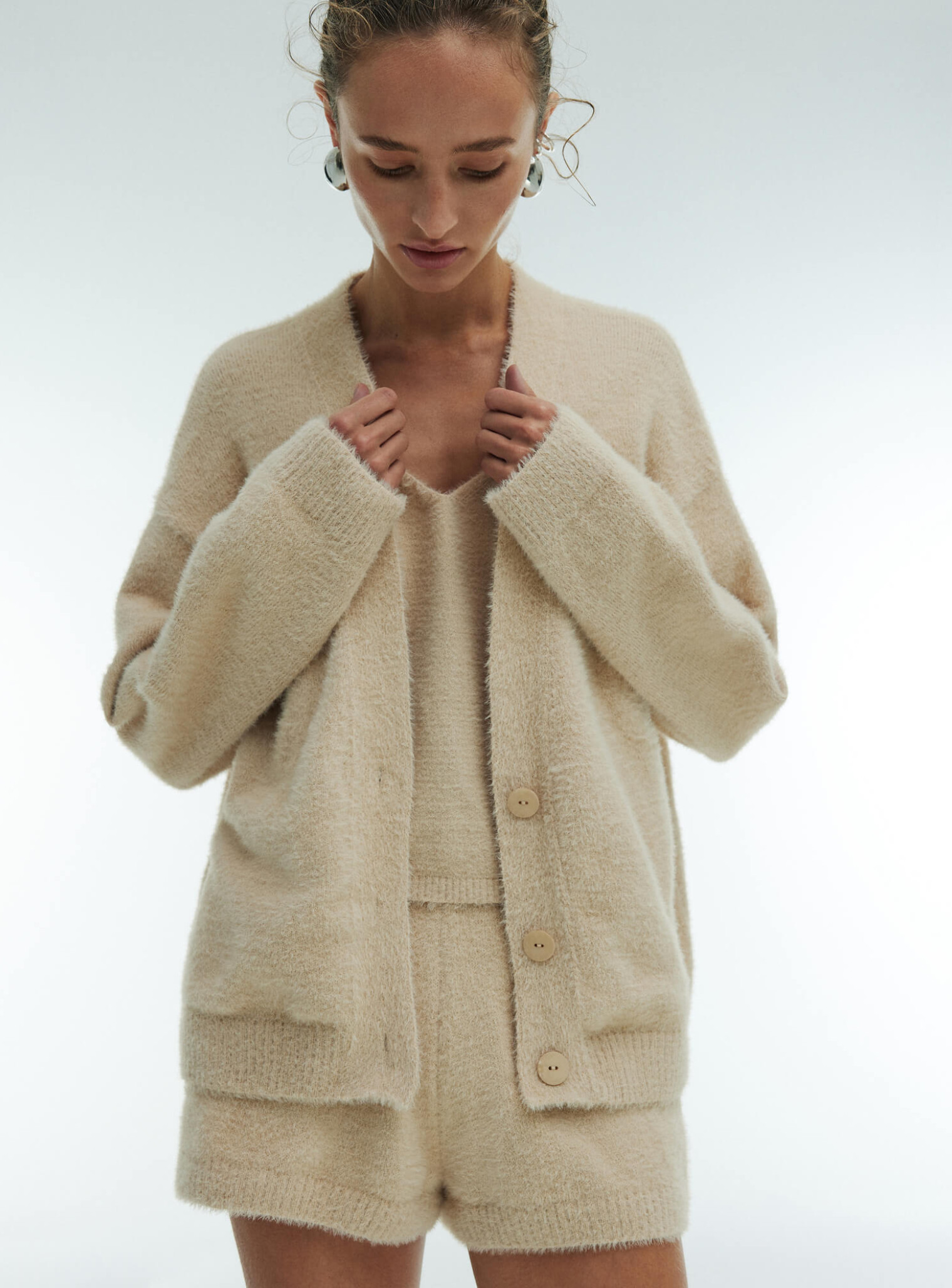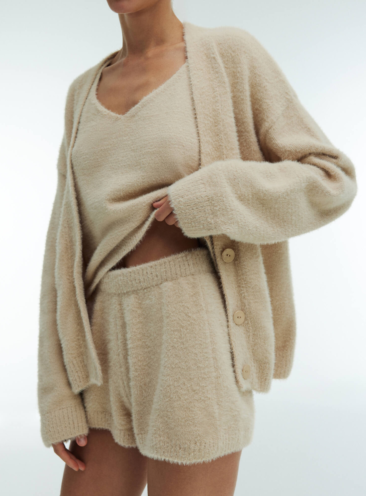 Костюм Хоум – лаконичная и стильная модель для повседневного образа. Комплект, состоящий из шорт, кардигана и майки, выполнен из качественной мягкой и пушистой пряжи. Дизайн модели продуман до мелочей. Благодаря отсутствию фурнитуры в таком костюме вам будет удобно смотреть любимый фильм, прогуливаться в парке, заниматься домашними делами. Теплый и уютный, изготовленный в свободном стиле, он идеально подходит для отдыха с семьей или друзьями. Все элементы костюма хорошо сочетаются с другой одеждой.