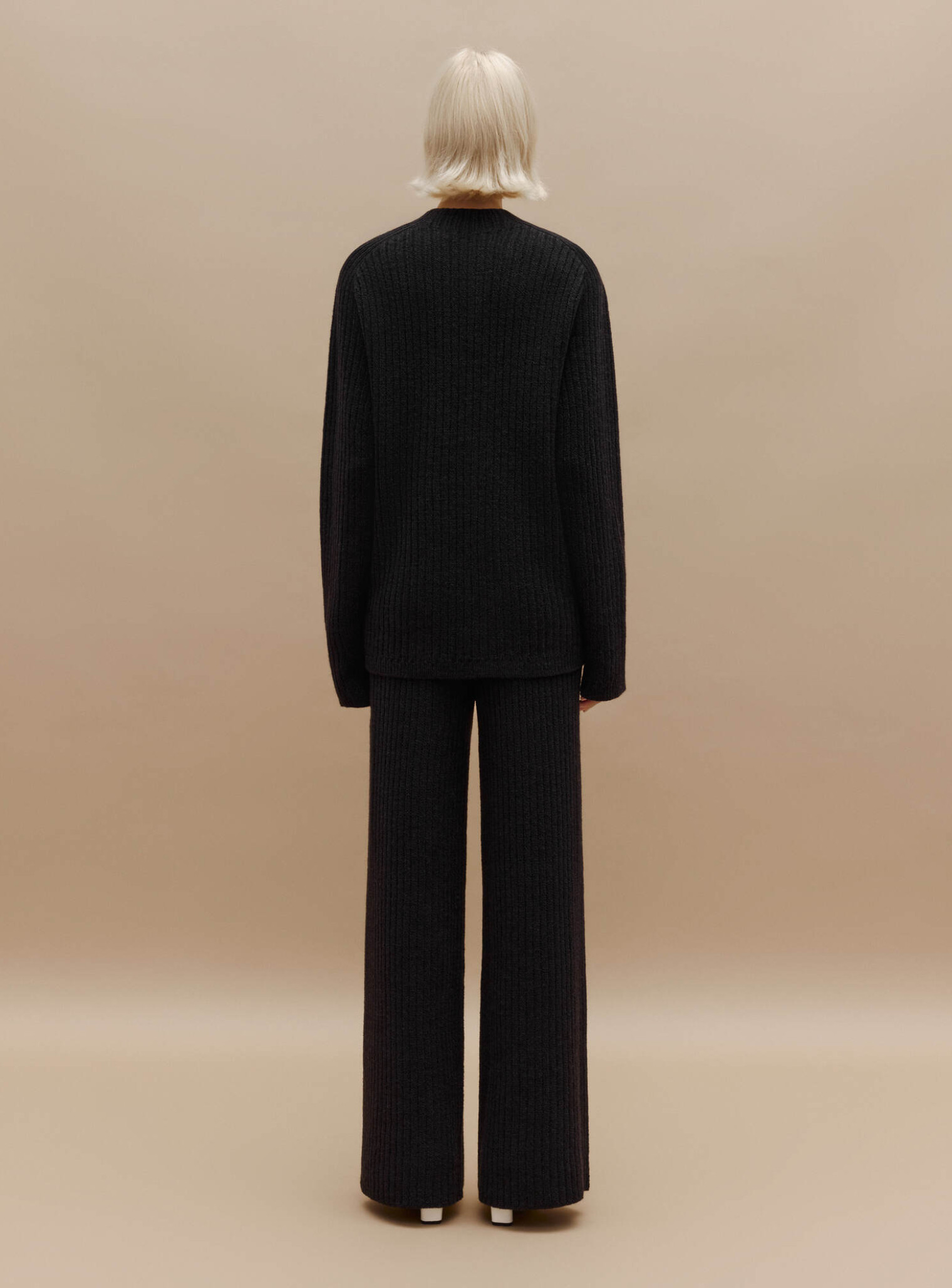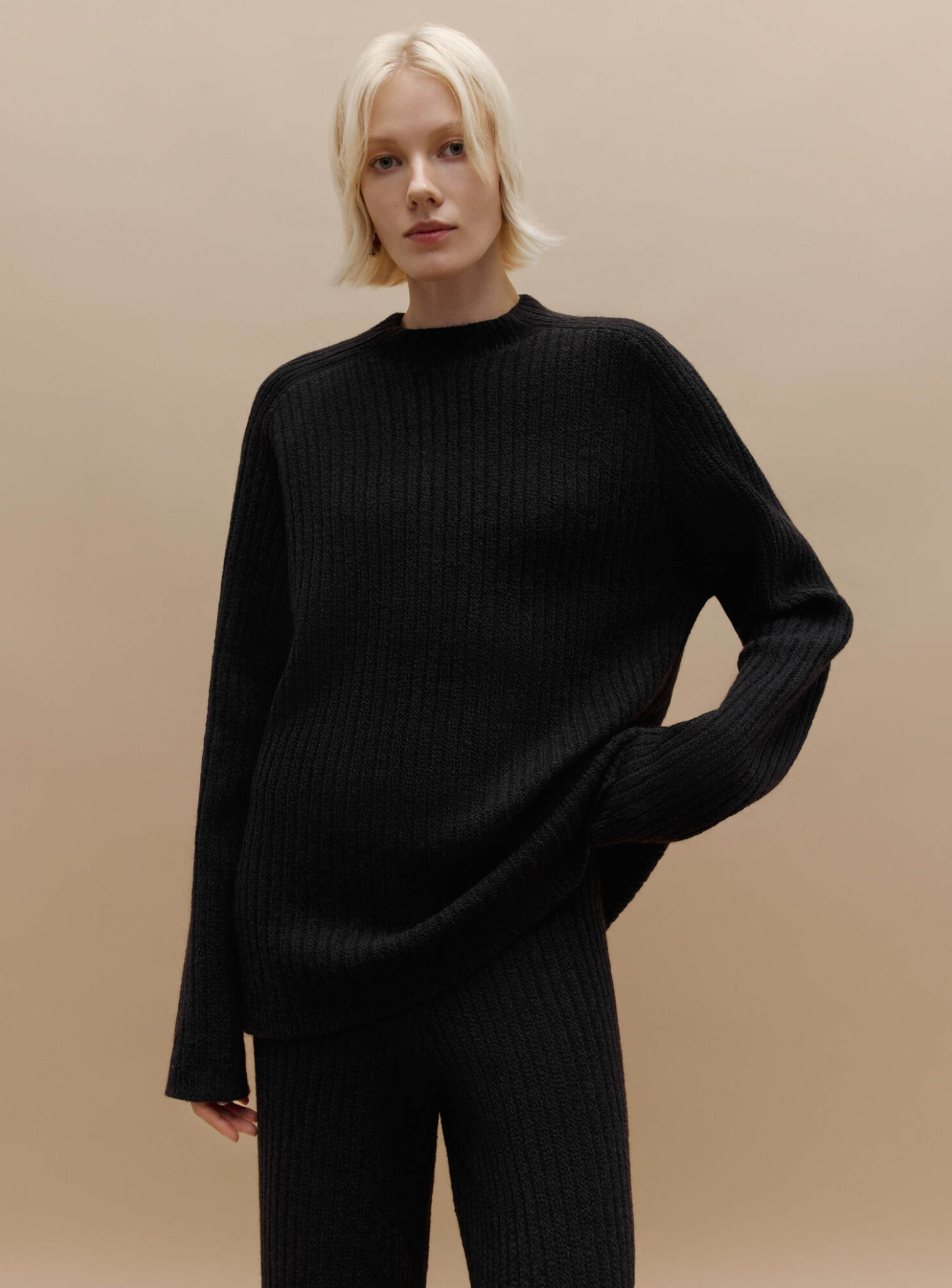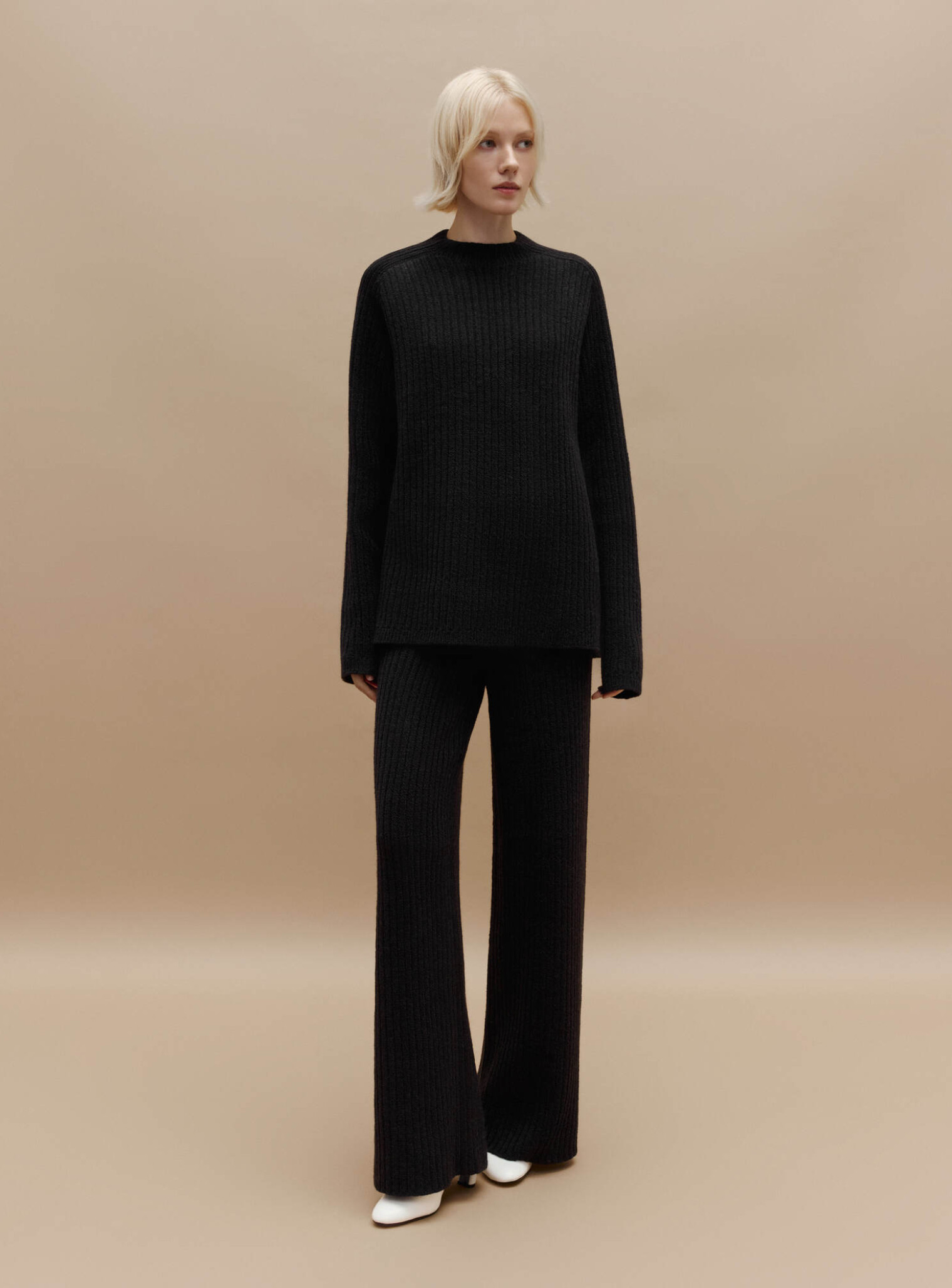 Костюм из свитера и брюк в рубчик, выполненный из теплой пряжи с добавлением шерсти. Свитер имеет мягкую линию плеча, удлиненный рукав и силуэт, отделанные вставкой из декоративной резинки. Брюки прямого кроя с высокой посадкой и мягкой резинкой на талии. Удобный и теплый комплект для холодного сезона.