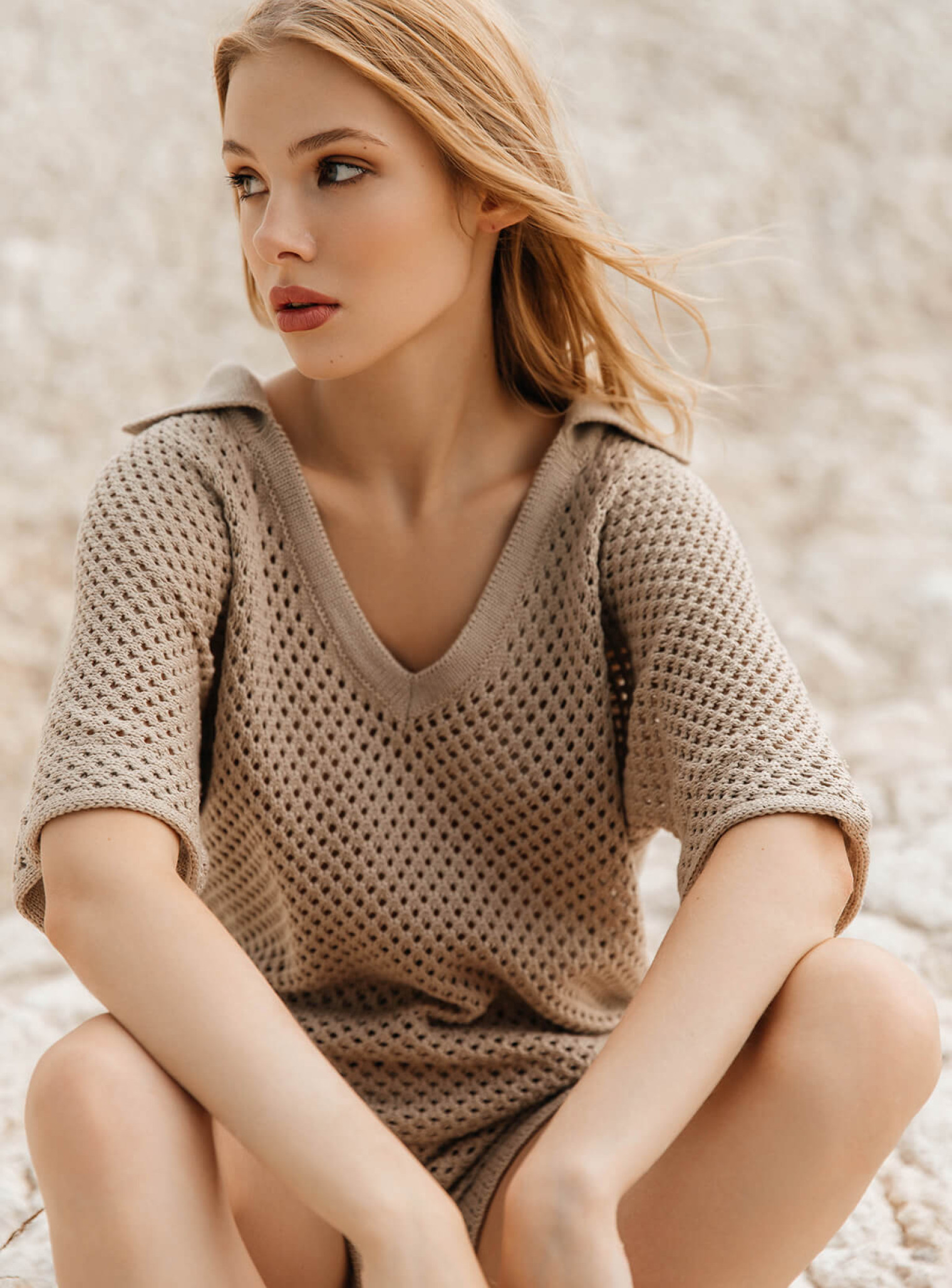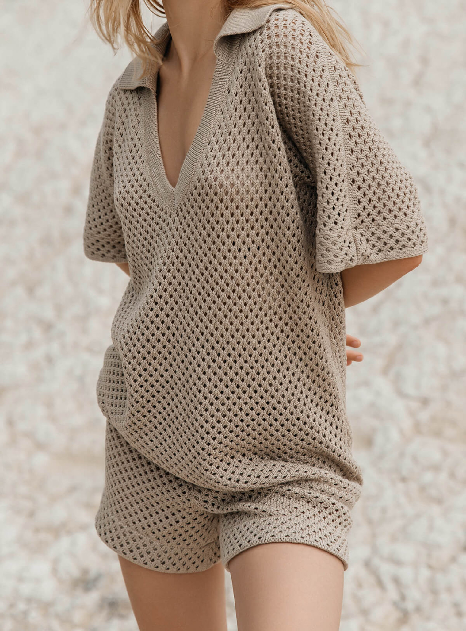 Оригинальный летний трикотажный костюм двойка, который состоит из джемпера свободного кроя с глубоким вырезом и коротких шортиков. Ажурная вязка напоминает кружево, а оттенок — словно воздушная пенка на капучино. Этот костюм идеален, если надо получить нежный и романтичный образ.