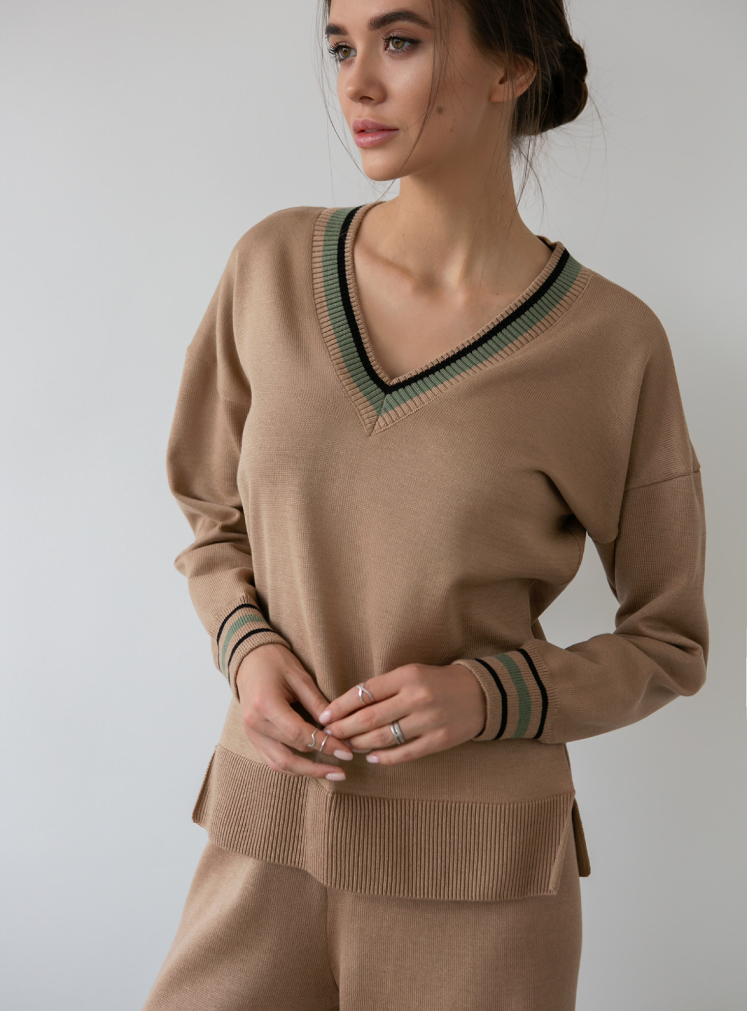 Красивый элегантный трикотажный костюм с широкими штанами хорошо согревает в прохладную погоду. Глубокий узкий вырез зрительно удлиняет силуэт. Классический крой выгодно подчеркивает плюсы фигуры и маскирует недостатки. Натуральные волокна приятны к телу, не электризуются, не скатываются. Манжеты и край выреза обрамлены узкой резинкой с полосками черного и оливкового цветов. Благодаря этому детали костюма еще легче можно комбинировать с другими вещами, создавая базу для капсульного гардероба.