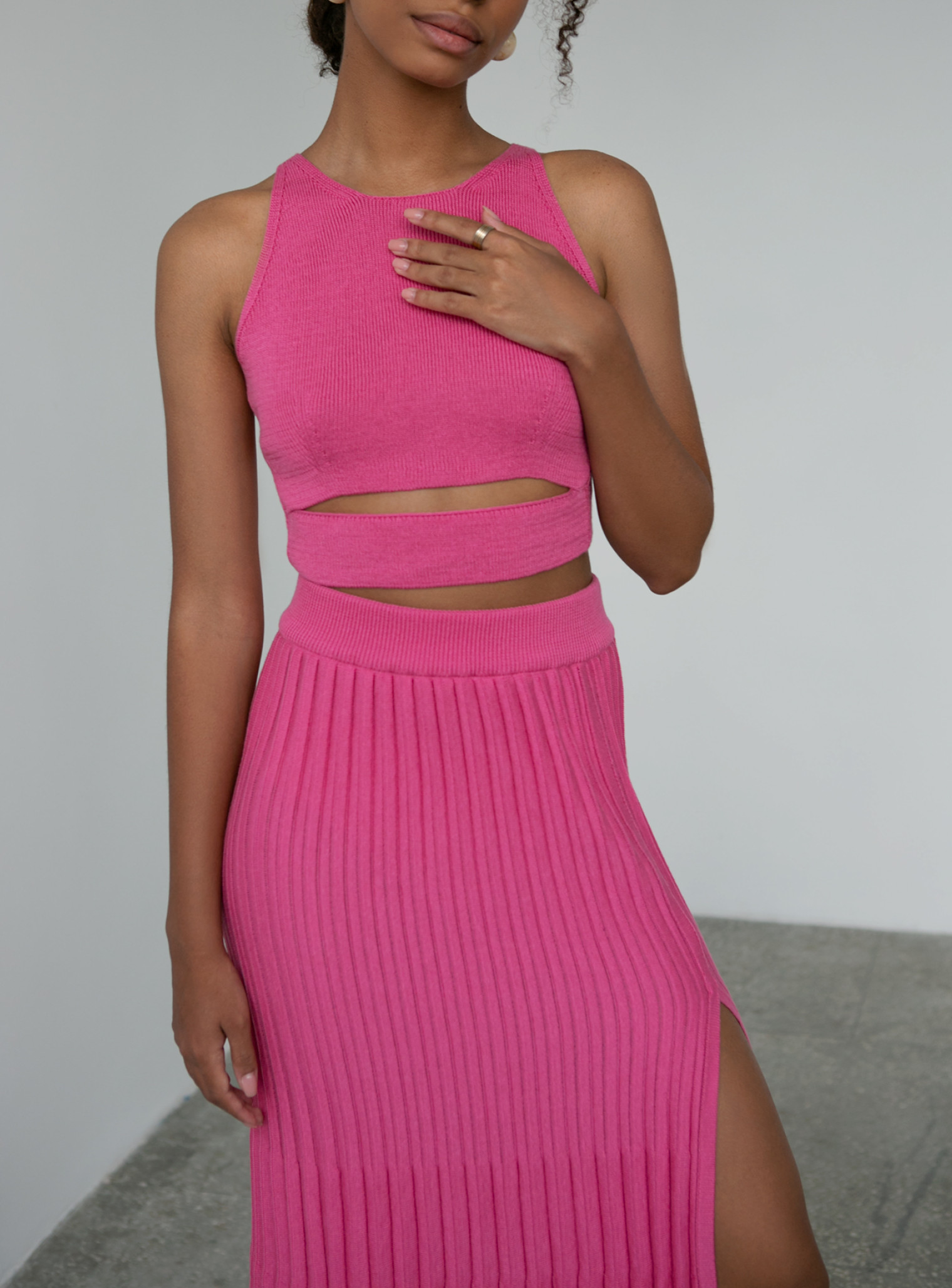 Изысканный трикотажный комплект. Внимание на изящной линии плеч акцентирует открытый топ, а длинная плиссированная юбка макси с разрезом добавляет образу яркости и сексуальности.