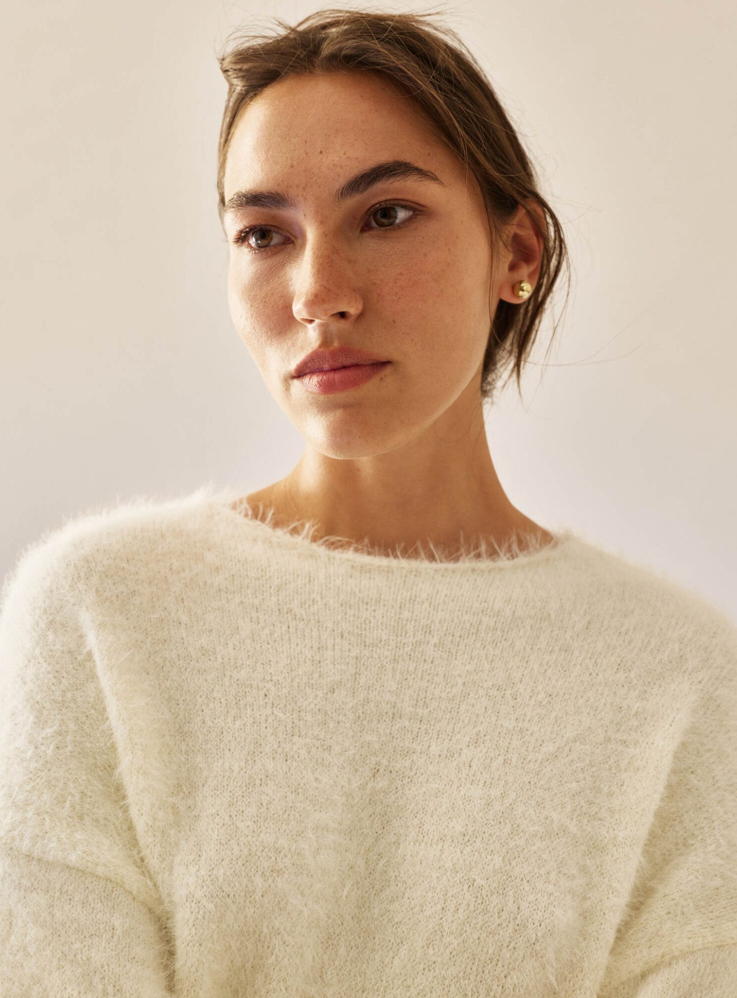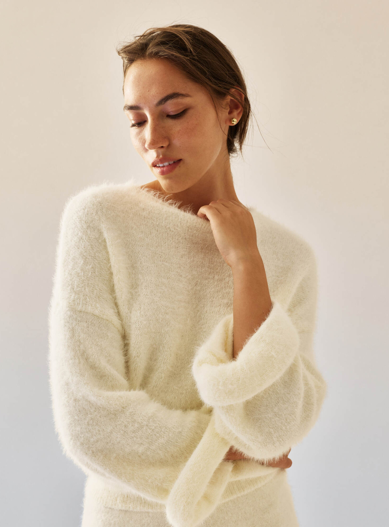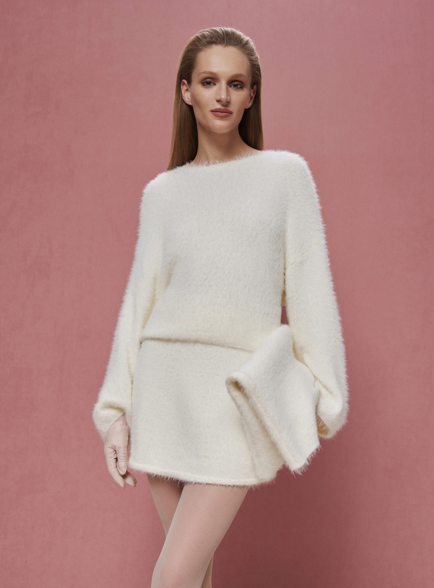 Джемпер и юбка мини из пушистой пряжи с длинным ворсом, что придает праздничности и легкости образу. Джемпер оверсайз имеет опущенную линию плеча, широкие удлиненные рукава и вырез челнок. Юбка, слегка расширенная вниз, имеет широкую комфортную резинку, позволяющую менять посадку и носить юбку на талии или на бедрах. Тонкий и деликатный переплет создает воздушный романтический образ для ваших особых событий.