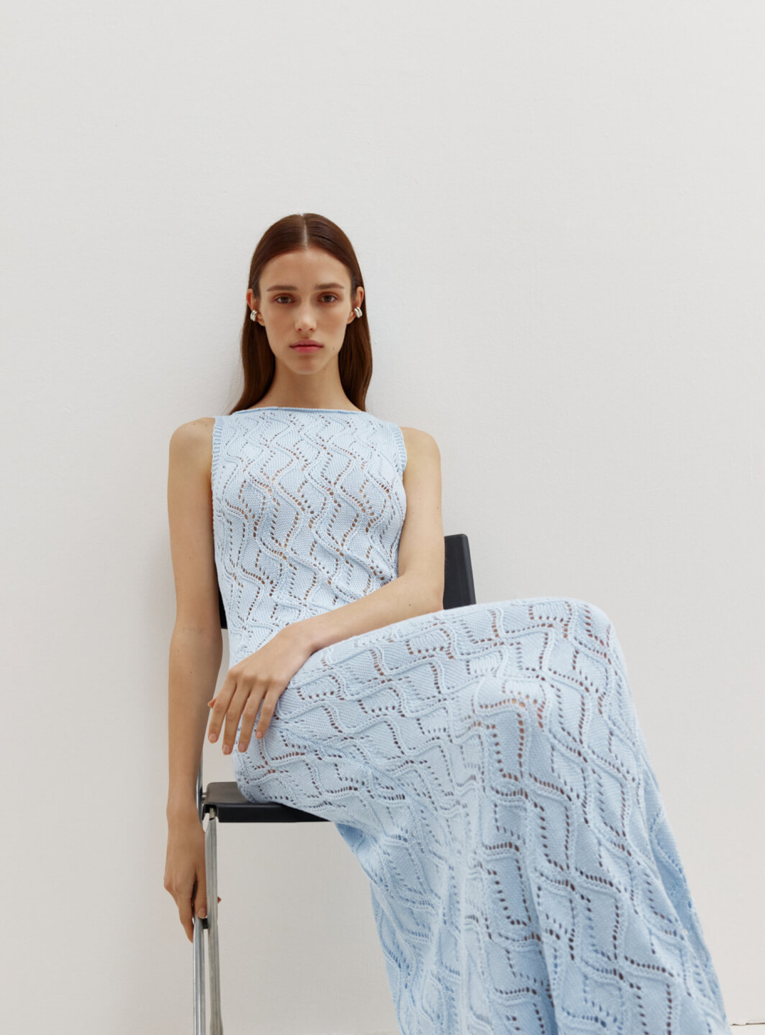 Изысканное силуэтное платье макси, расширяющееся до подола, без рукавов с горизонтальным вырезом. Выполнено из деликатного хлопка с ажурным узором, который образует плавные линии и вытягивает силуэт. Платье представленное в светлых оттенках, может просвечиваться на груди, поэтому рекомендуем подбирать телесное белье. Изящный образ для особых событий и моментов.
