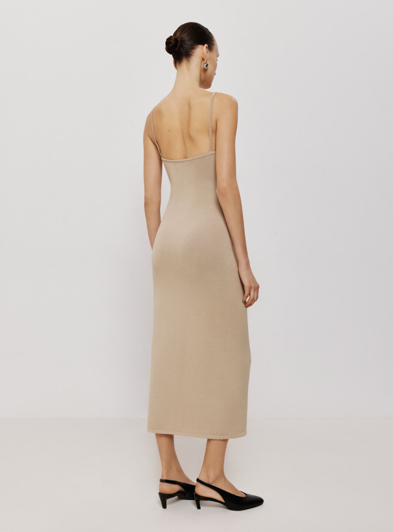 Силуэтное платье в длине миди выполнено из деликатной вискозы. Средняя плотность плетения не просвечивается на фигуре, но в зависимости от параметров может просвечиваться в зоне декольте. Трендовые тонкие бретели открывают ключицы и подчеркивают хрупкую красоту женщины.