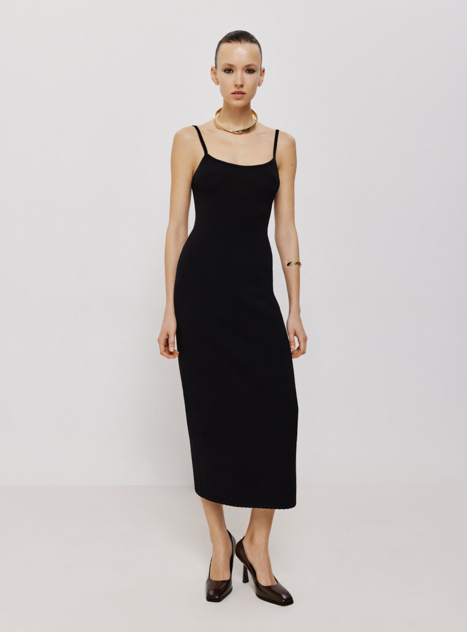 Тонкие бретели подчеркивают хрупкость женской натуры, даже если в душе вы сильная и готова к любым трудностям. А длина миди вытягивает фигуру вверх, делая вас еще более изящной.