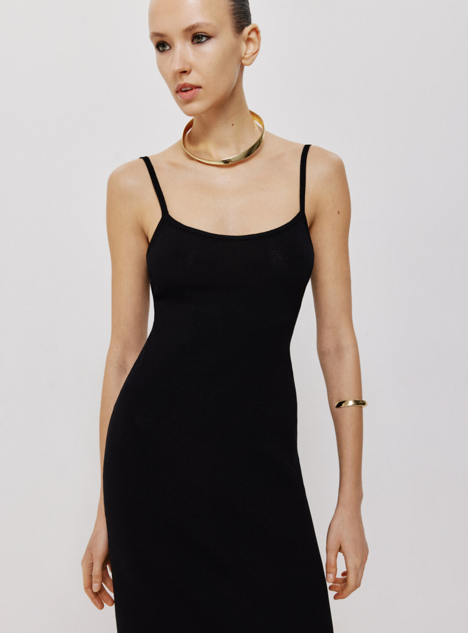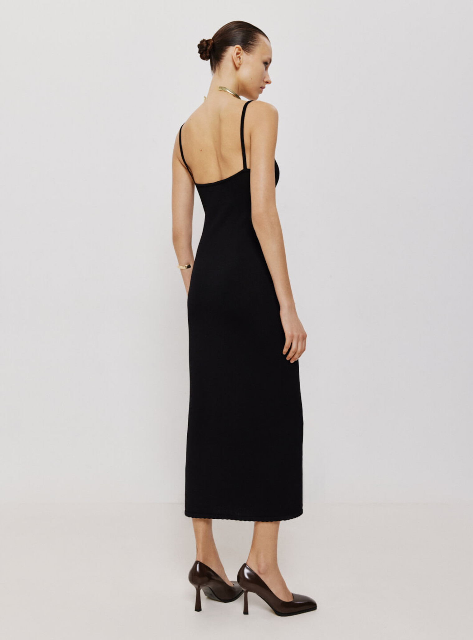 Силуэтное платье в длине миди выполнено из деликатной вискозы. Средняя плотность плетения не просвечивается на фигуре, но в зависимости от параметров может просвечиваться в зоне декольте. Трендовые тонкие бретели открывают ключицы и подчеркивают хрупкую красоту женщины.