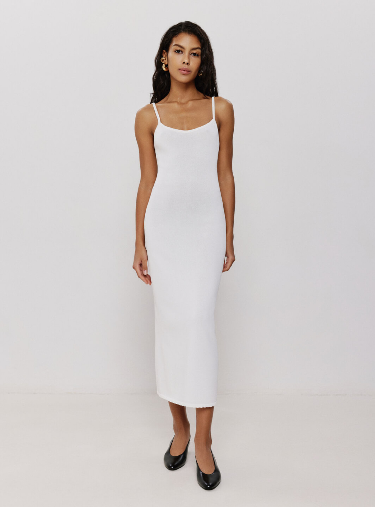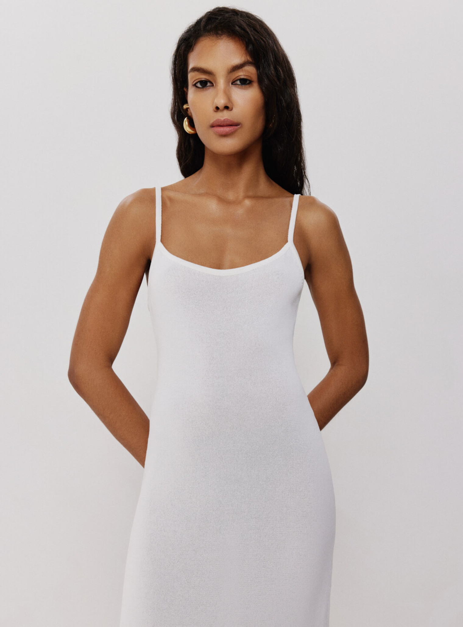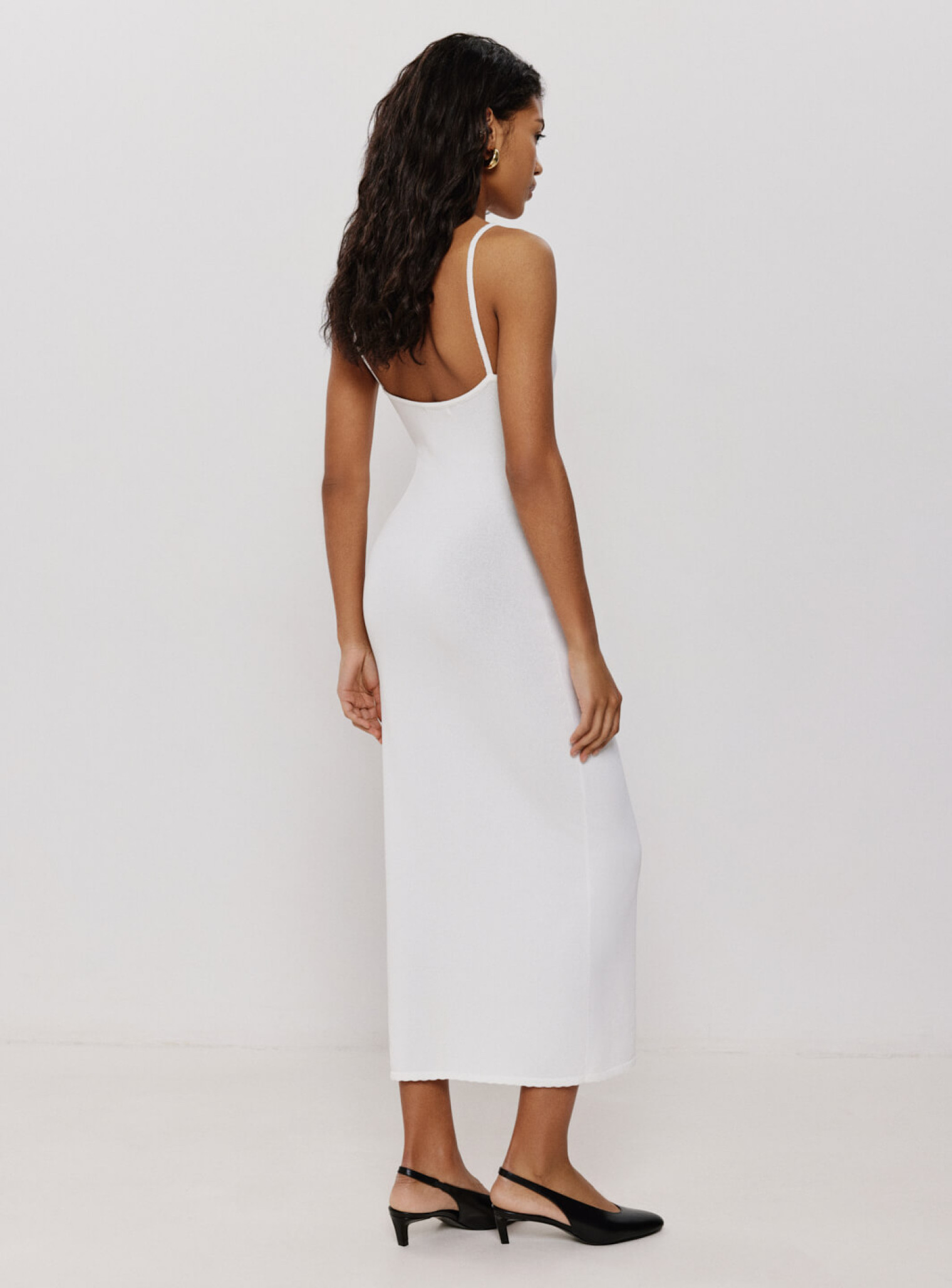 Силуэтное платье в длине миди выполнено из деликатной вискозы. Средняя плотность плетения не просвечивается на фигуре, но в зависимости от параметров может просвечиваться в зоне декольте. Трендовые тонкие бретели открывают ключицы и подчеркивают хрупкую красоту женщины.