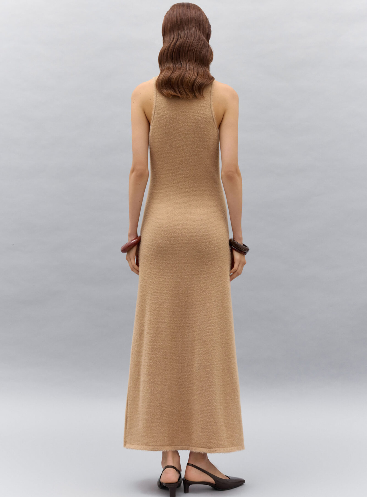 Платье в длине макси изготовлено из мягкой и нежной пушистой пряжи. Модель лаконичного кроя с закрытой горловиной, где акцентом становятся открытые плечи и глубокая пройма. Платье имеет прямой, слегка приталенный силуэт, сохраняющий баланс между уютом и нотами обольстительности, которую навевают обнаженные ключицы. Сочетается с кардиганами бестселлерами бренда из пушистой пряжи.