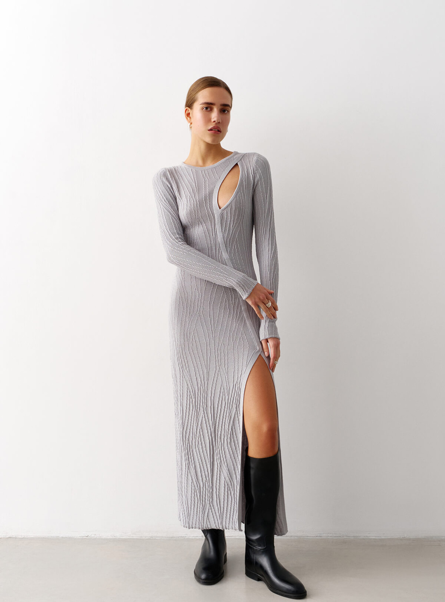 Платье миди с фигурными вырезами серое