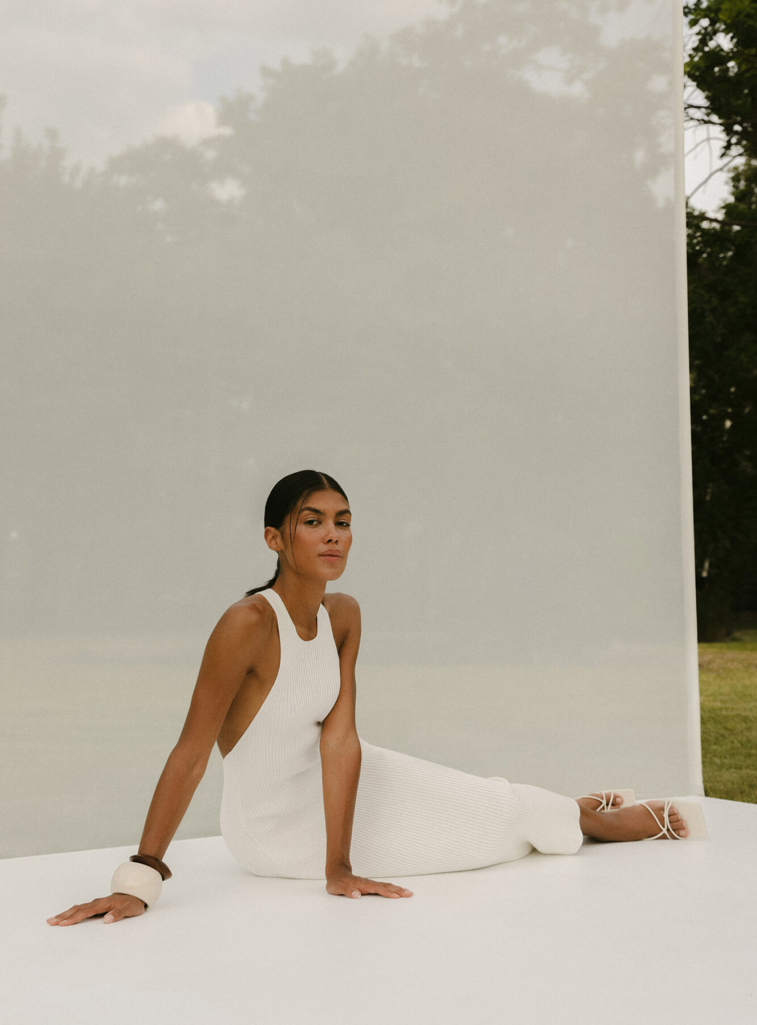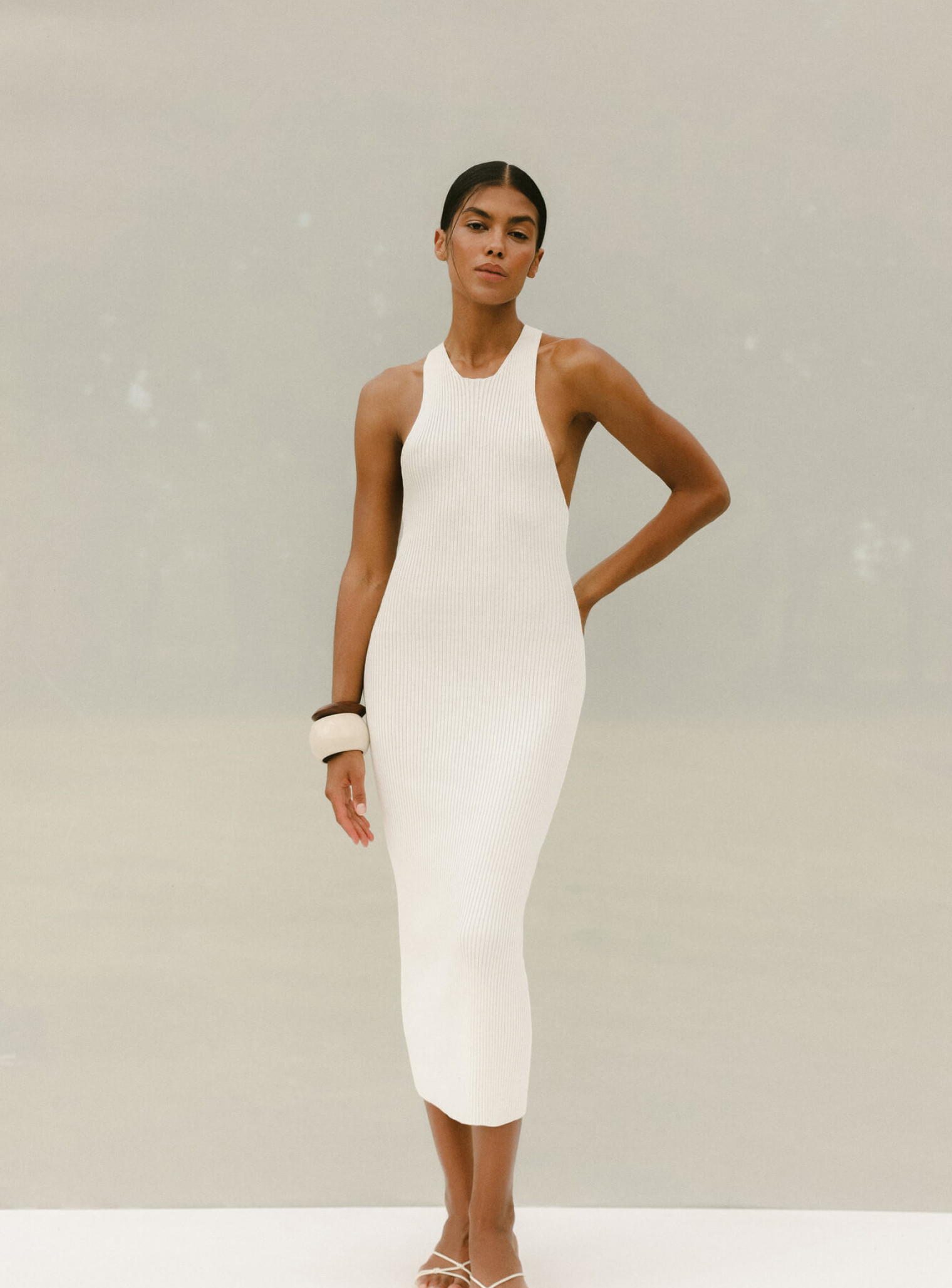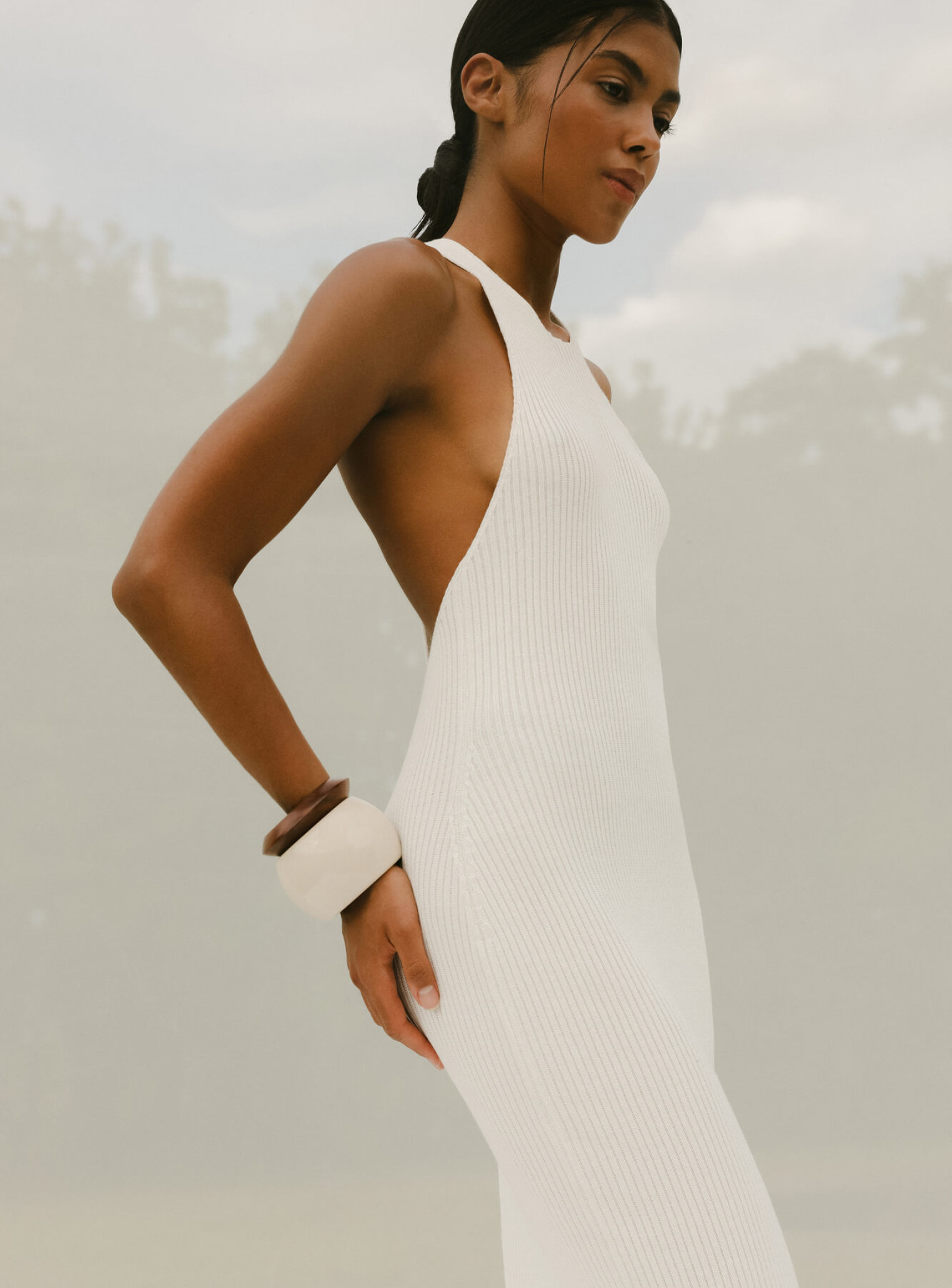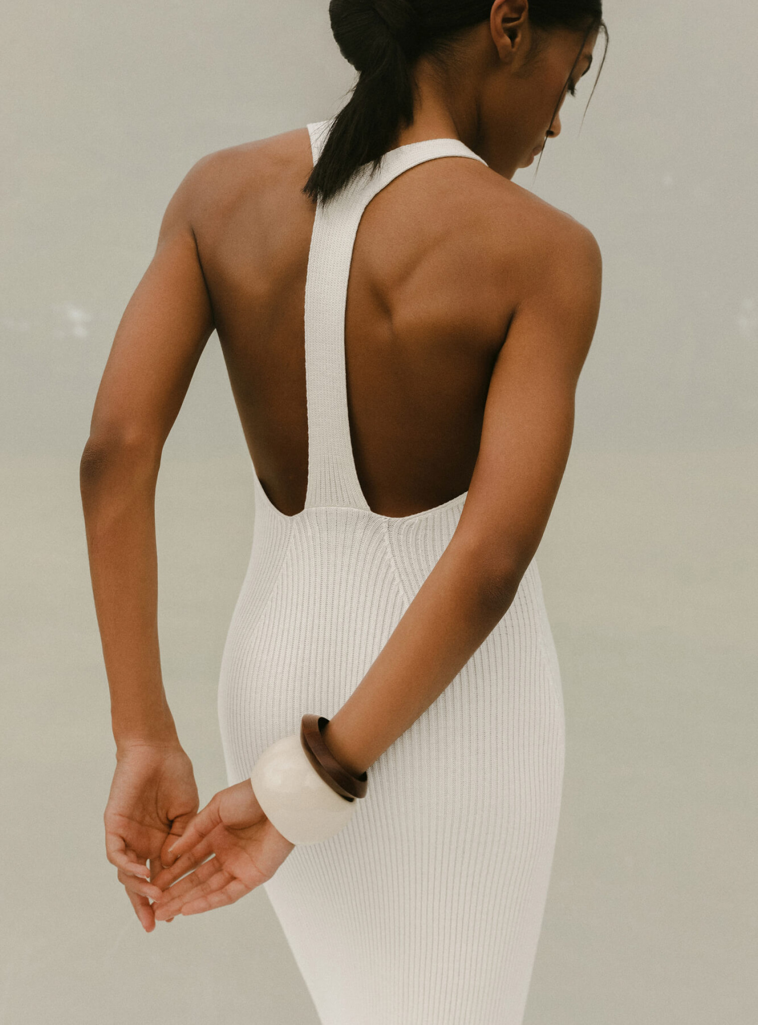 Платье миди с эффектными бретелями, проходящими по центру спины, обнажая плечи. Выполнено из фактурной вязки в хорошо тянущуюся резинку, которая облегает силуэт, подчеркивая линии фигуры. Натуральный хлопок подарит легкость и комфорт в жаркие дни и дополнит гардероб яркими цветами.