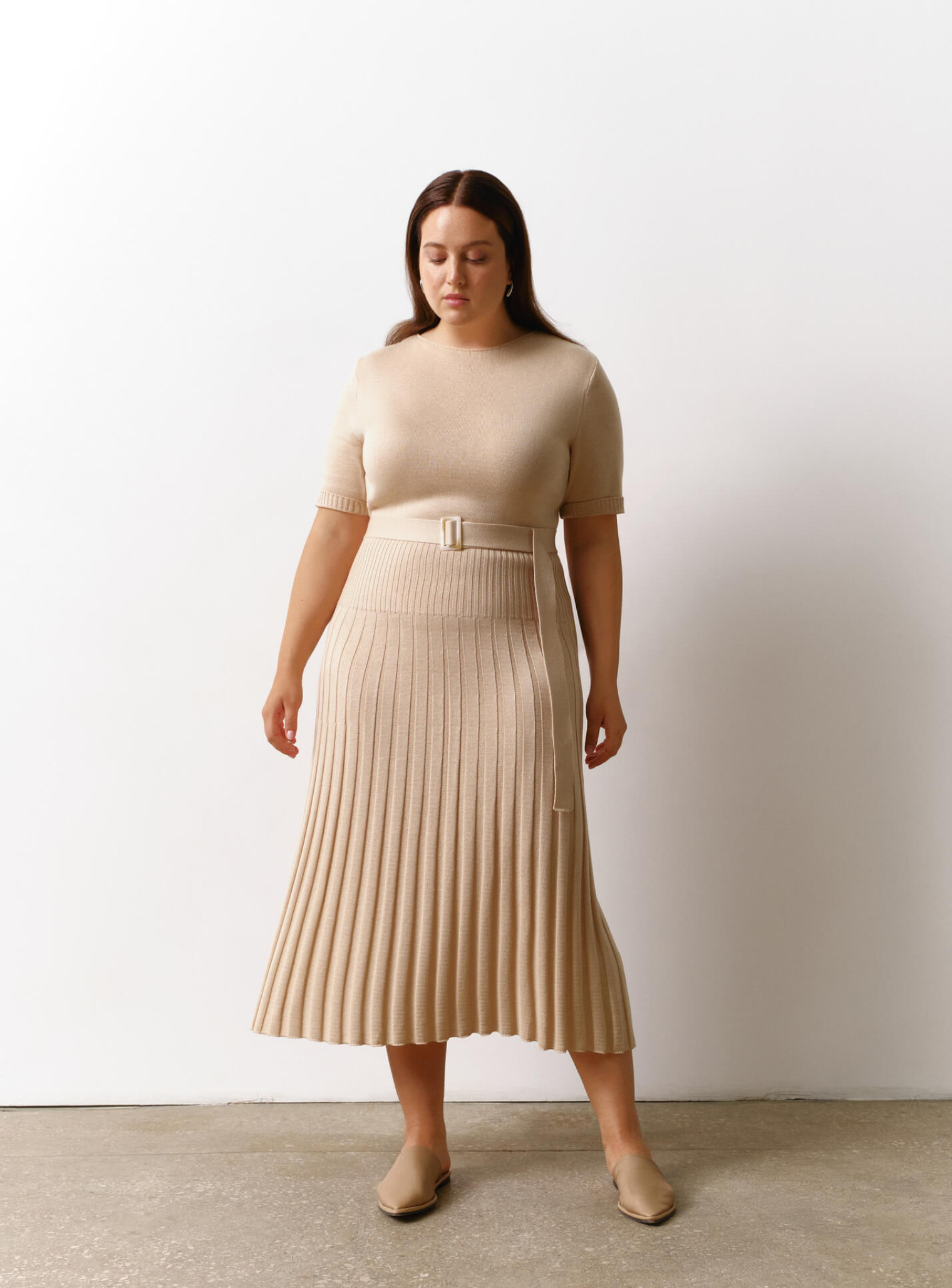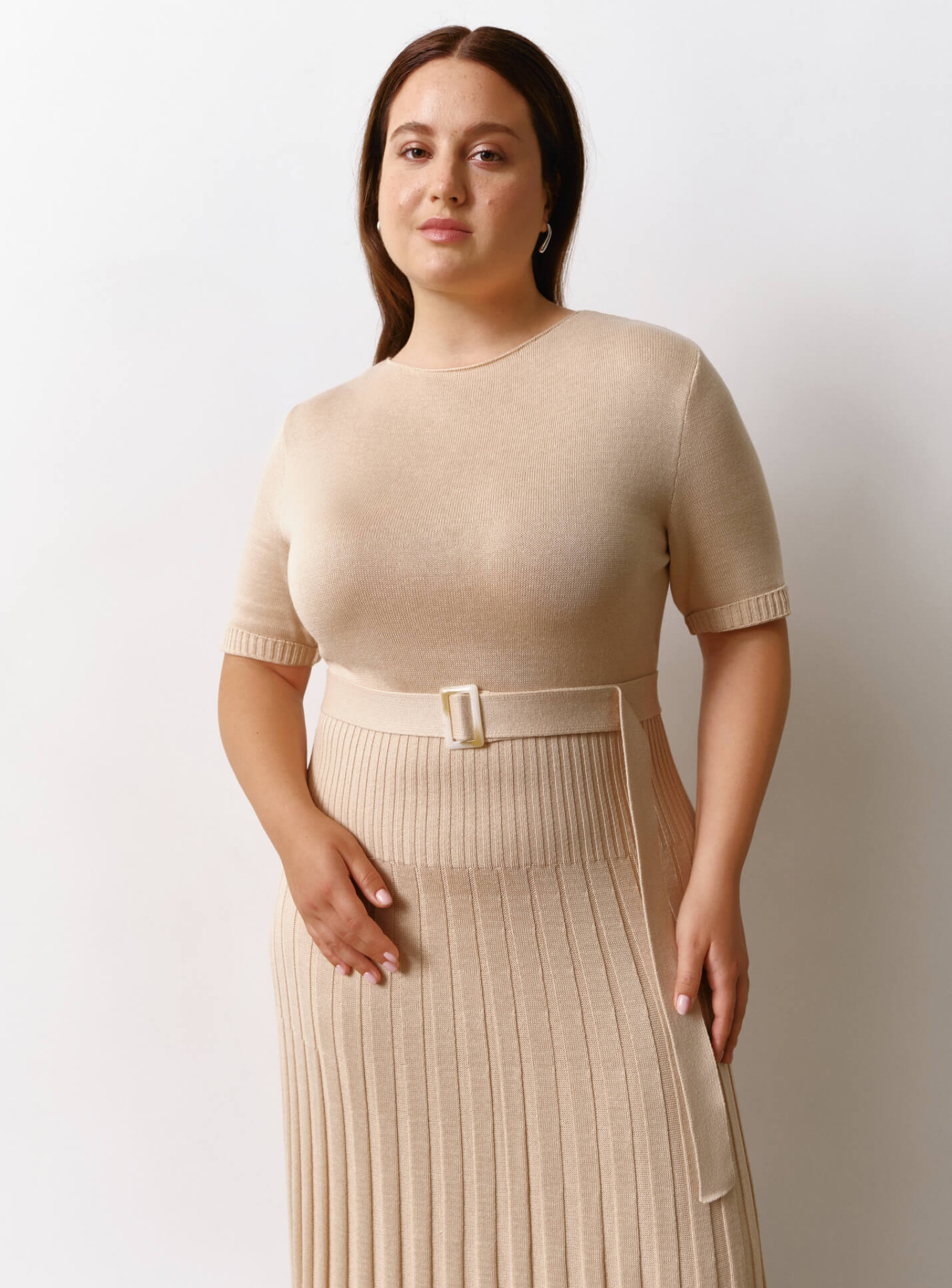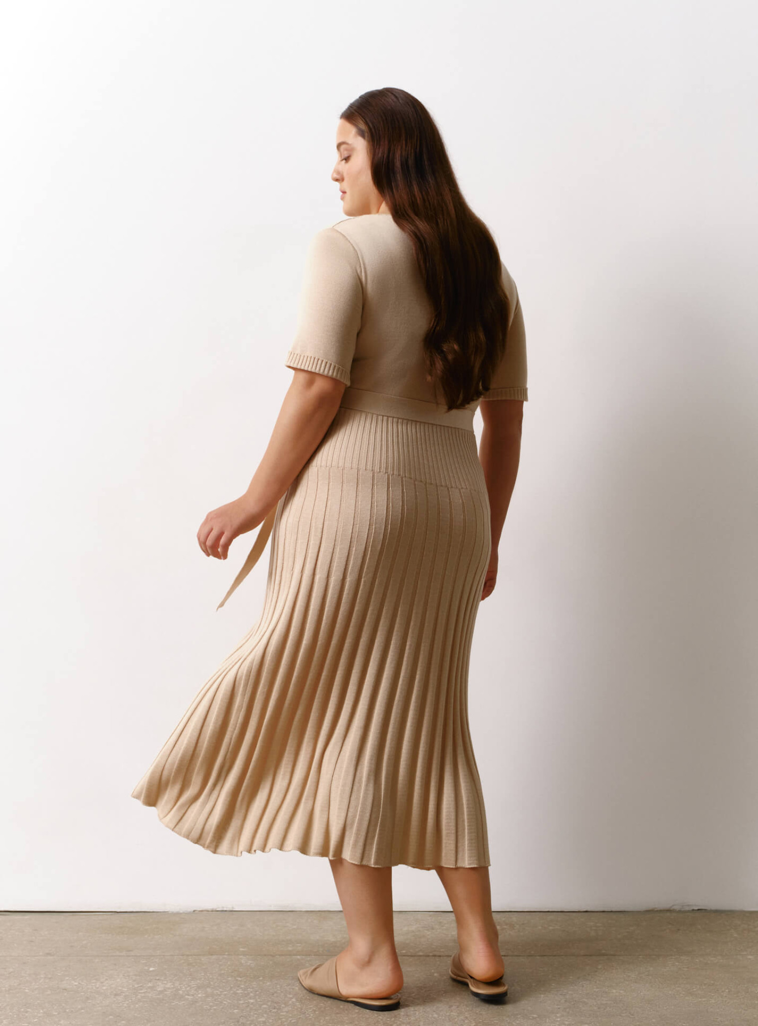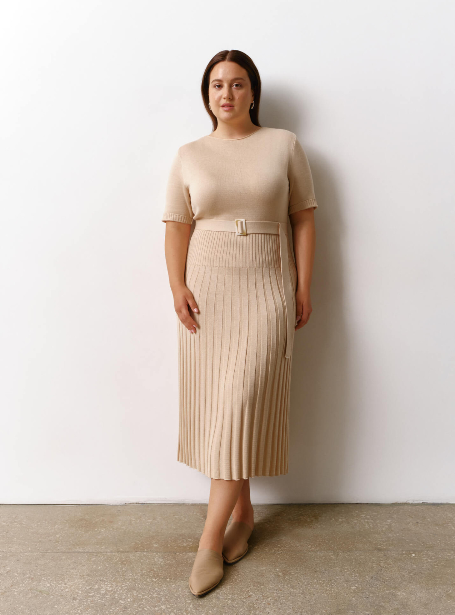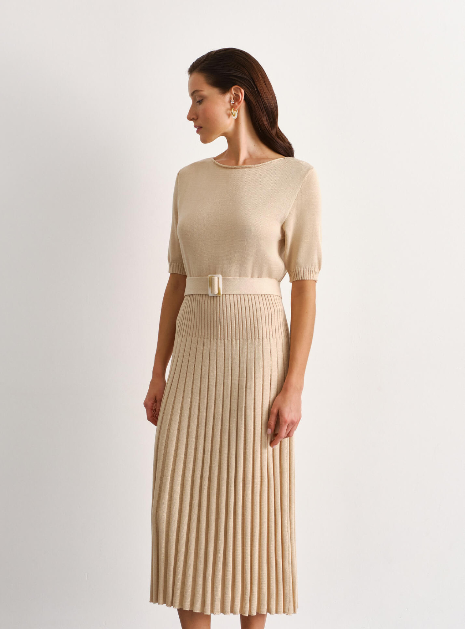 Платье миди с юбкой гофре крем