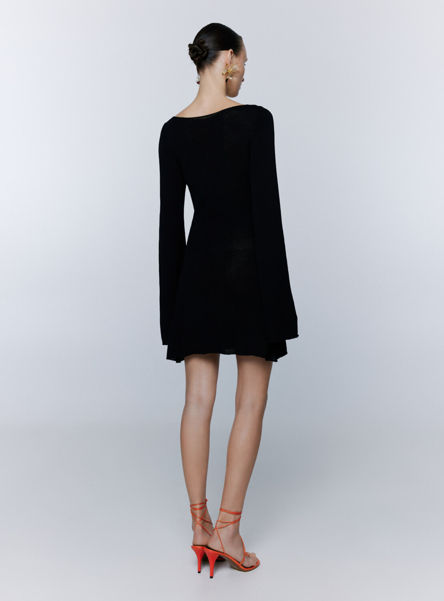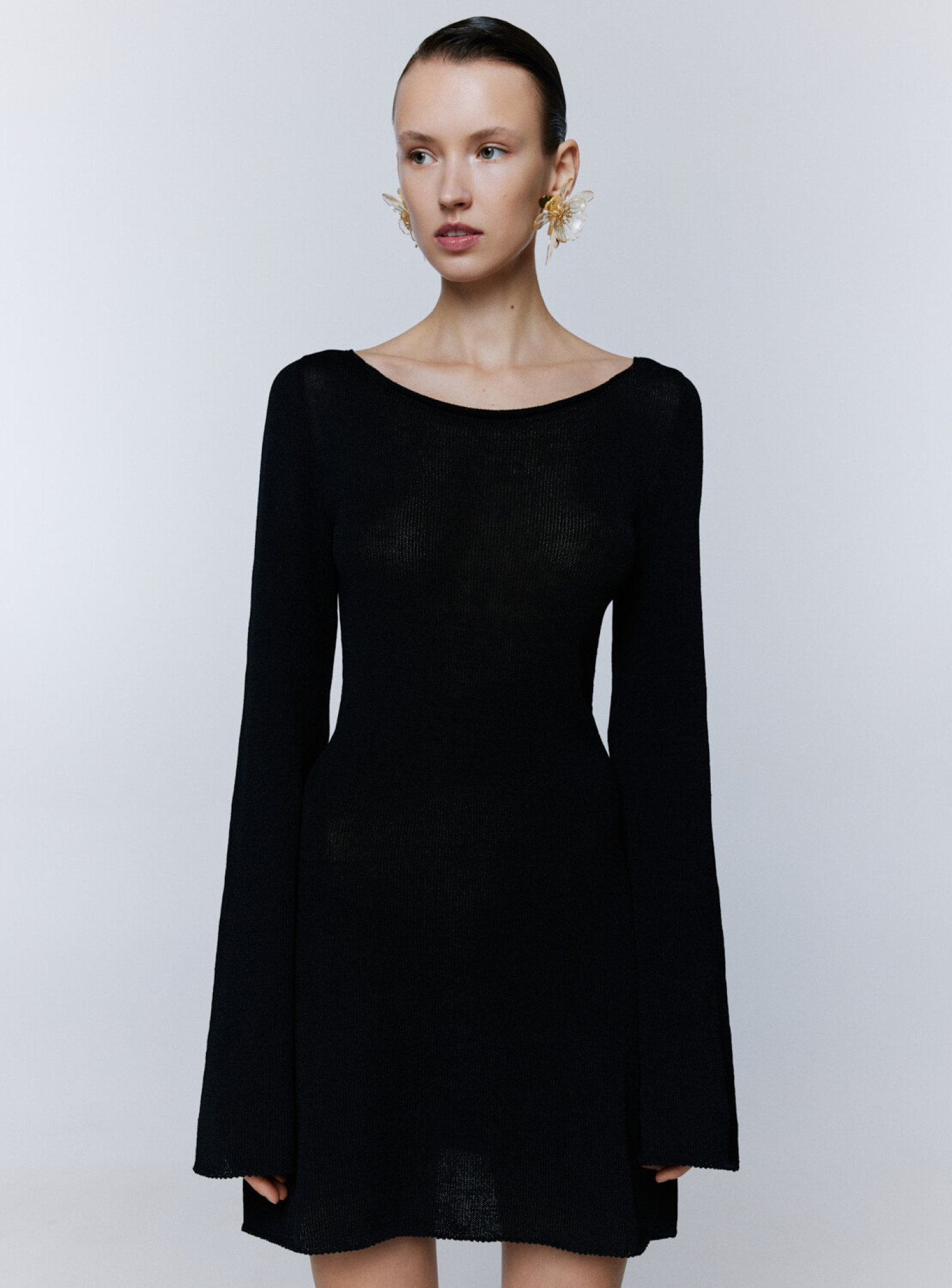 Стильное вечернее платье в длине мини. Выполнено из нежной полупрозрачной вискозы по бесшовной технологии. Плавно ниспадает по силуэту свободными линиями, переходящими в удлиненный рукав и юбку свободного кроя.