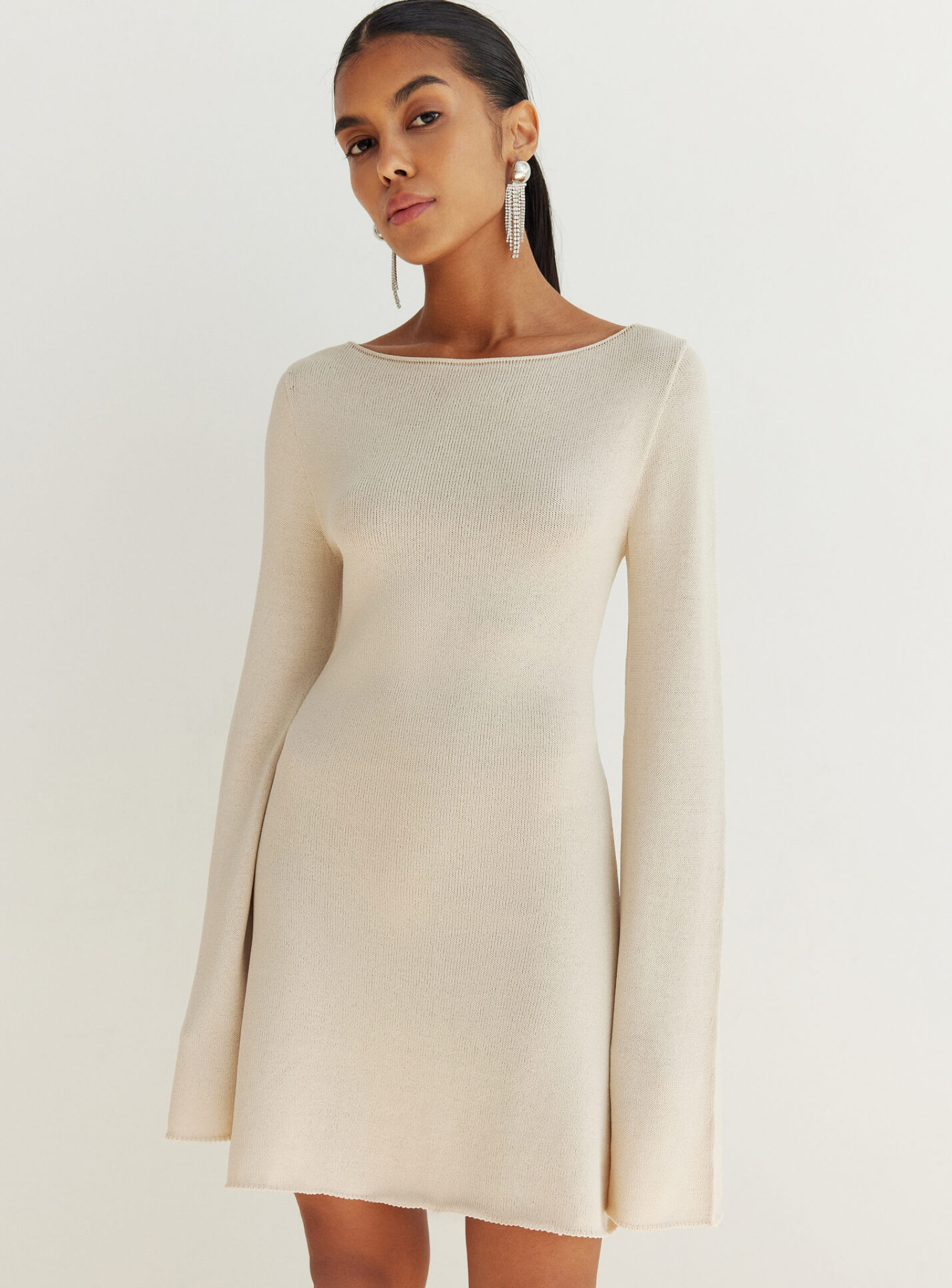 Стильное вечернее платье в длине мини. Выполнено из нежной полупрозрачной вискозы по бесшовной технологии. Плавно ниспадает по силуэту свободными линиями, переходящими в удлиненный рукав и юбку свободного кроя.