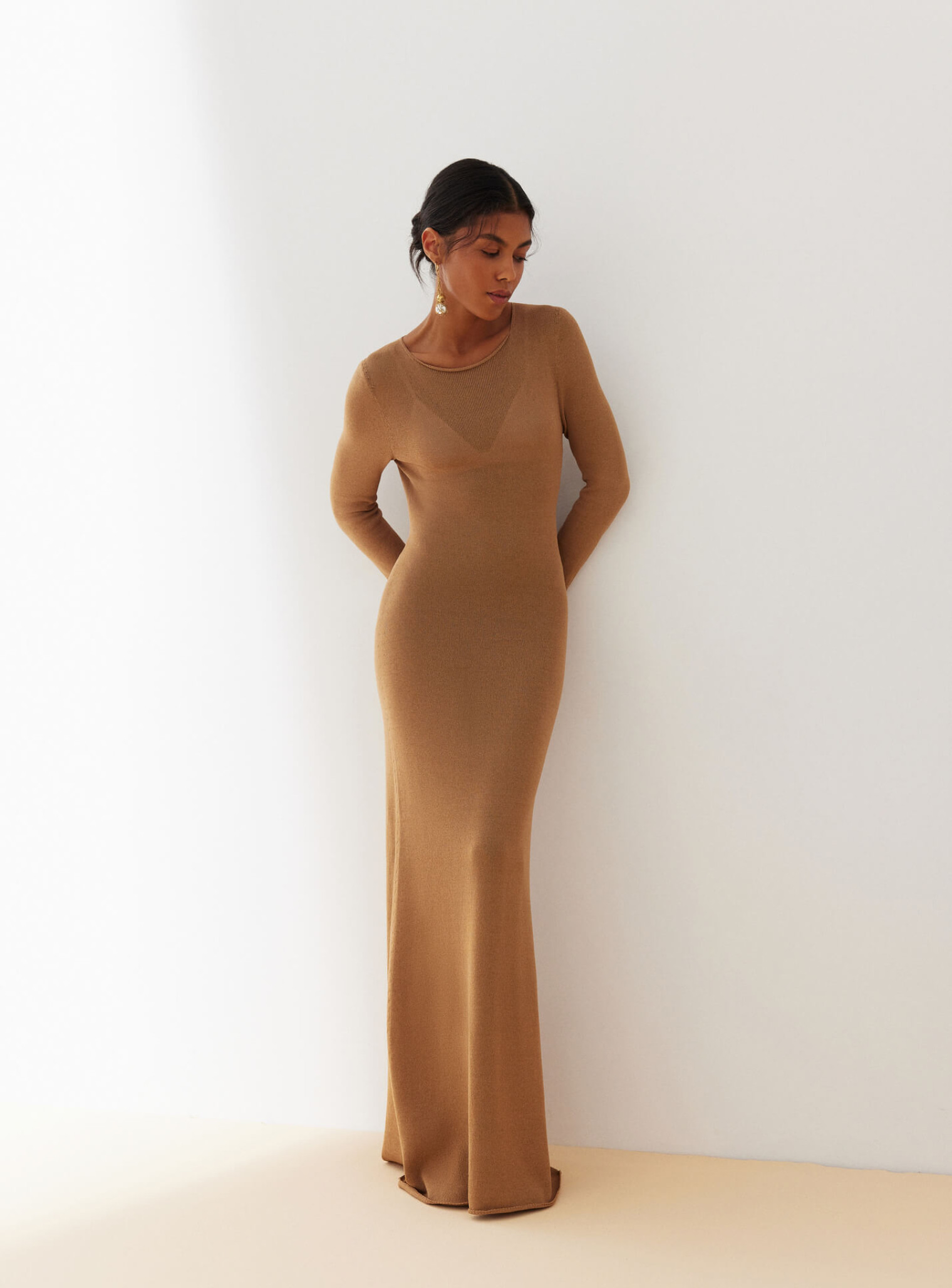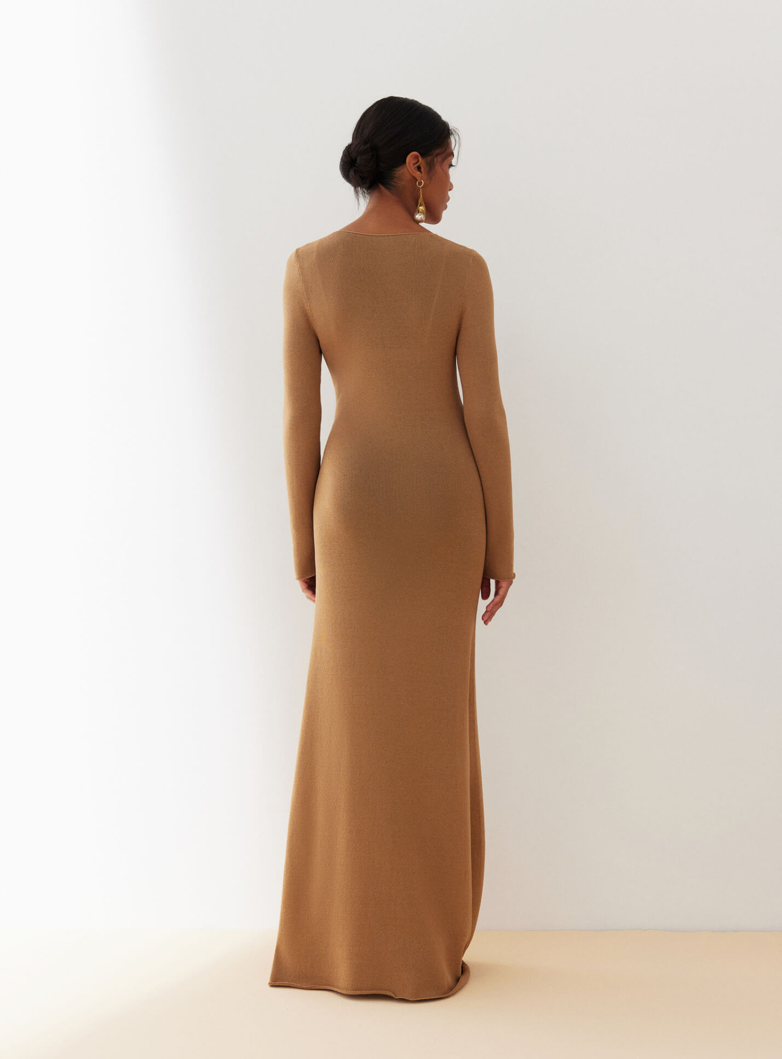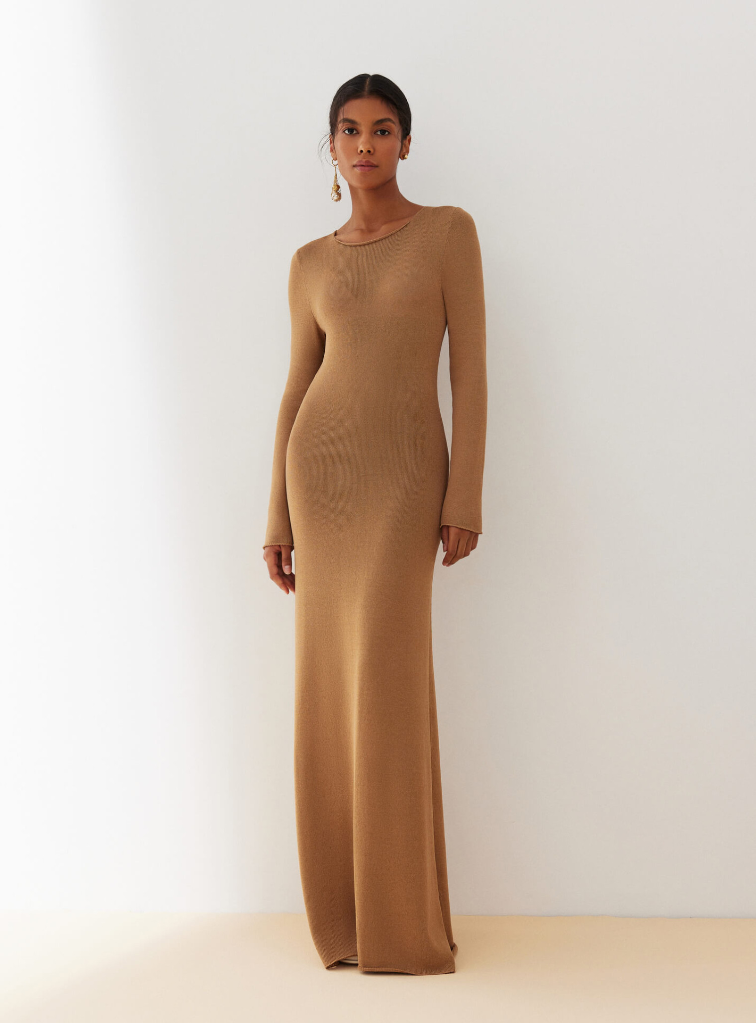 Изысканное бесшовное платье макси из деликатной вискозы, нежно спадающее по силуэту плавными линиями и подчеркивающее преимущества женской фигуры. Создано для ваших особых событий.
