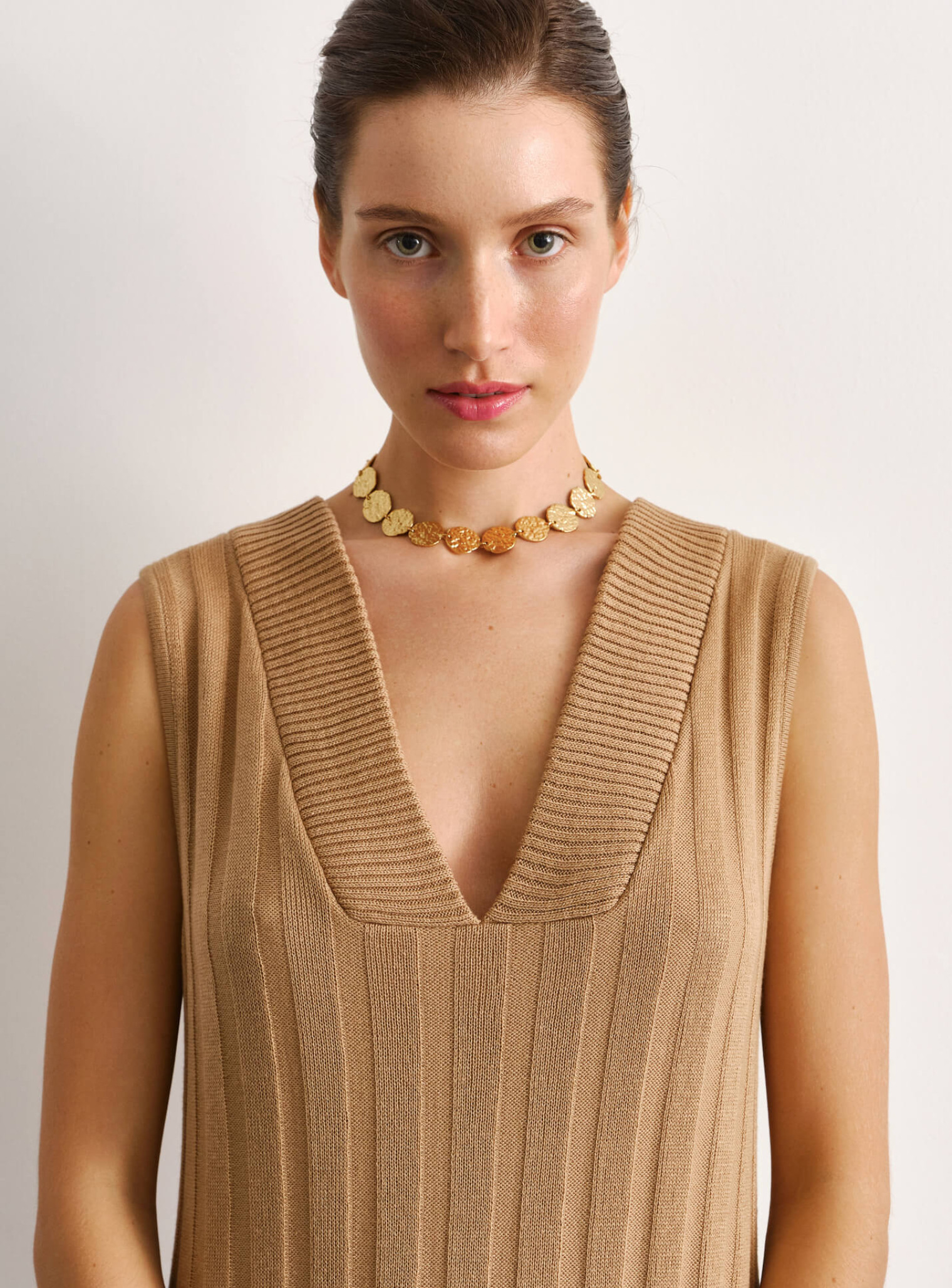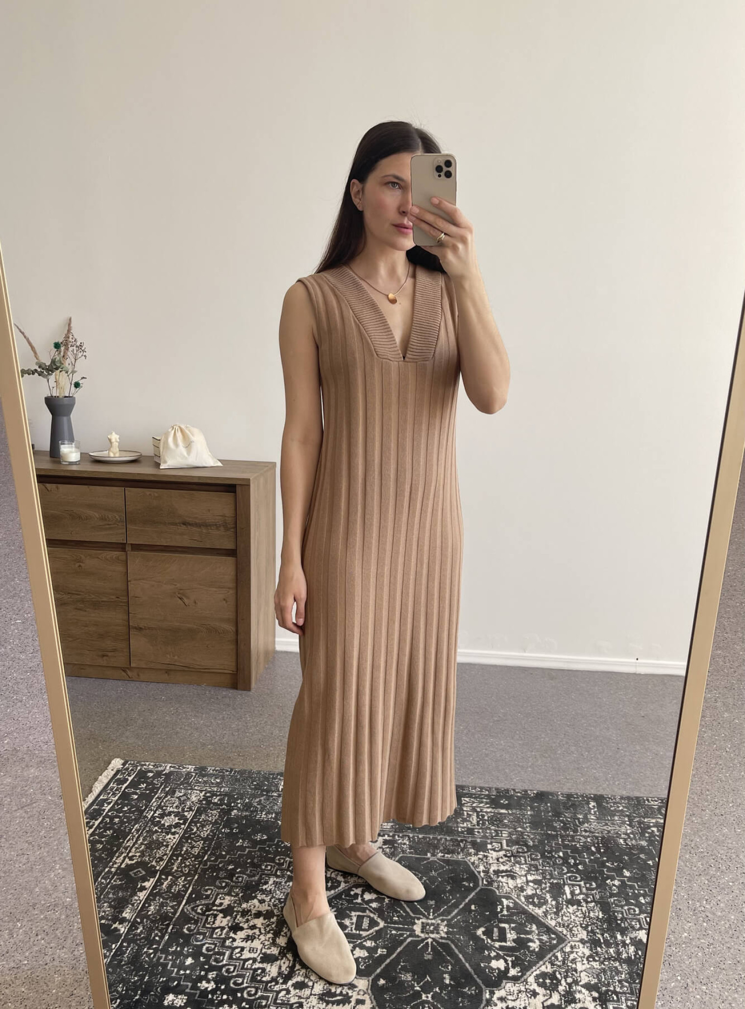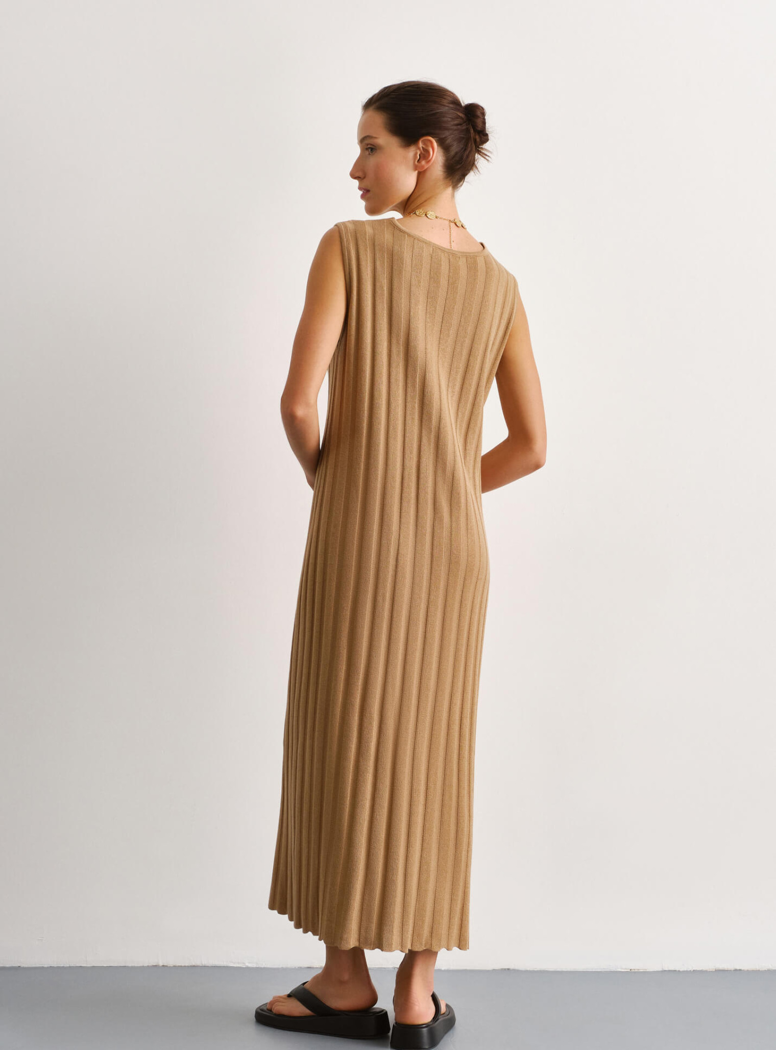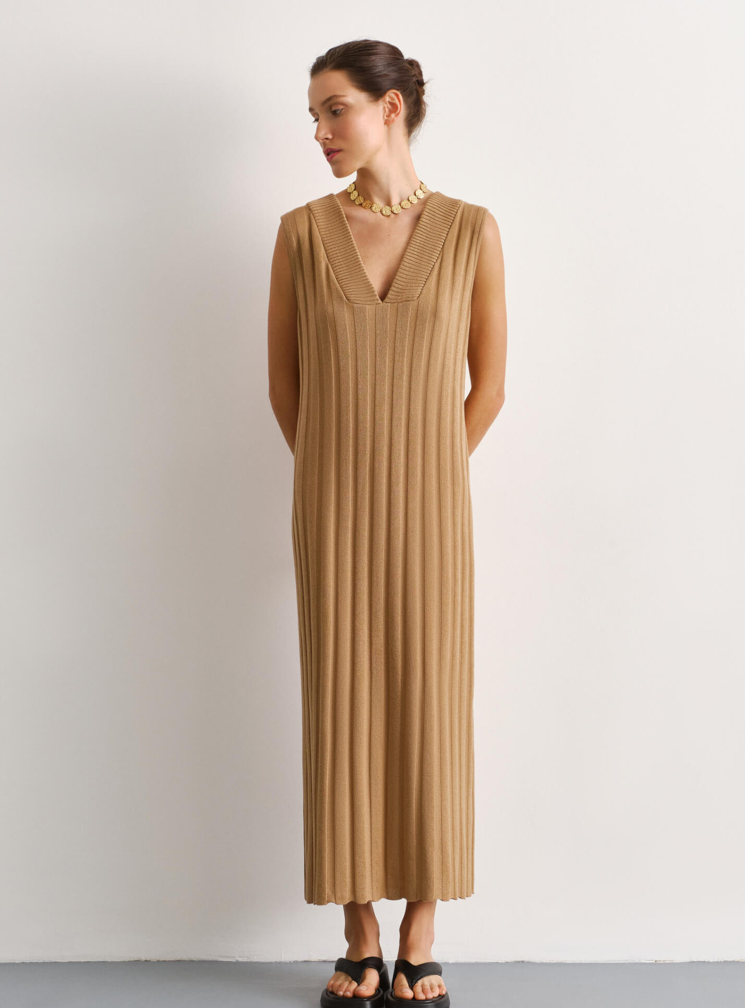 Элегантное платье с V-образным вырезом, создающее плавный силуэт и удлиняющее фигуру за счет нежной текучей ткани. Базовая модель, которую можно стилизовать в повседневные образы, или дополнить аксессуарами и одевать для особых событий. Доступна к заказу в двух вариантах длины.