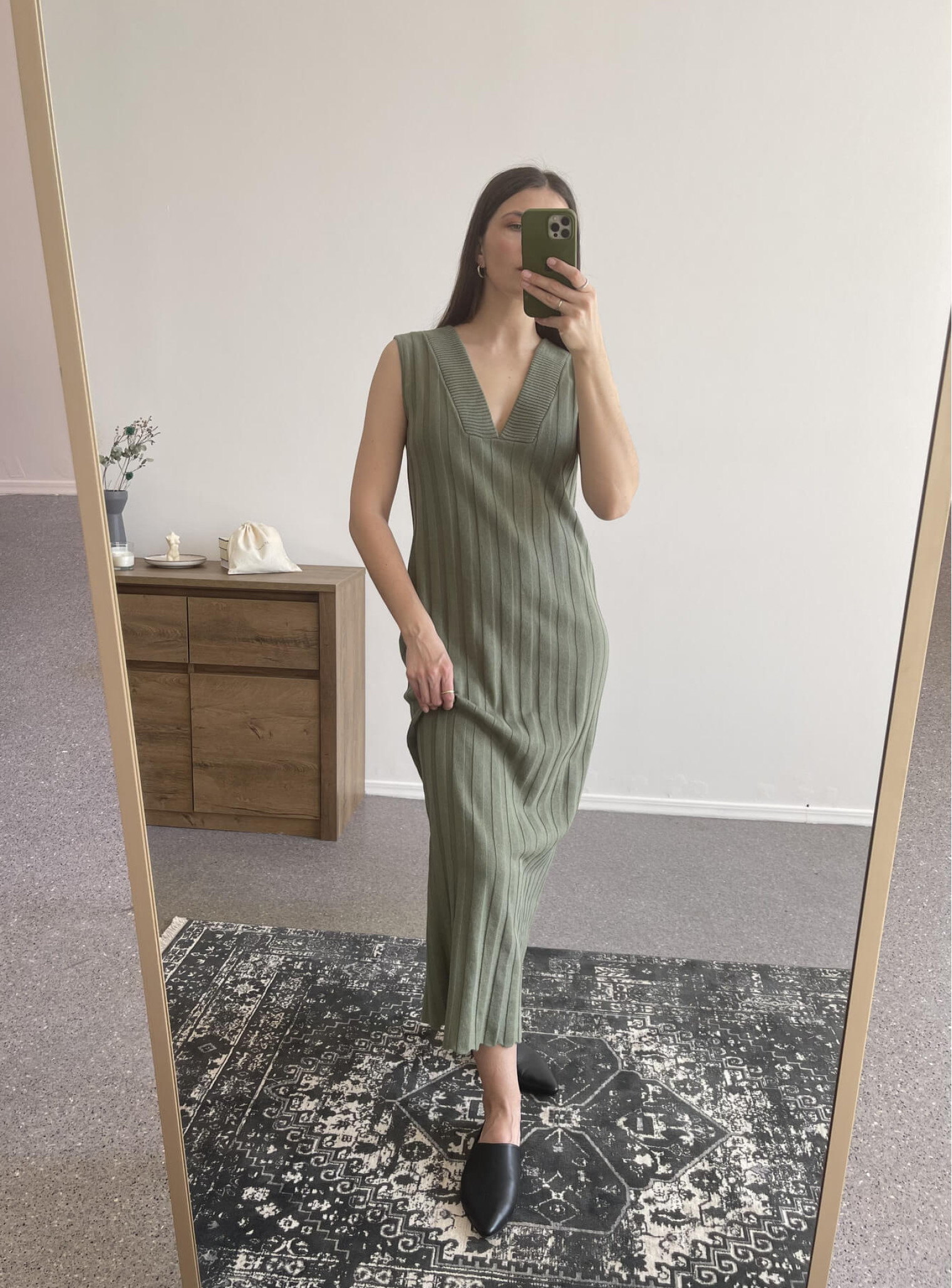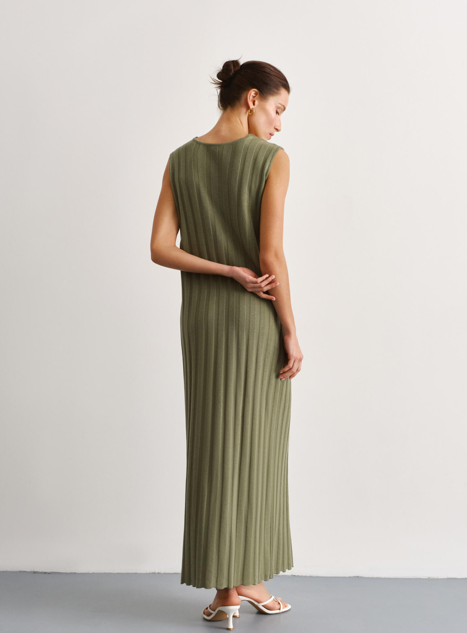 Элегантное платье с V-образным вырезом, создающее плавный силуэт и удлиняющее фигуру за счет нежной текучей ткани. Базовая модель, которую можно стилизовать в повседневные образы, или дополнить аксессуарами и одевать для особых событий. Доступна к заказу в двух вариантах длины.