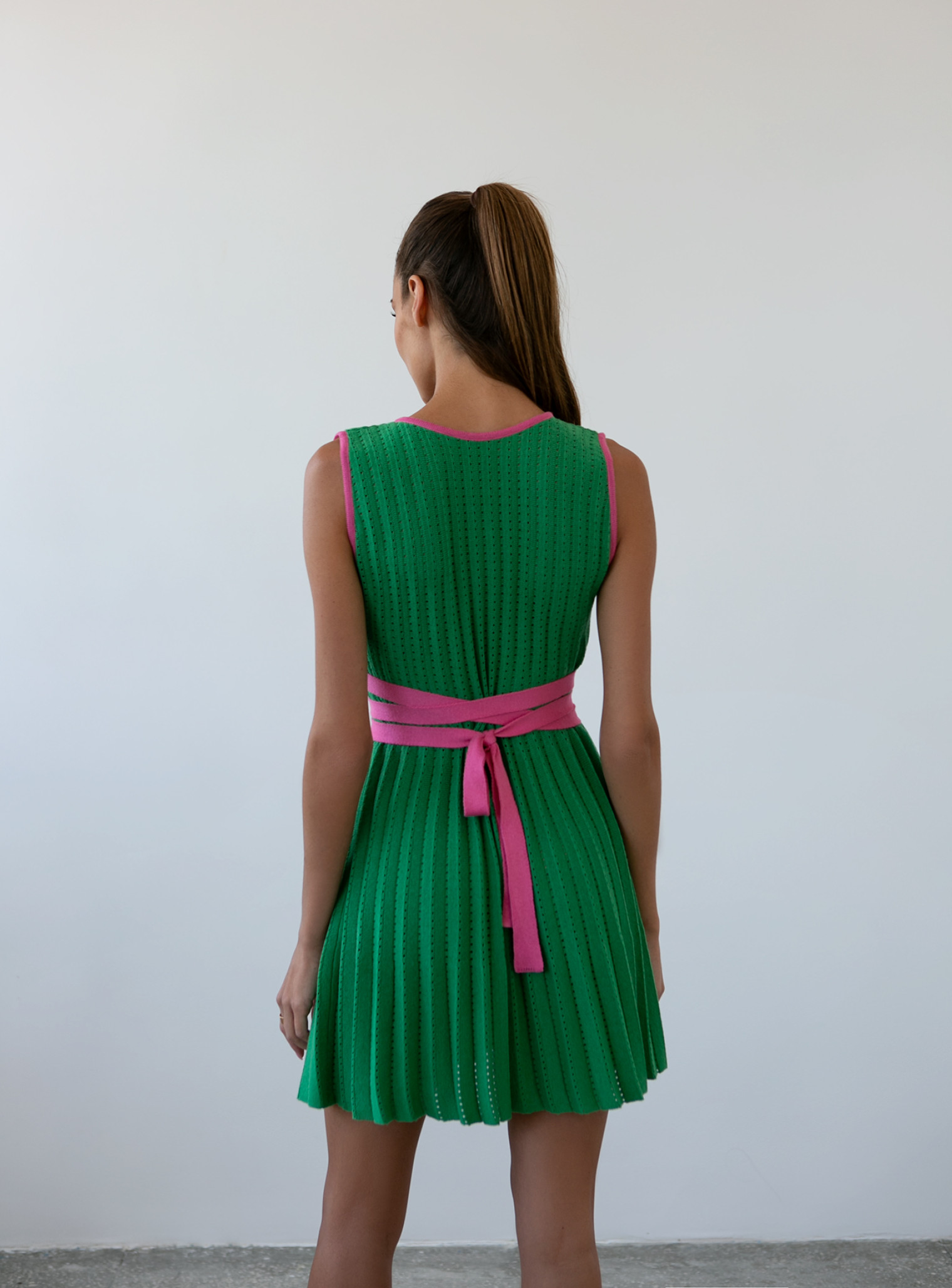 Трикотажное ажурное платье от бренда 25 Union – это настоящий образец легкости и динамики. Длина мини позволяет подчеркнуть красоту ног, а фактура ткани с мелкими складками создает особую игру света и тени на поверхности. За счет этого полупрозрачное платье без рукавов буквально оживает при каждом движении. Плиссированная структура не просто украшает. Она мягко обволакивает силуэт, делает образ более интересным и живым.