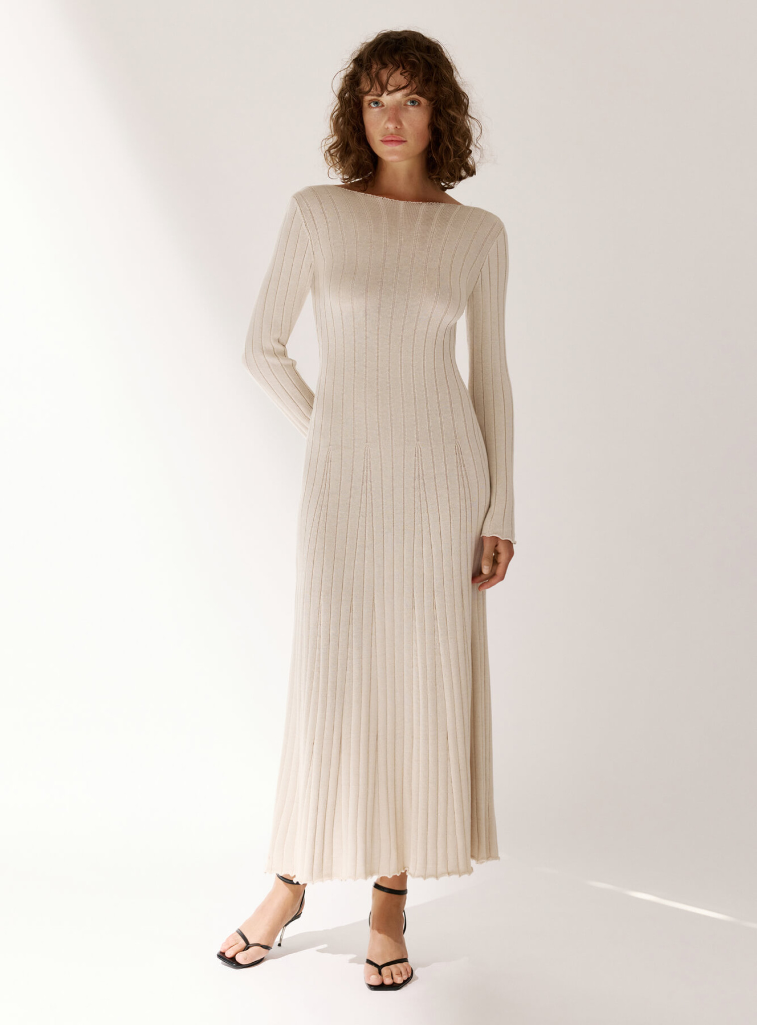 Платье выполнено из деликатного хлопкового плетения, украшено акцентным вырезом на спине. Платье имеет приталенный верх, на бедрах расходится к подолу благодаря декоративным вставкам в виде клиньев, которые образуют красивый узор. Элегантная модель, подчеркивающая хрупкость девушки.