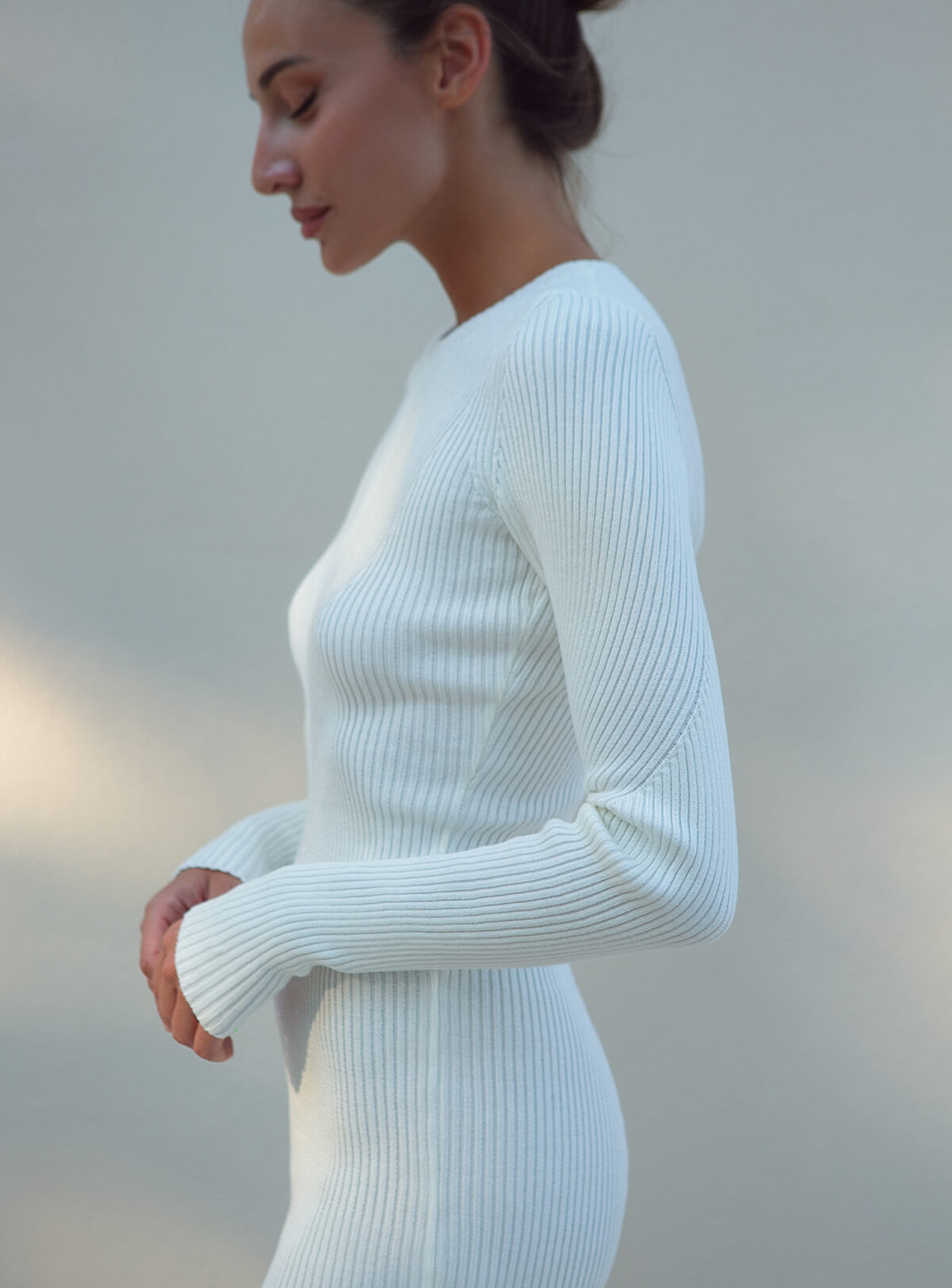 Платье силуэтное мини фактурной вязки молоко