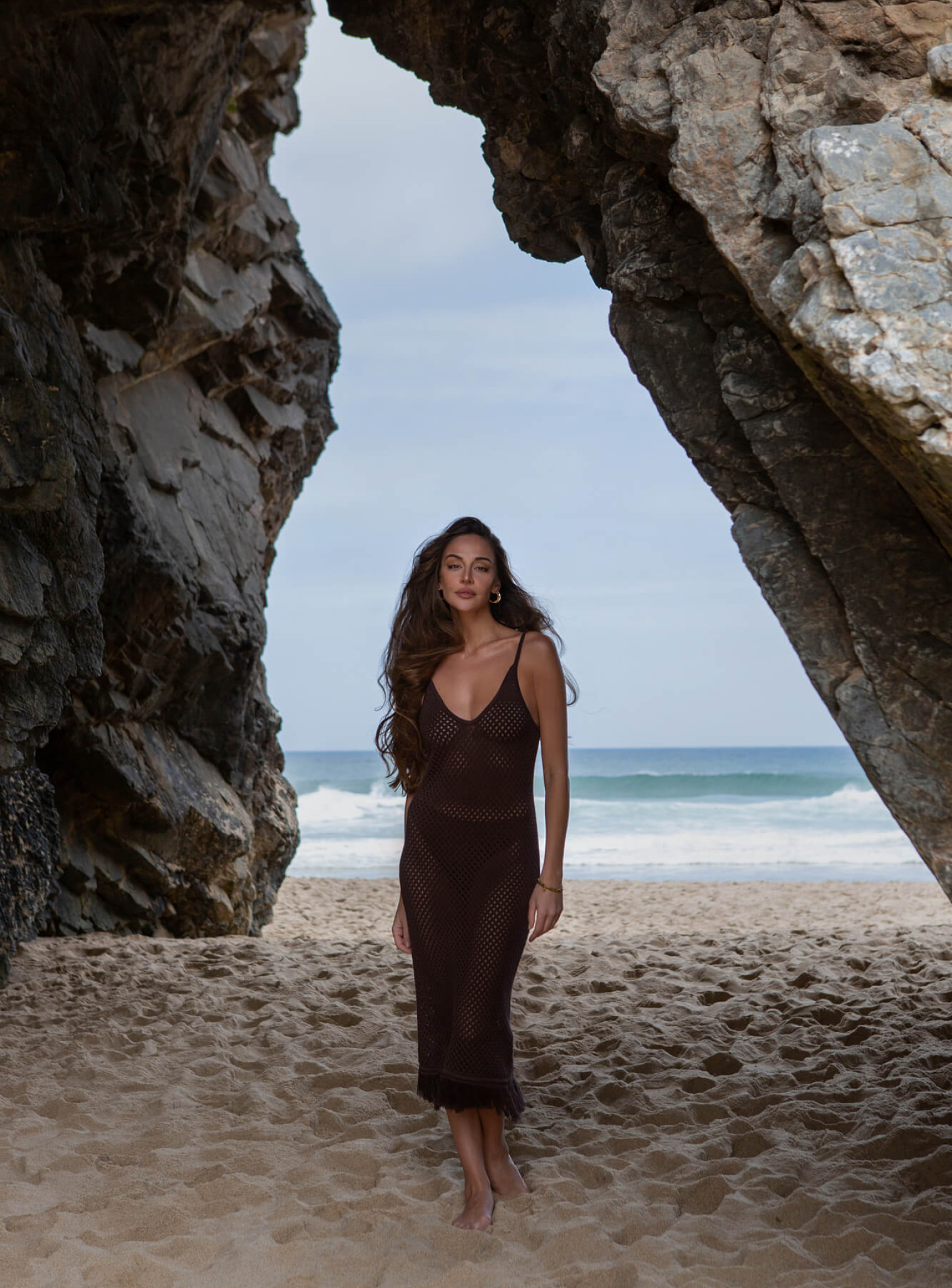 Сарафан выполнен в технике кроше из ажурной ткани и декоративной строчкой бахромы. Очерчивает силуэтные линии фигуры, открывает круглым вырезом декольте и завязывается на тонкие бретели, с помощью которых вы можете редактировать длину. Фактура ткани оттеняет загорелую кожу и удачно дополняет ваш образ с купальником или бельем в отпуске.