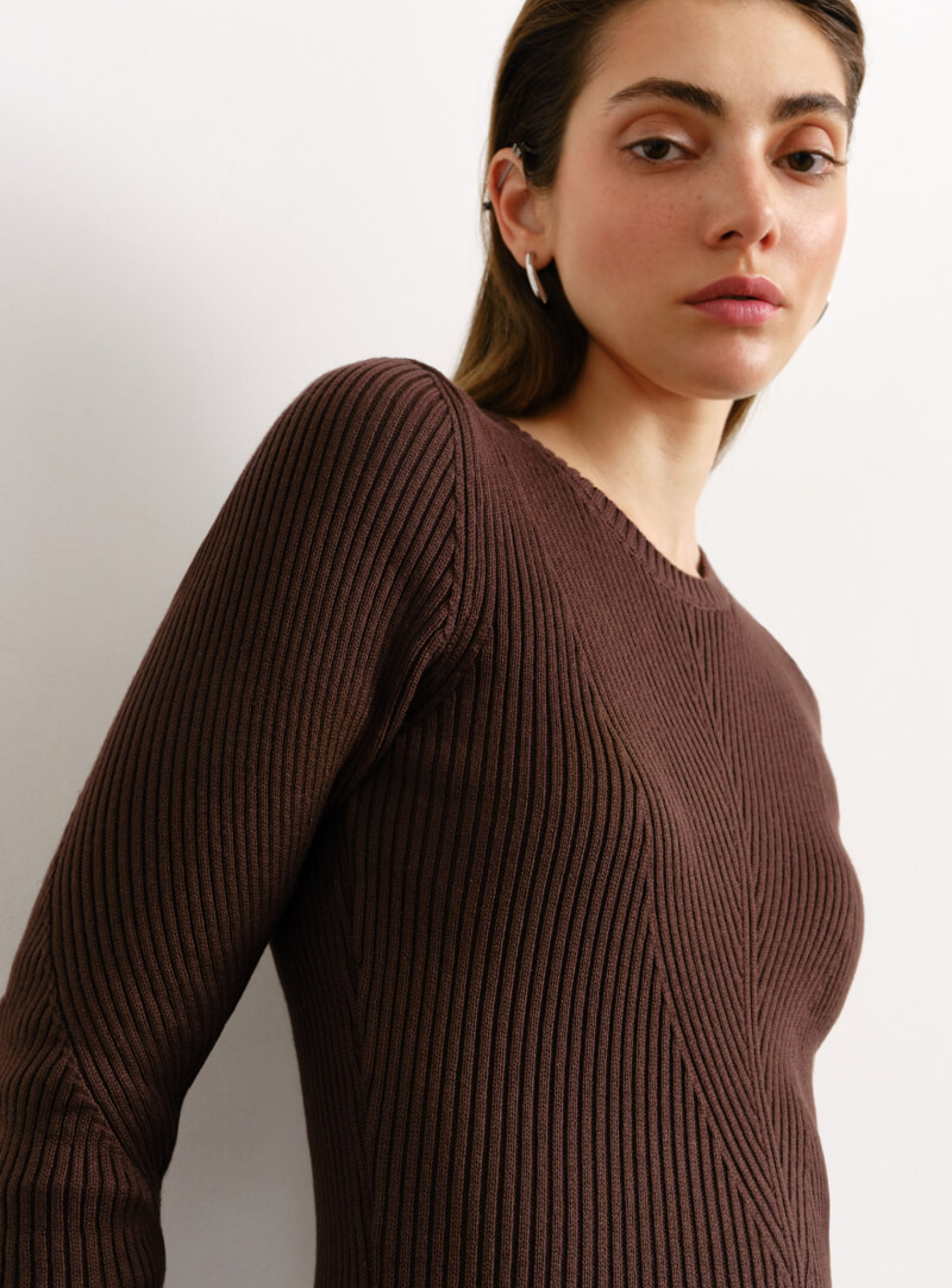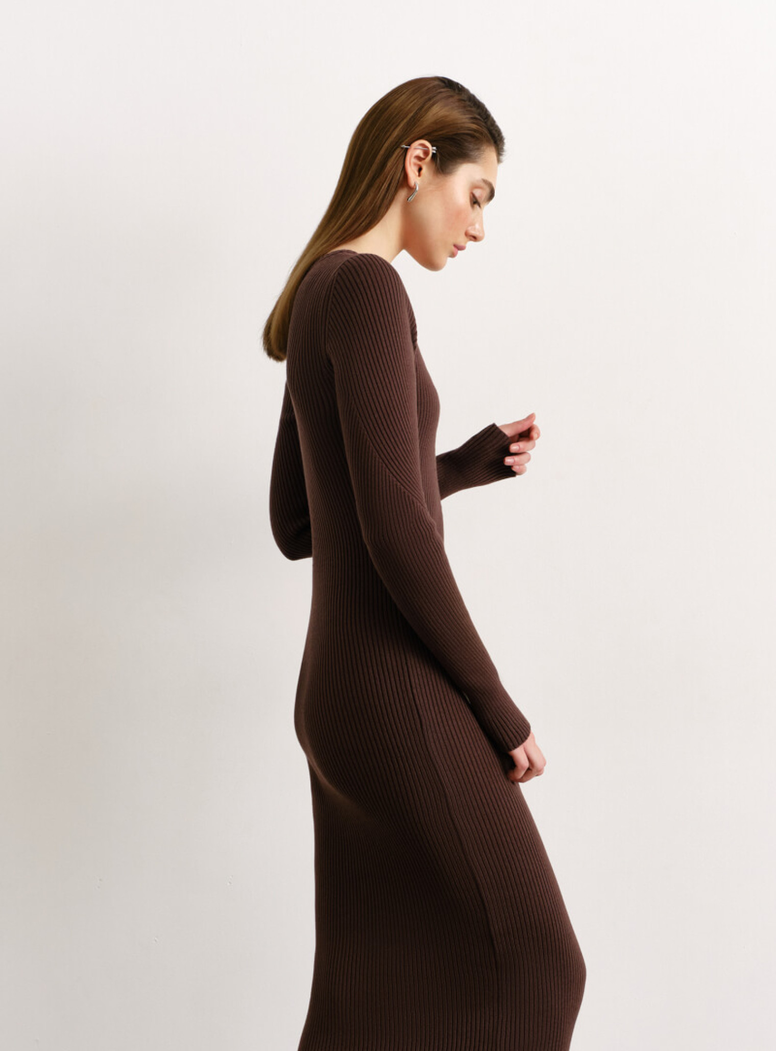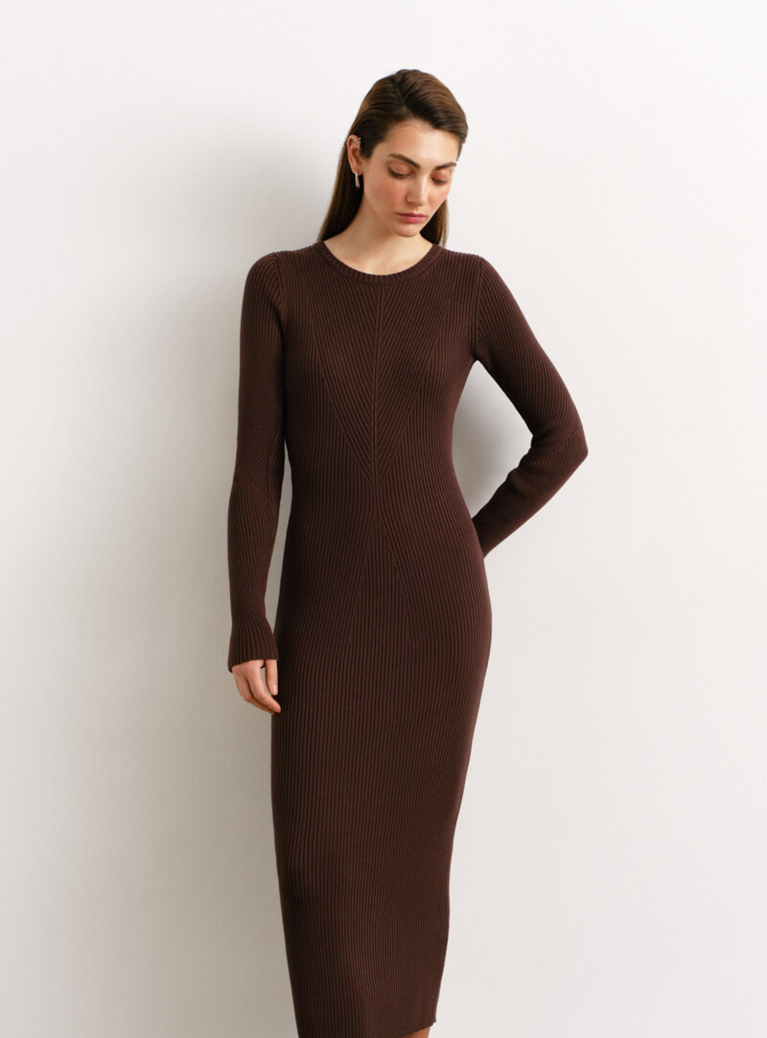 Силуэтное платье миди фактурной вязки шоколад