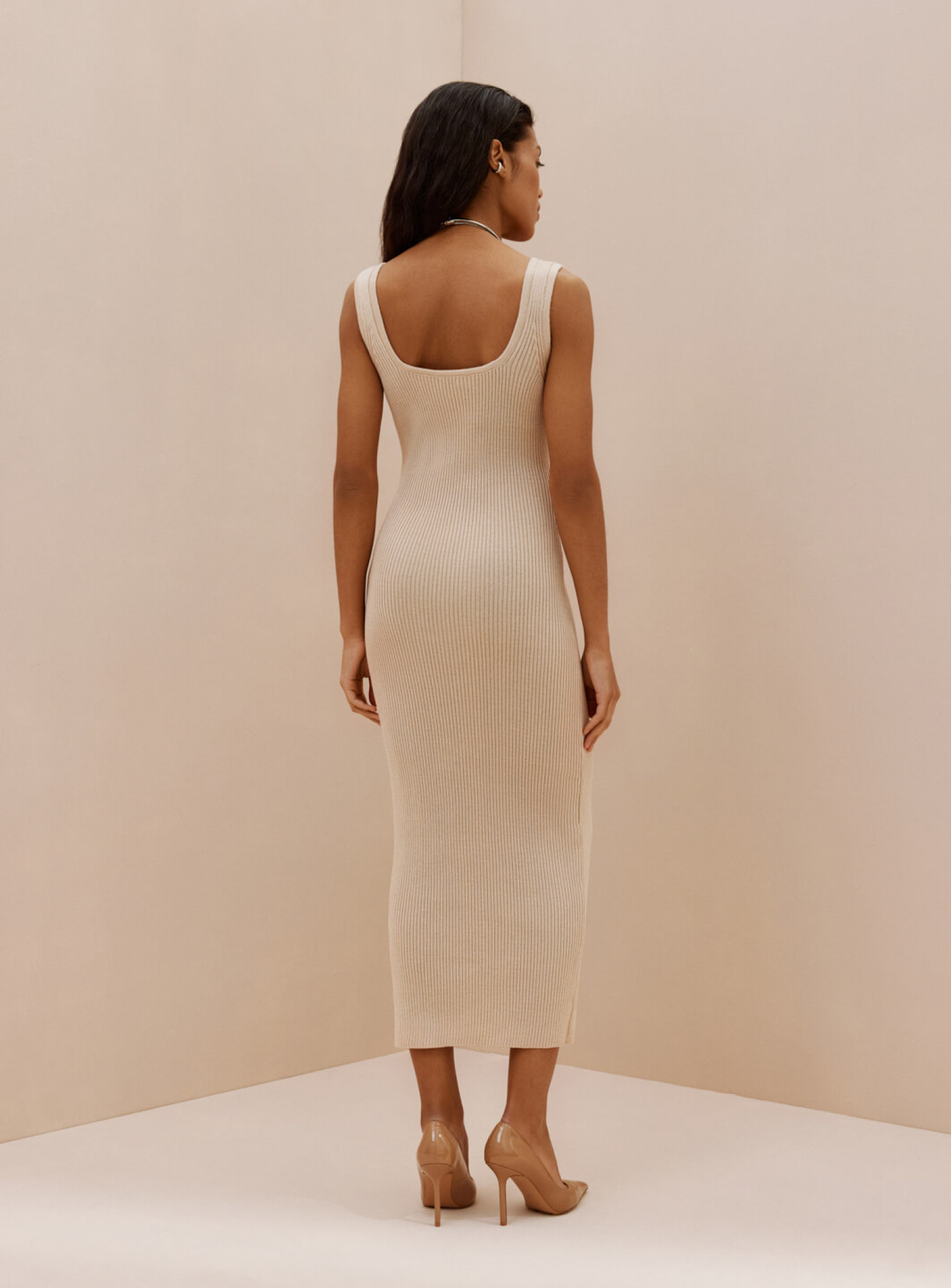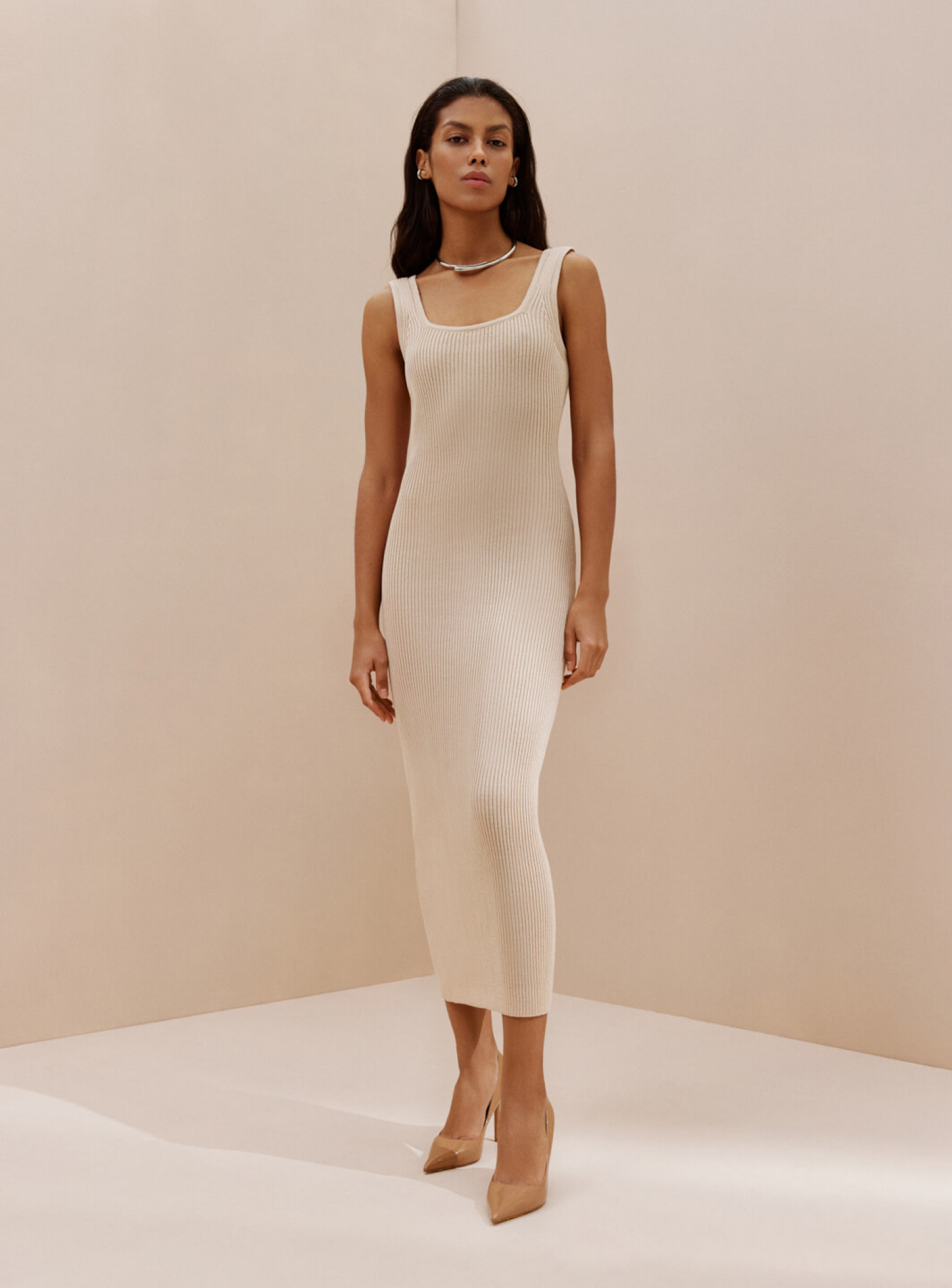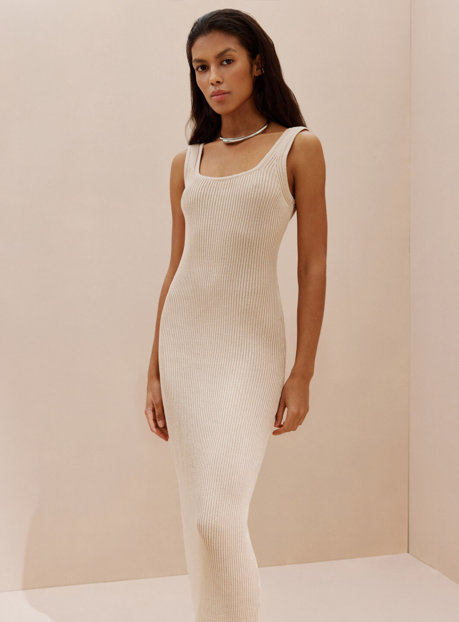 Базовое платье миди с квадратным вырезом, повторяющимся на спине. Выполнено из фактурного трикотажа в резинку, что плавно очерчивает фигуру и вытягивает силуэт. Доступно к заказу в двух вариантах длины. Платье можно стилизовать для повседневной жизни или особых событий, меняя аксессуары.