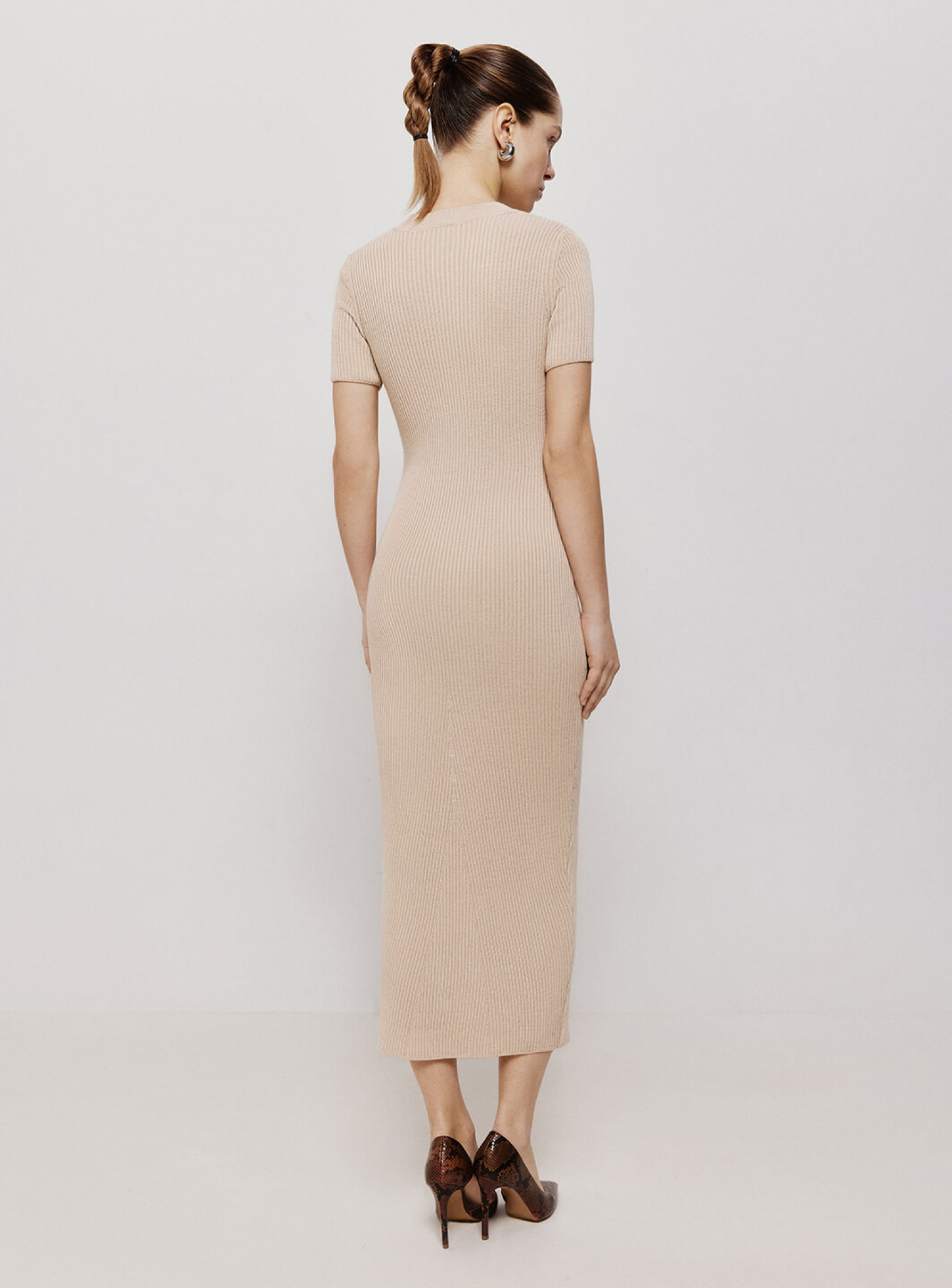 Платье меди из фактурного трикотажа в резинку с декоративным вывязанным элементом в форме клина на подоле платья. Базовая модель платья, плавно ложащаяся по фигуре и позволяющая одевать образ как для повседневной, так и для особых событий, изменяя стилизацию с помощью аксессуаров.