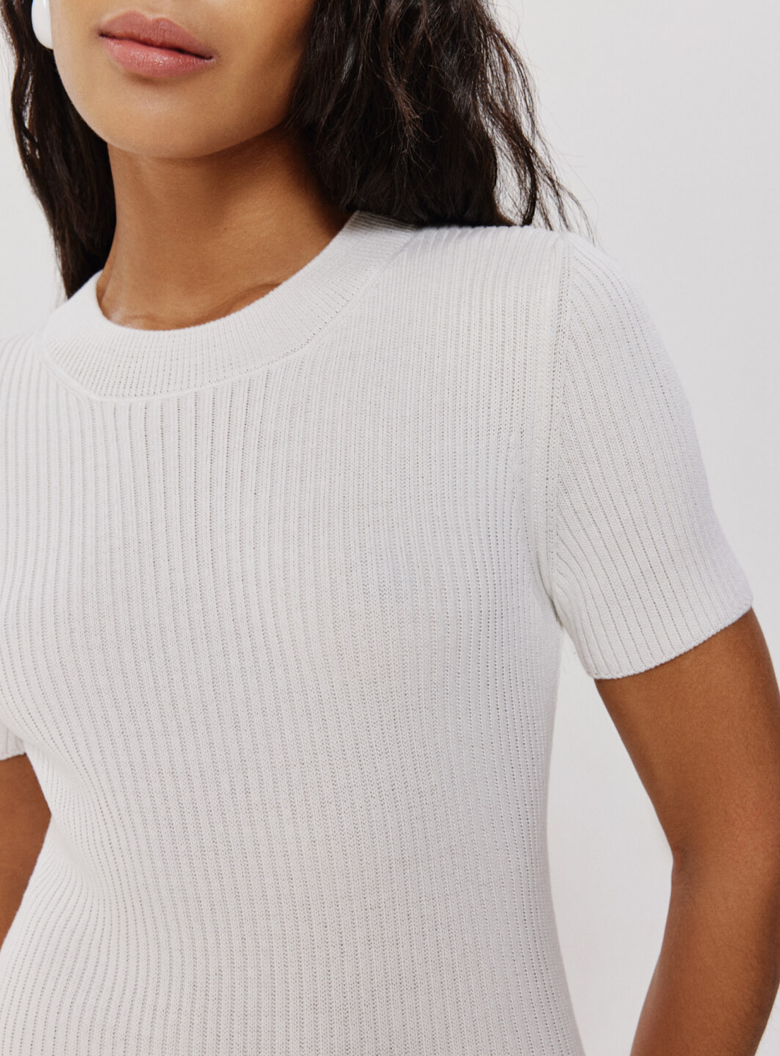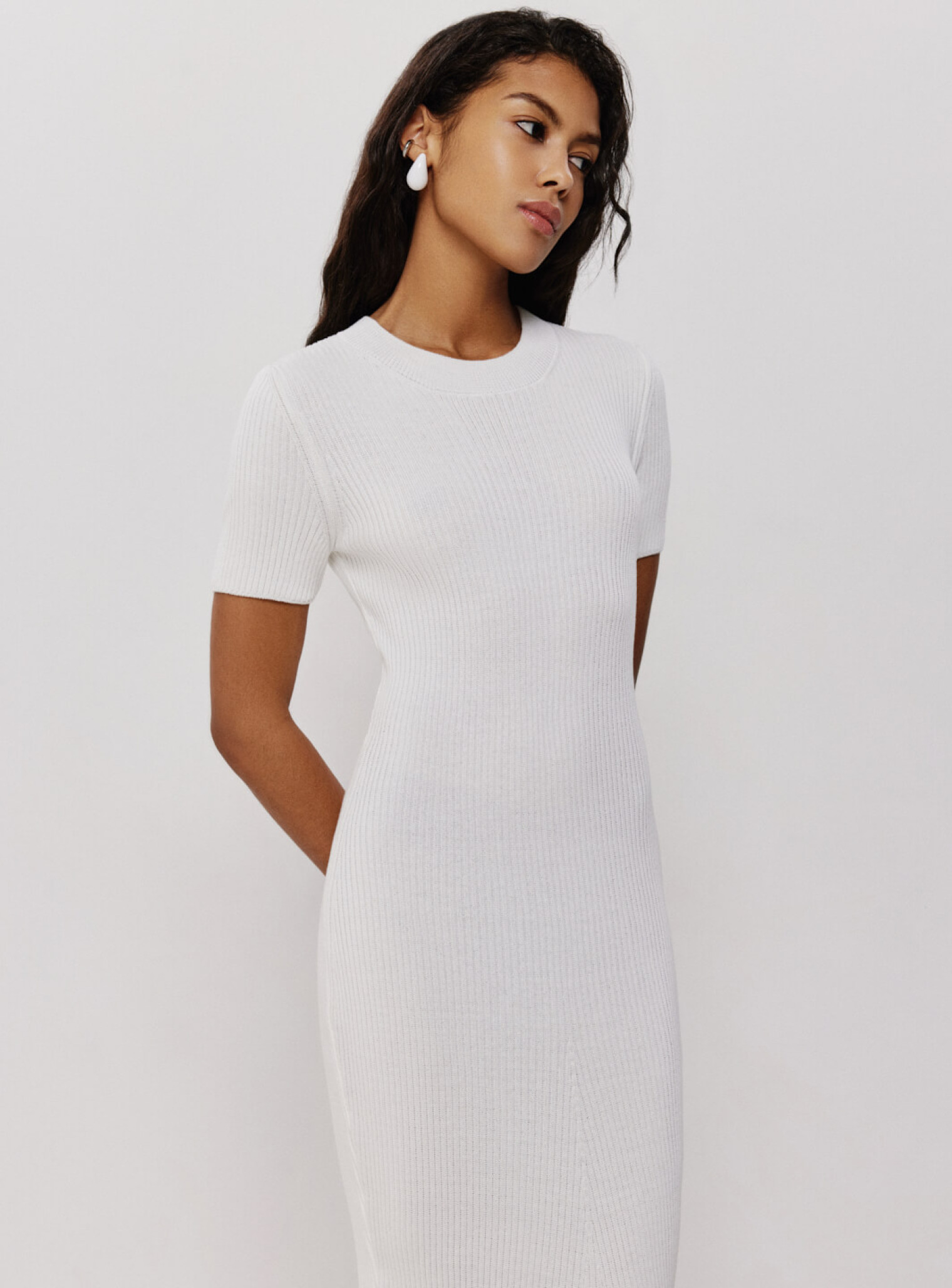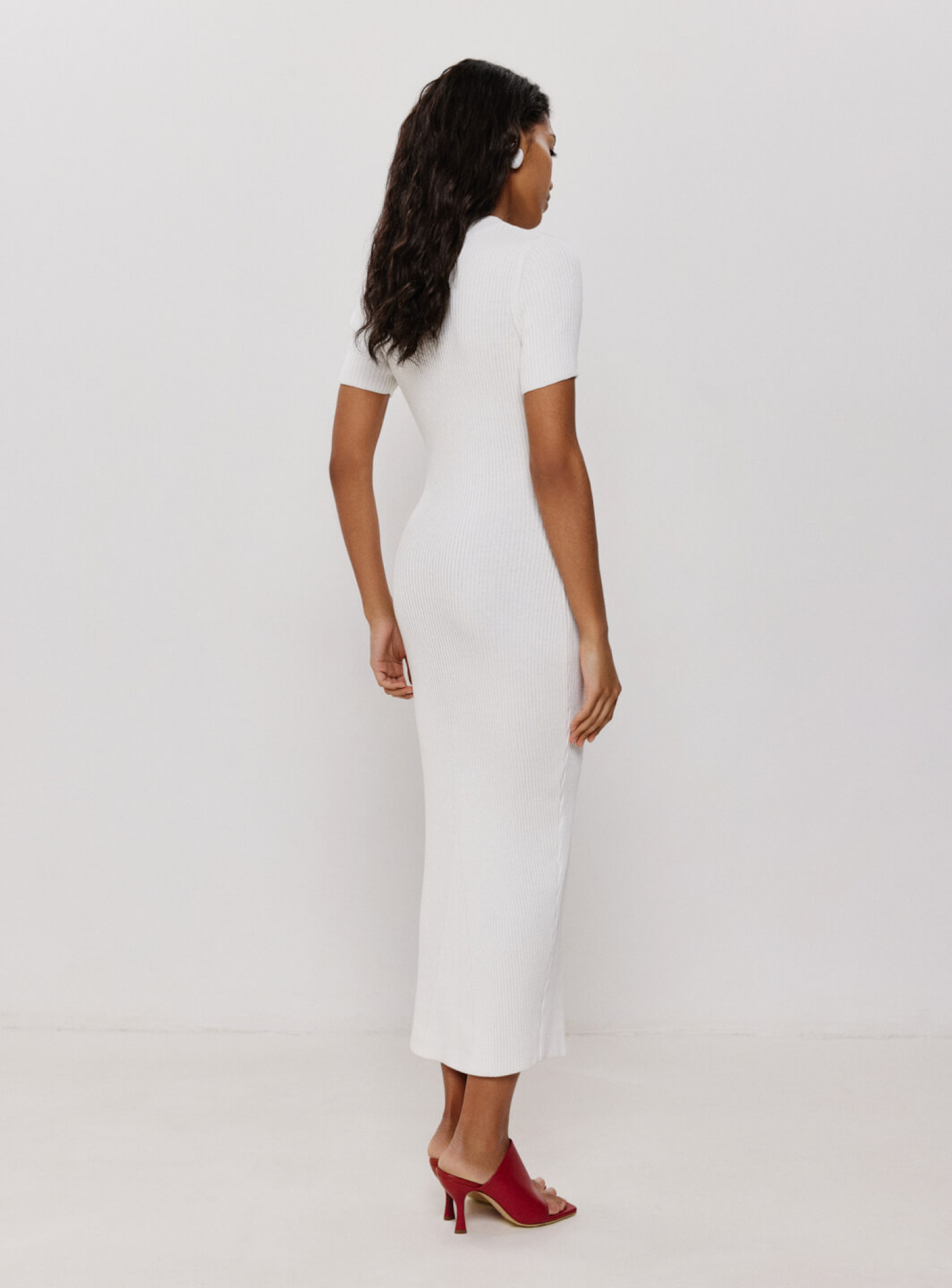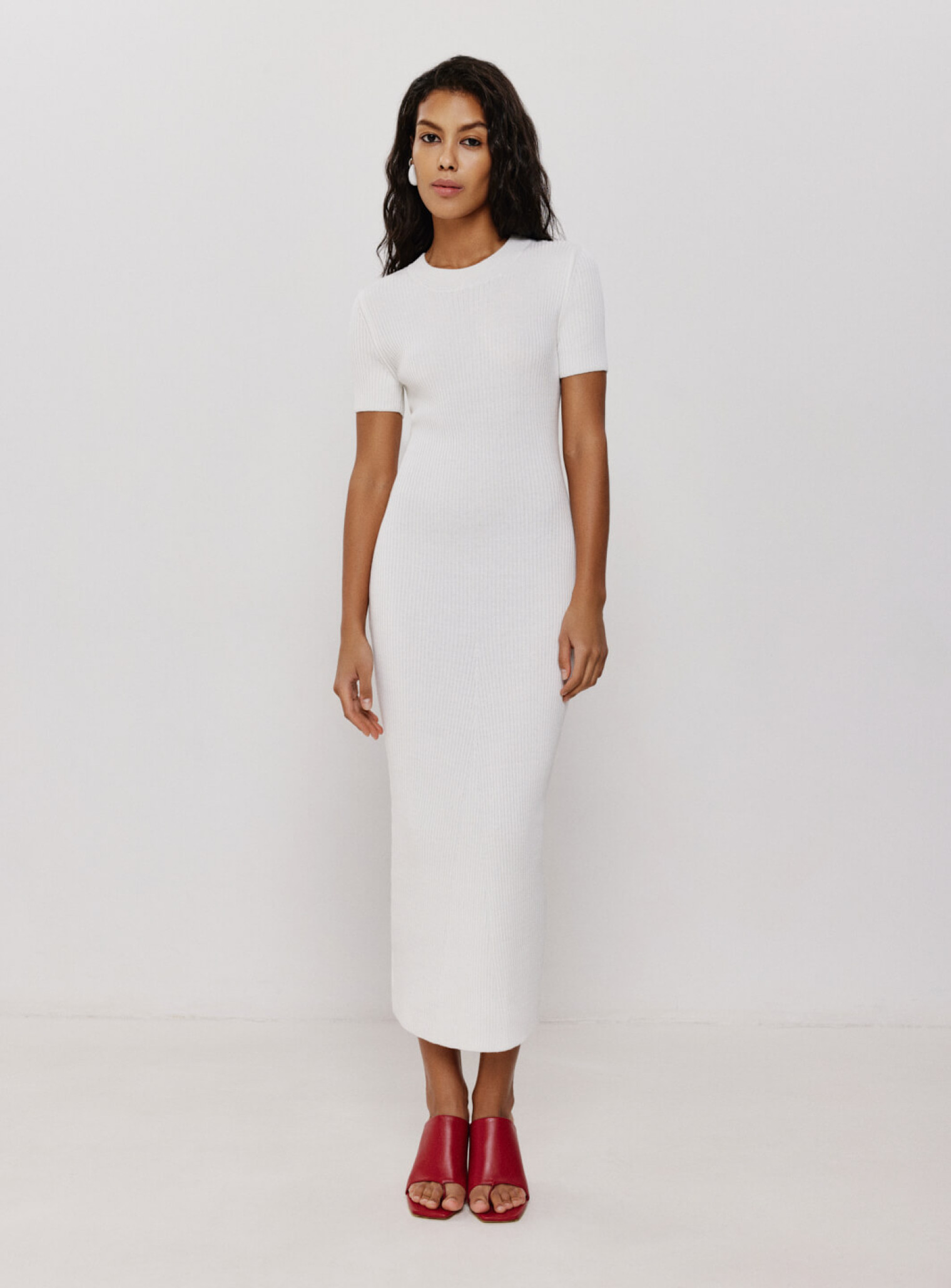 Платье меди из фактурного трикотажа в резинку с декоративным вывязанным элементом в форме клина на подоле платья. Базовая модель платья, плавно ложащаяся по фигуре и позволяющая одевать образ как для повседневной, так и для особых событий, изменяя стилизацию с помощью аксессуаров.