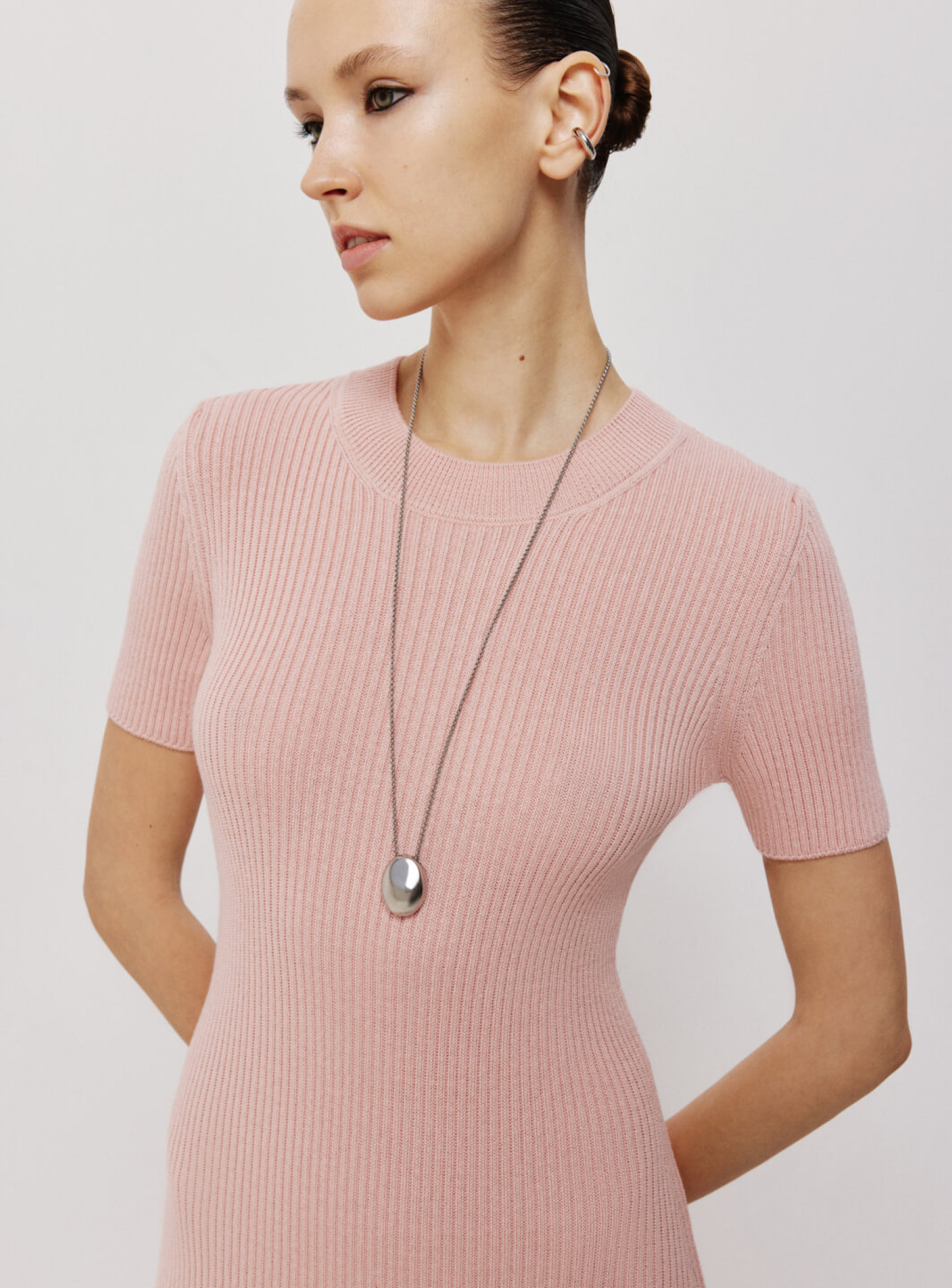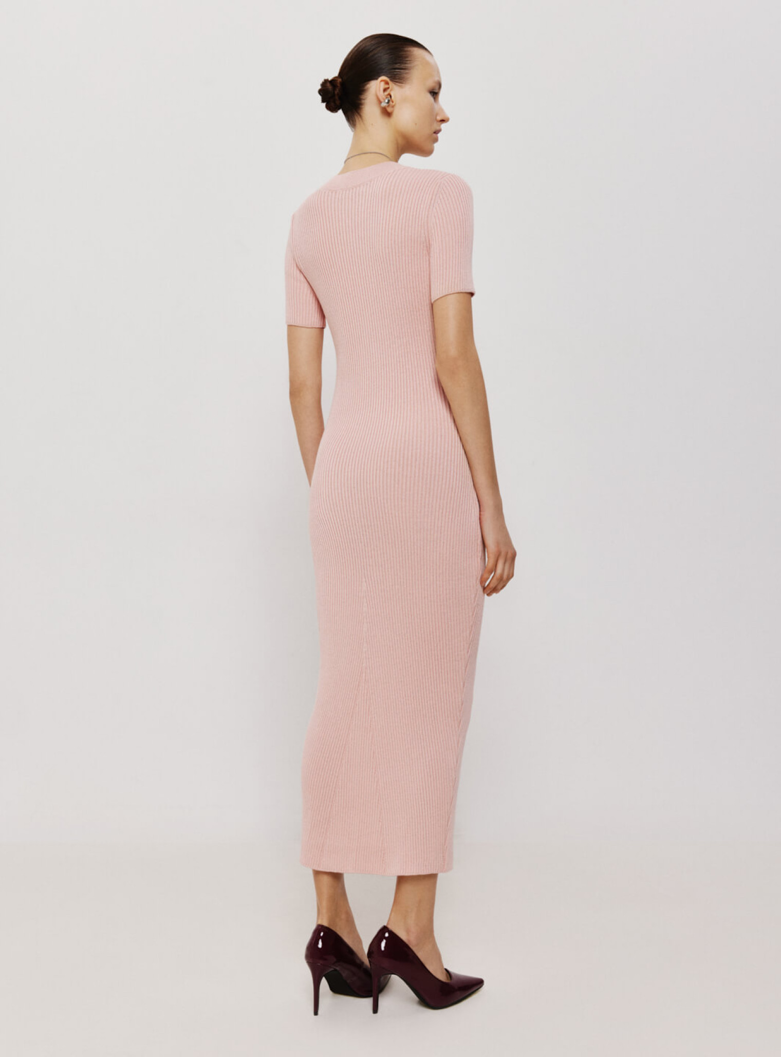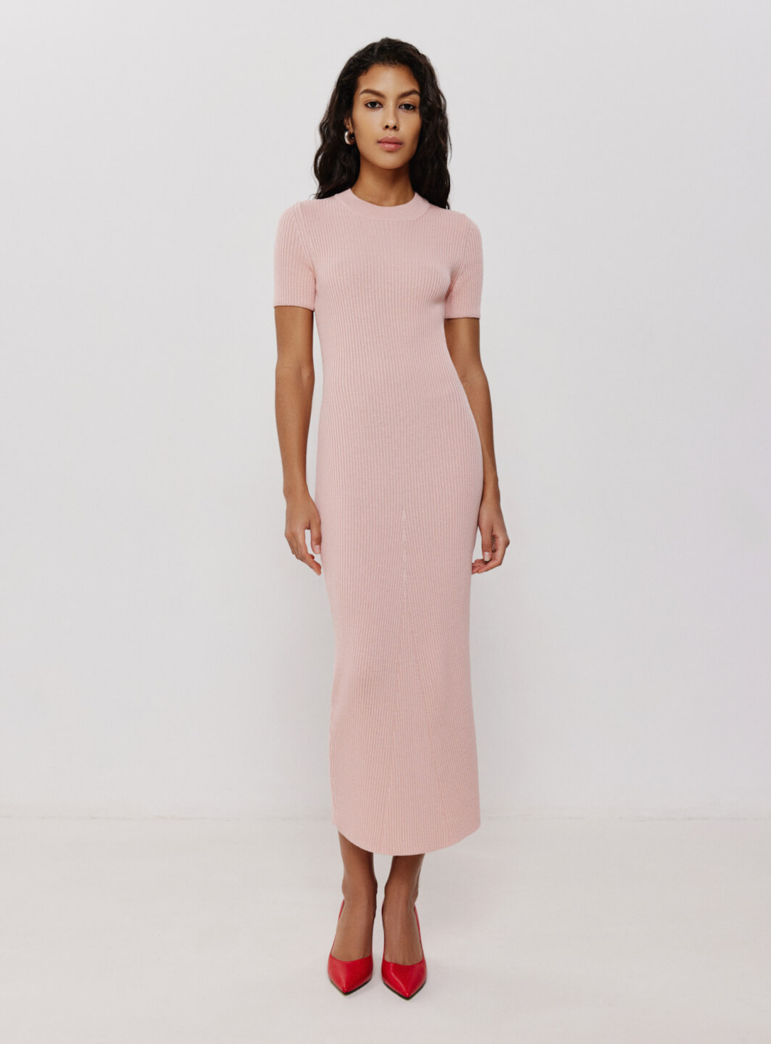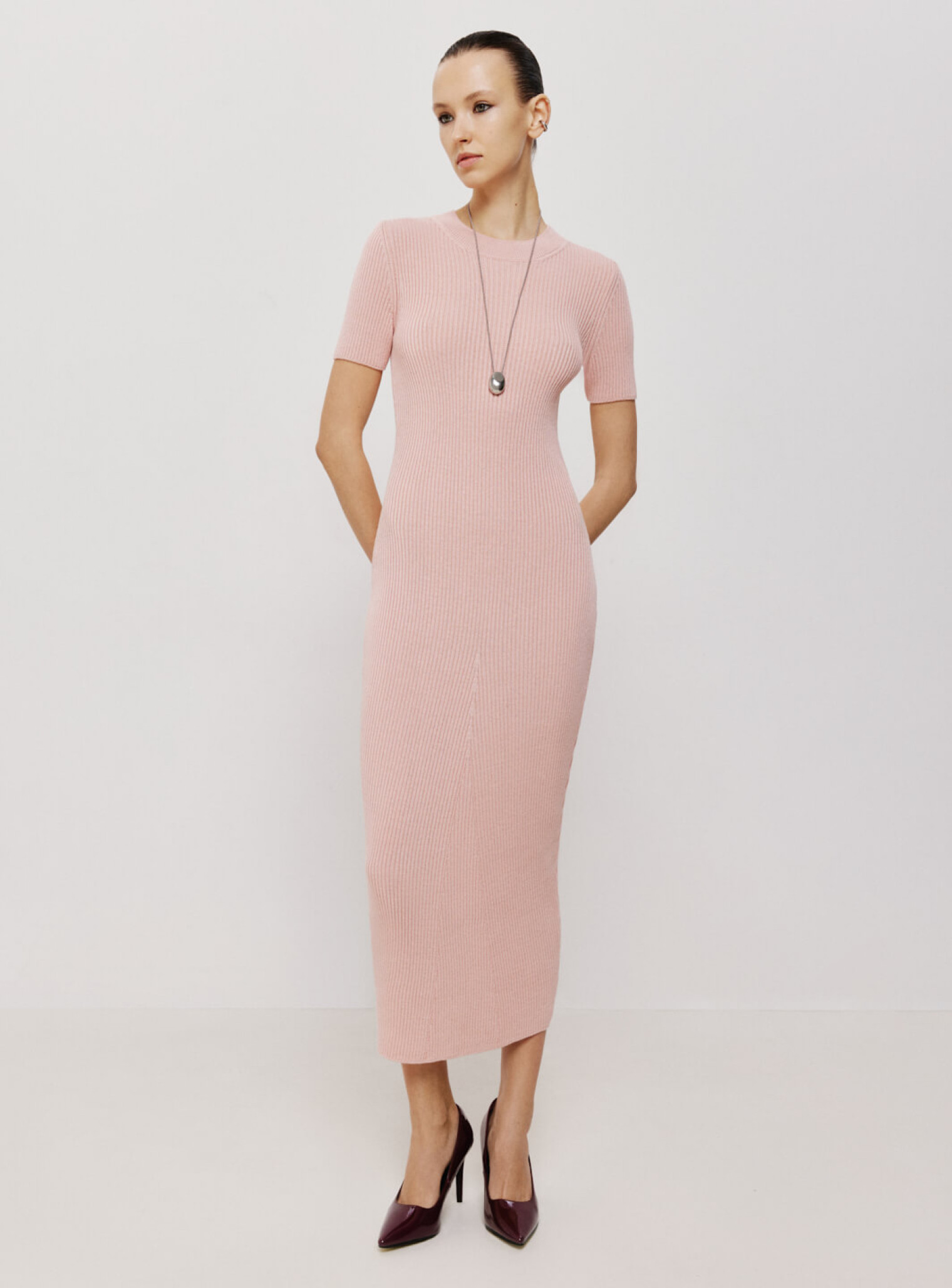 Платье меди из фактурного трикотажа в резинку с декоративным вывязанным элементом в форме клина на подоле платья. Базовая модель платья, плавно ложащаяся по фигуре и позволяющая одевать образ как для повседневной, так и для особых событий, изменяя стилизацию с помощью аксессуаров.