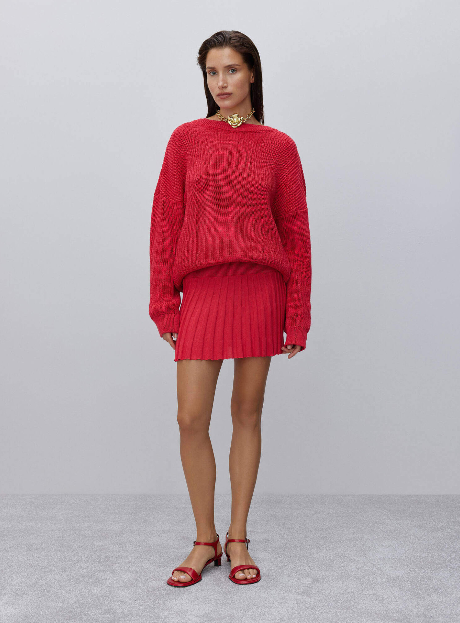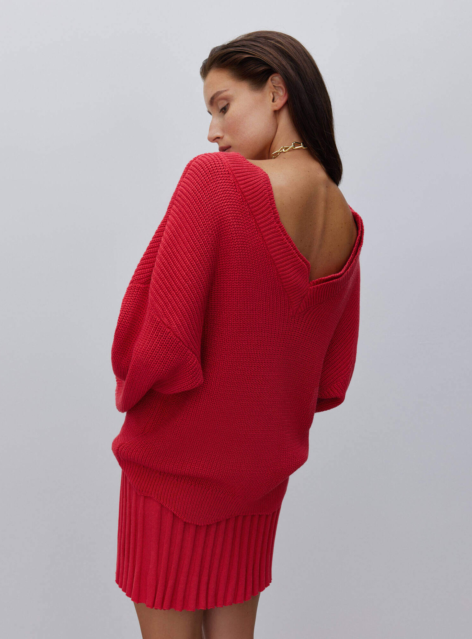 Свитер свободного кроя, в котором особым акцентом является вырез на спине. Вырез выполнен двойным манжетом, повторяющим форму лепестка цветка, как и низ свитера. Свитер имеет опущенную линию плеча, удлиненный крой и широкие рукава. Нежные цветочные элементы на объемном фасоне свитера отражают нежность и женственность и дарят комфорт. Сочетается в комплекте с юбкой гофре.