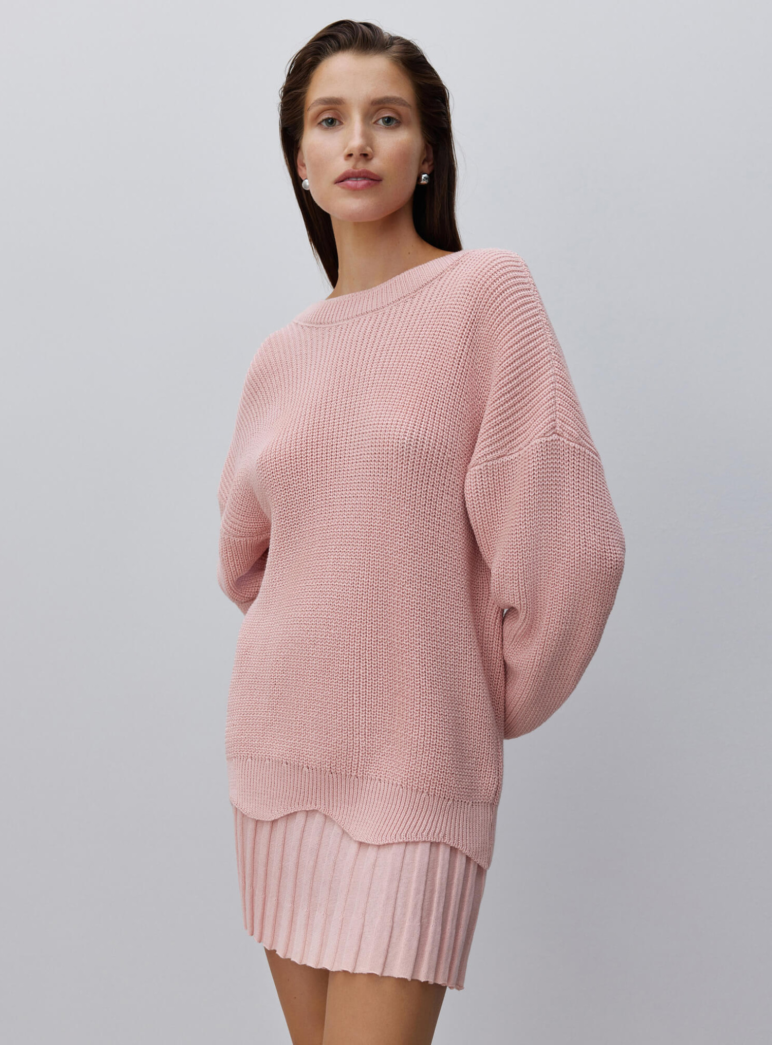 Свитер свободного кроя, в котором особым акцентом является вырез на спине. Вырез выполнен двойным манжетом, повторяющим форму лепестка цветка, как и низ свитера. Свитер имеет опущенную линию плеча, удлиненный крой и широкие рукава. Нежные цветочные элементы на объемном фасоне свитера отражают нежность и женственность и дарят комфорт. Сочетается в комплекте с юбкой гофре.
