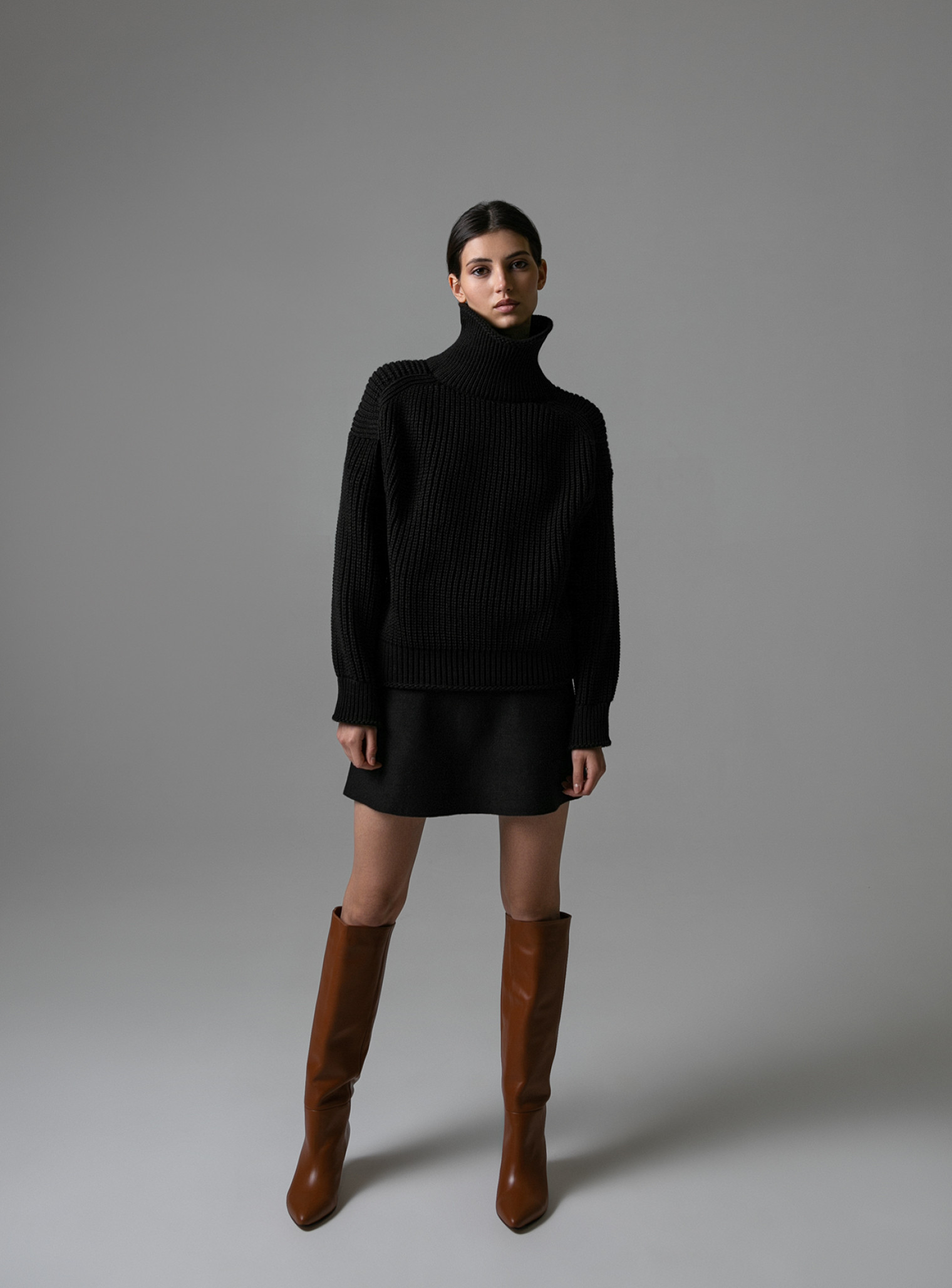 Свитер с высоким горлом, сложным кроем на плечах, oversize. Выполнен из мягкой теплой пряжи.
