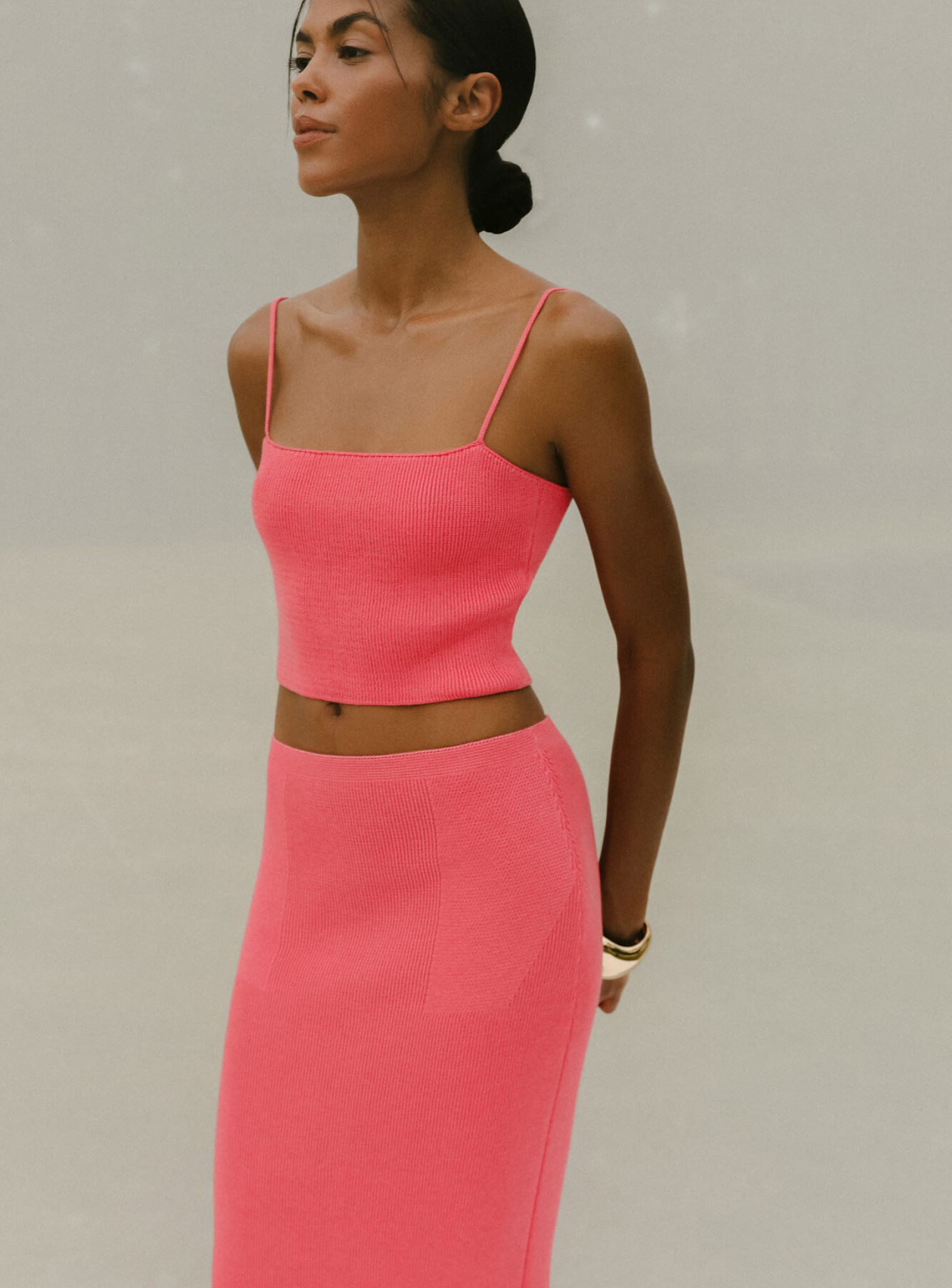 Базовый топ бандо фактурной вязки в резинку на тонких бретелях, хорошо тянущийся и плавно облегающий силуэт. Укороченная модель топа в ярких цветах поможет освежить ваши повседневные образы, сочетается в комплекте с юбкой с рисунком имитацией баски в длине мини и миди.