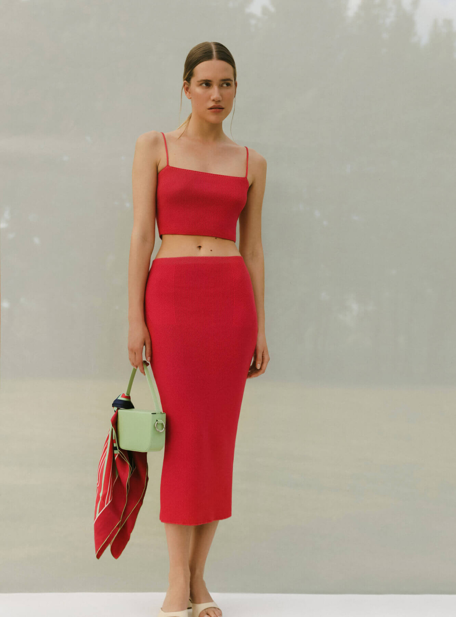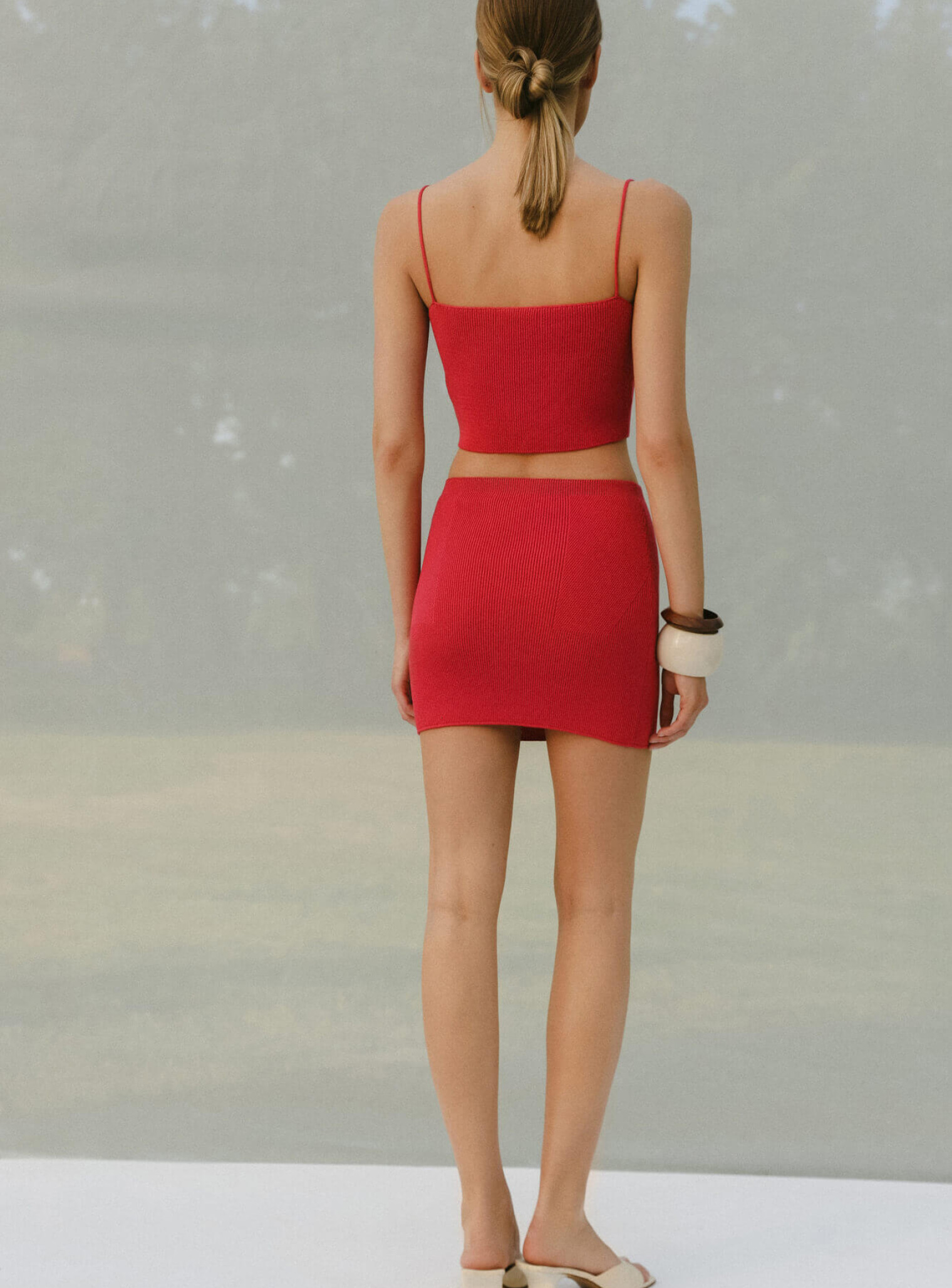 Базовый топ бандо фактурной вязки в резинку на тонких бретелях, хорошо тянущийся и плавно облегающий силуэт. Укороченная модель топа в ярких цветах поможет освежить ваши повседневные образы, сочетается в комплекте с юбкой с рисунком имитацией баски в длине мини и миди.