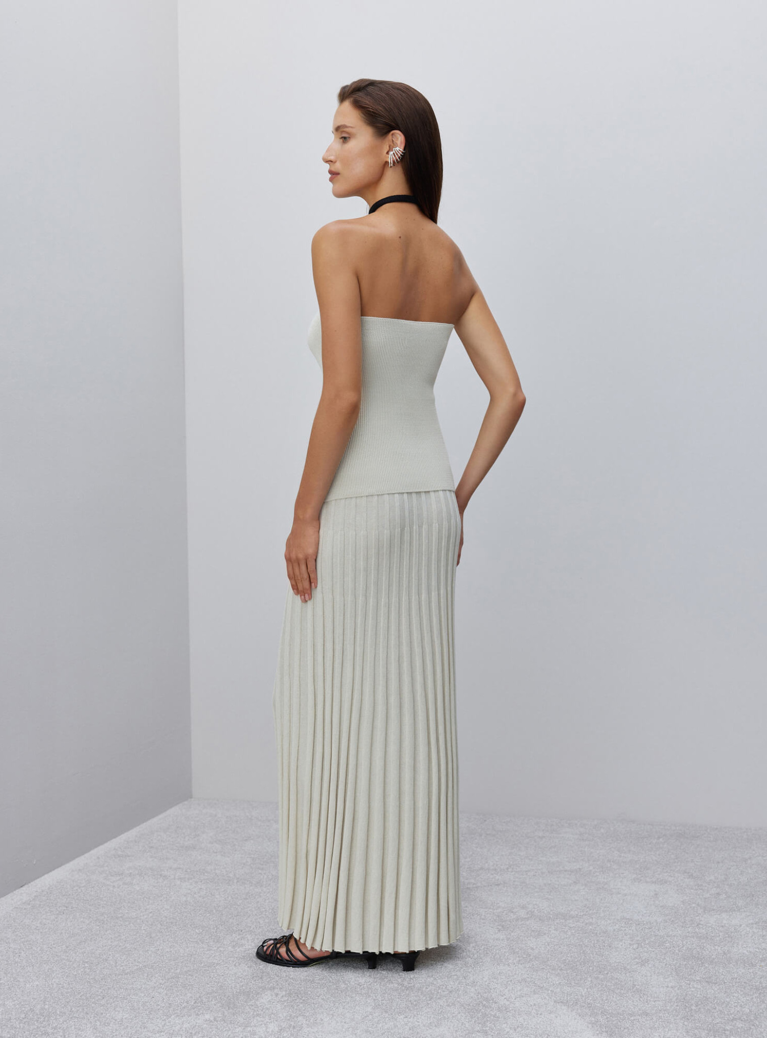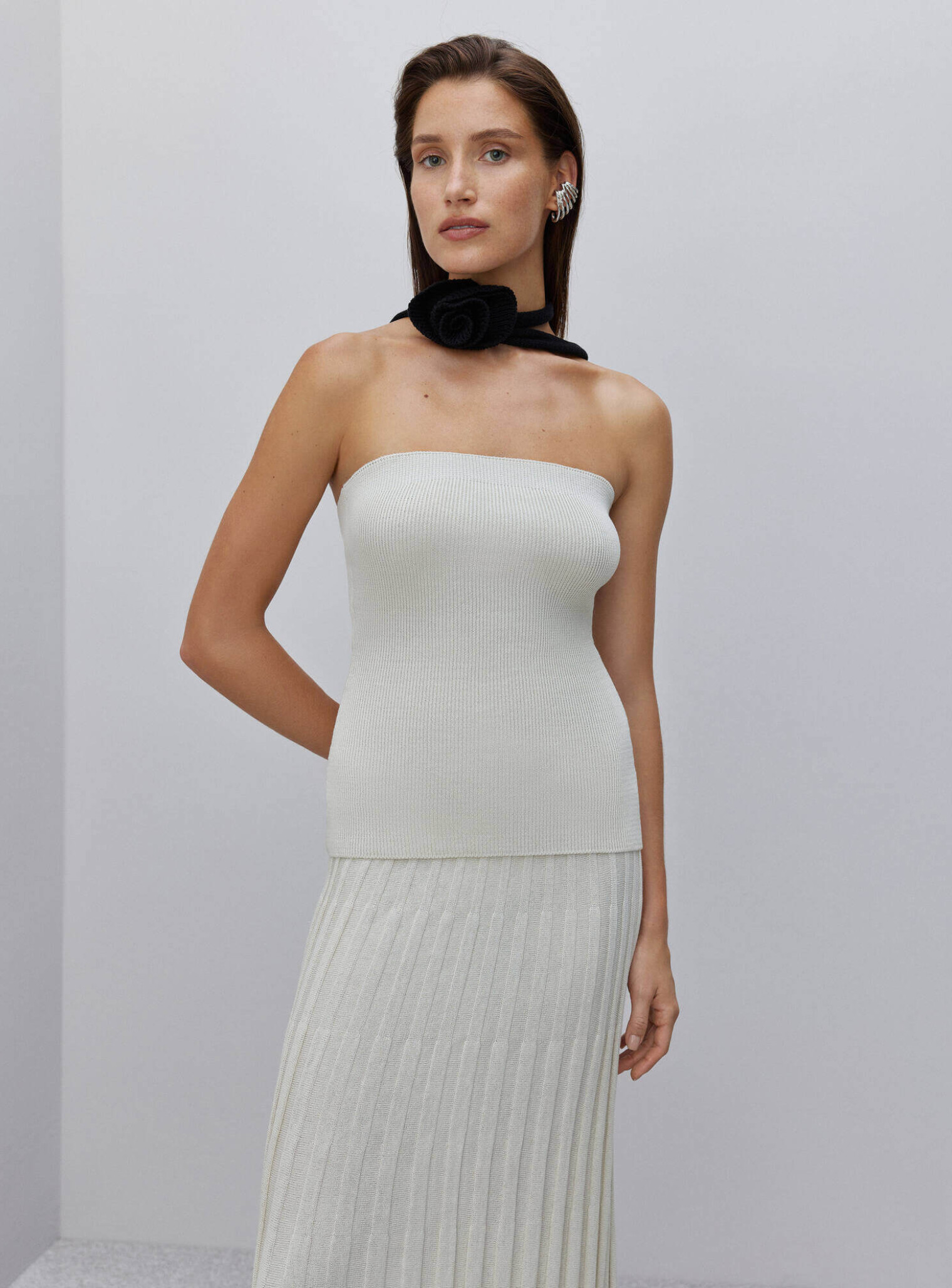 Топ бандо в резинку, имеющий трендовый удлиненный крой. Благодаря эластичному спандексу по верхней части топа, он хорошо держится на груди. Сочетается в комплекте с юбкой гофре в длине мини и миди.