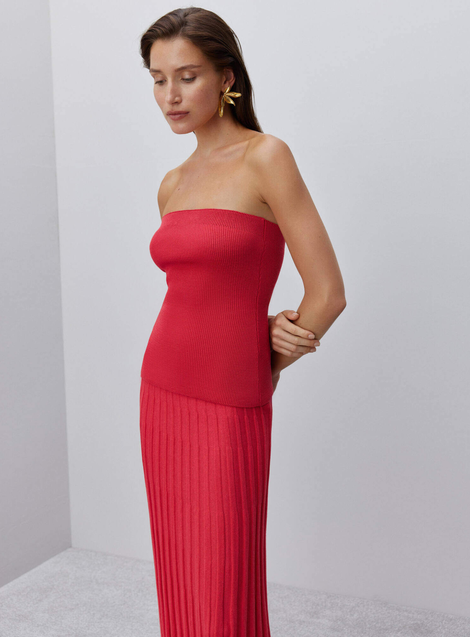Топ бандо в резинку, имеющий трендовый удлиненный крой. Благодаря эластичному спандексу по верхней части топа, он хорошо держится на груди. Сочетается в комплекте с юбкой гофре в длине мини и миди.