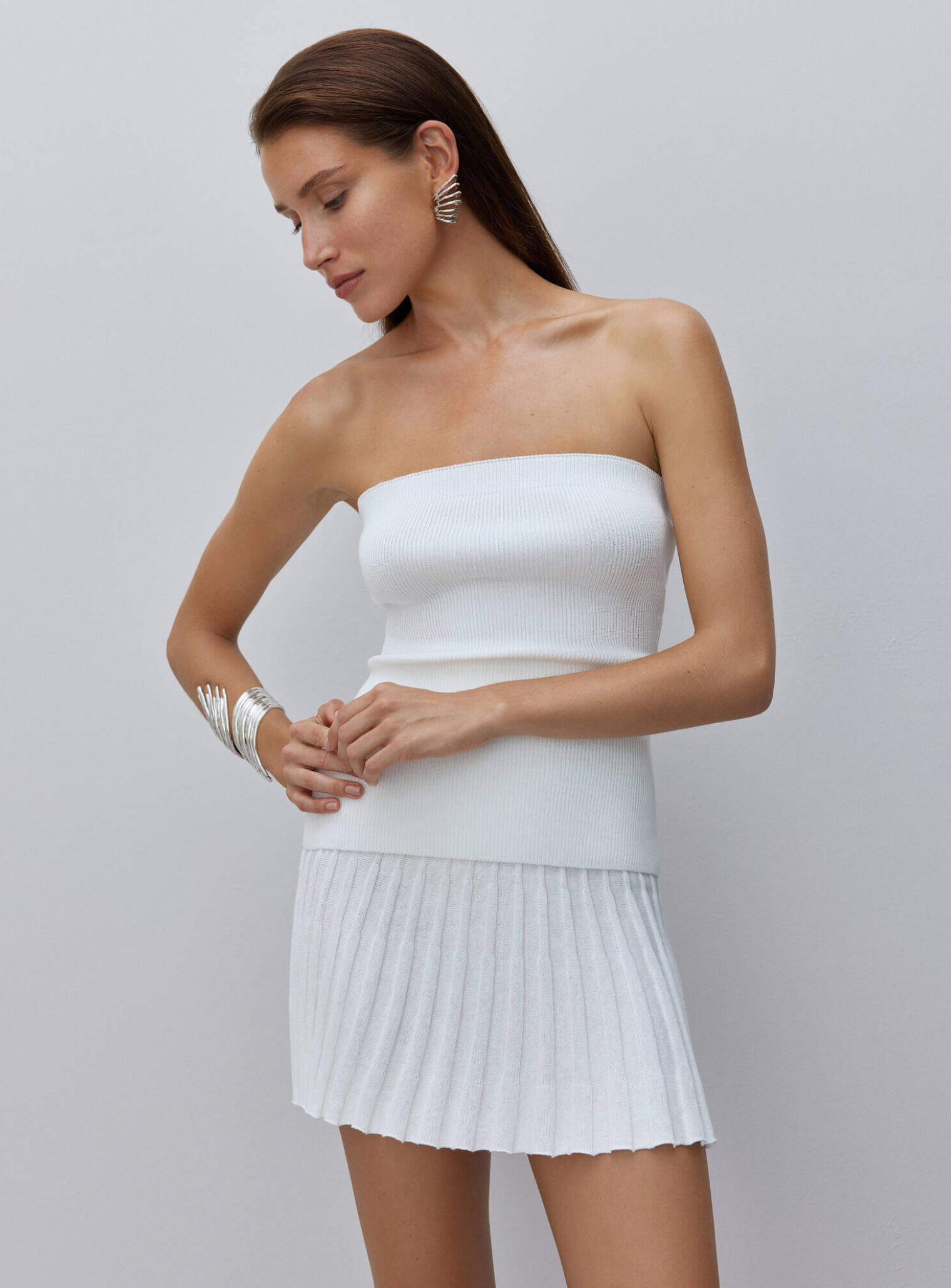 Топ бандо в резинку, имеющий трендовый удлиненный крой. Благодаря эластичному спандексу по верхней части топа, он хорошо держится на груди. Сочетается в комплекте с юбкой гофре в длине мини и миди.