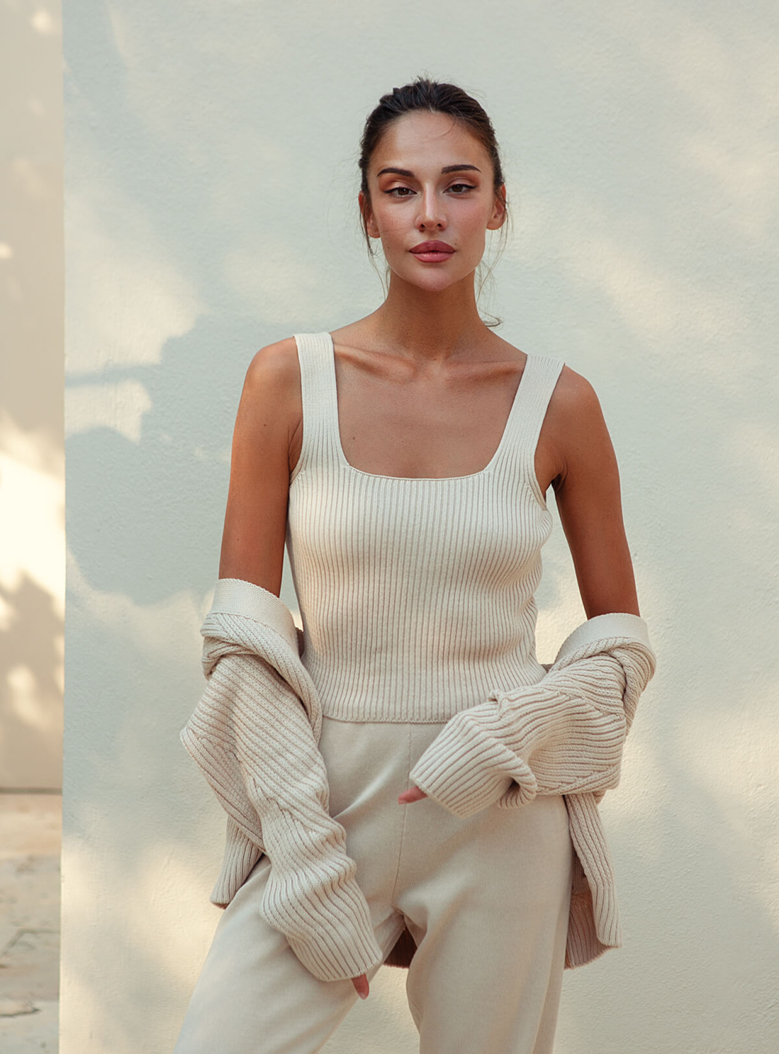 Классический топ с широкими бретелями в резинках. Идеальная база, которая дополнит образы с жакетами, кардиганами или пальто. Универсальный стильный крой, именно то, что подойдет для гардероба в холодное время года.