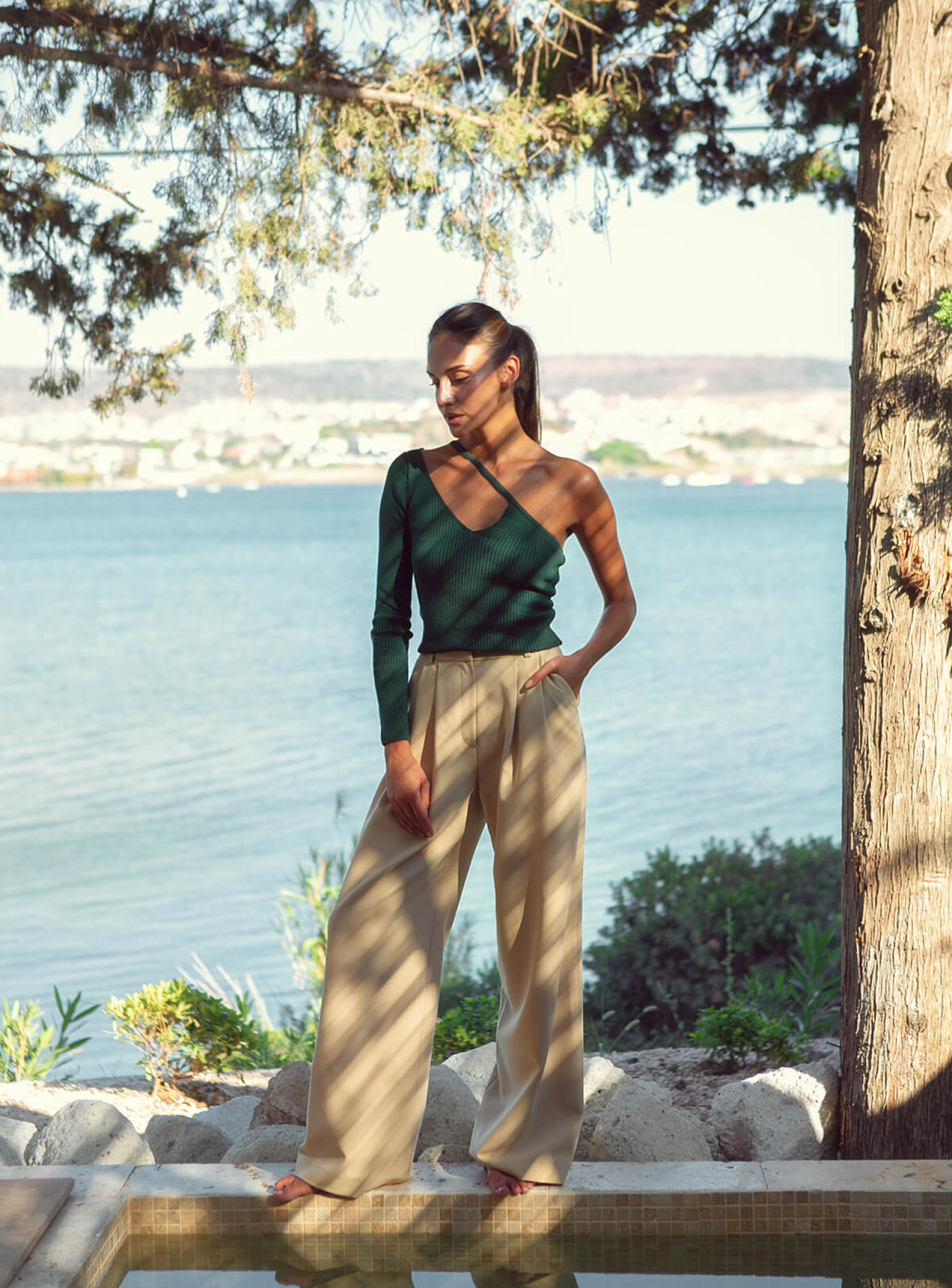 Трендовый топ на плечо, который можно носить в двух вариациях. Станет ярким акцентом в вашем гардеробе и идеально дополнит образы с брендовыми жакетами и пальто.