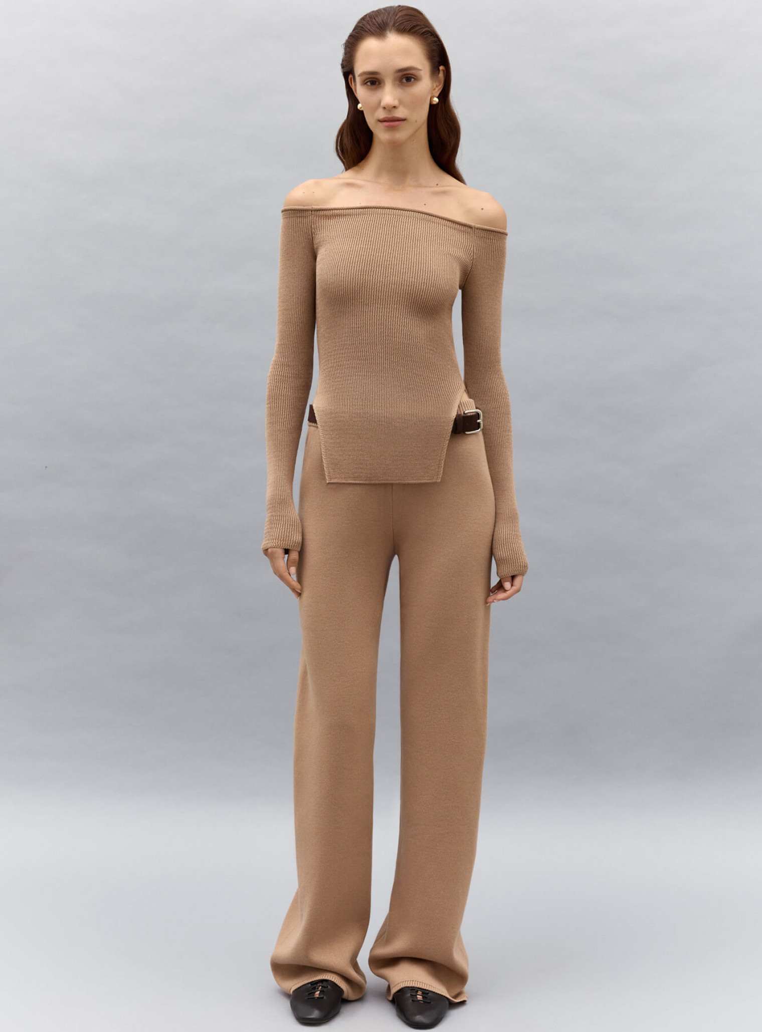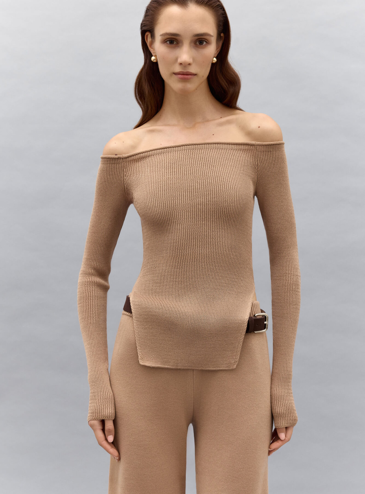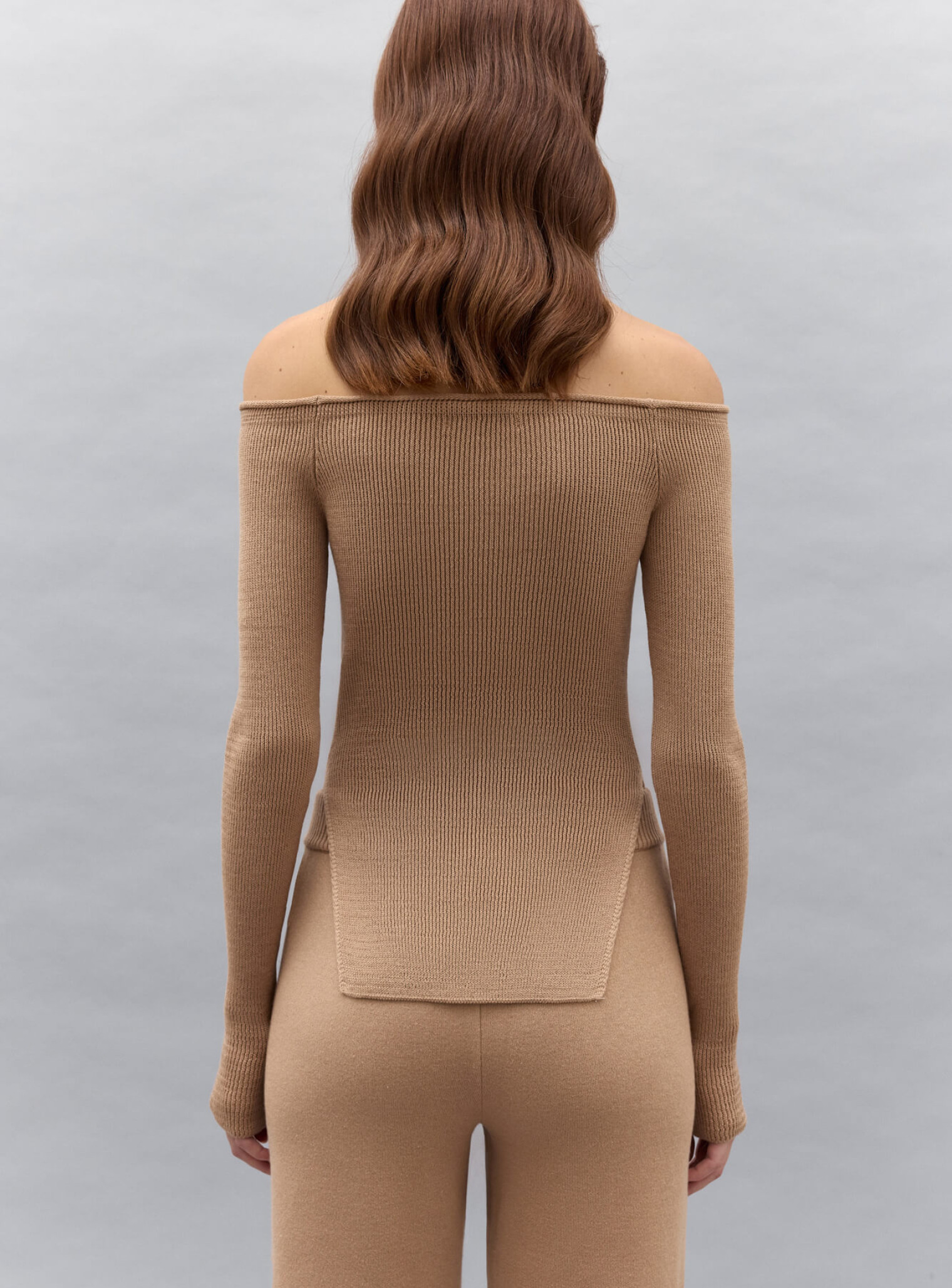 Эффектный топ с обнаженными плечами и разрезами по бокам. Выполнен из фактурного трикотажа в рубчик, облегающего силуэт. Хорошо держится на плечах, за счет вставки плотного спандекса.  Сочетается в комплект со штанами прямого кроя.