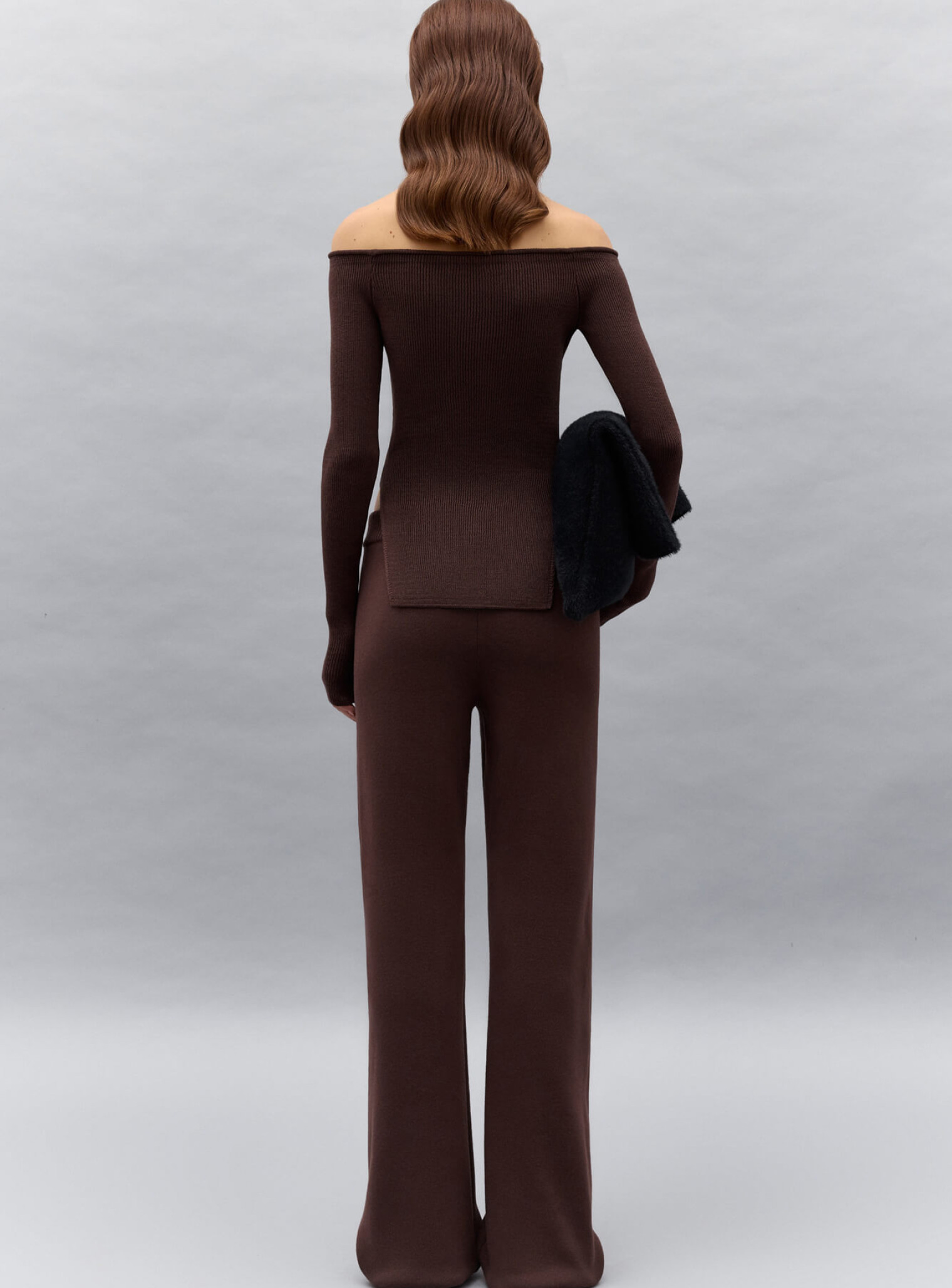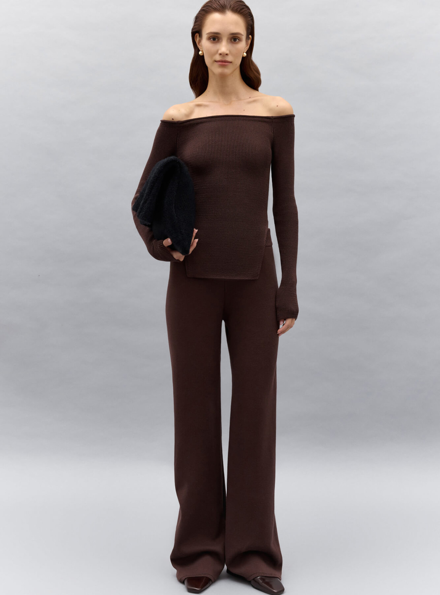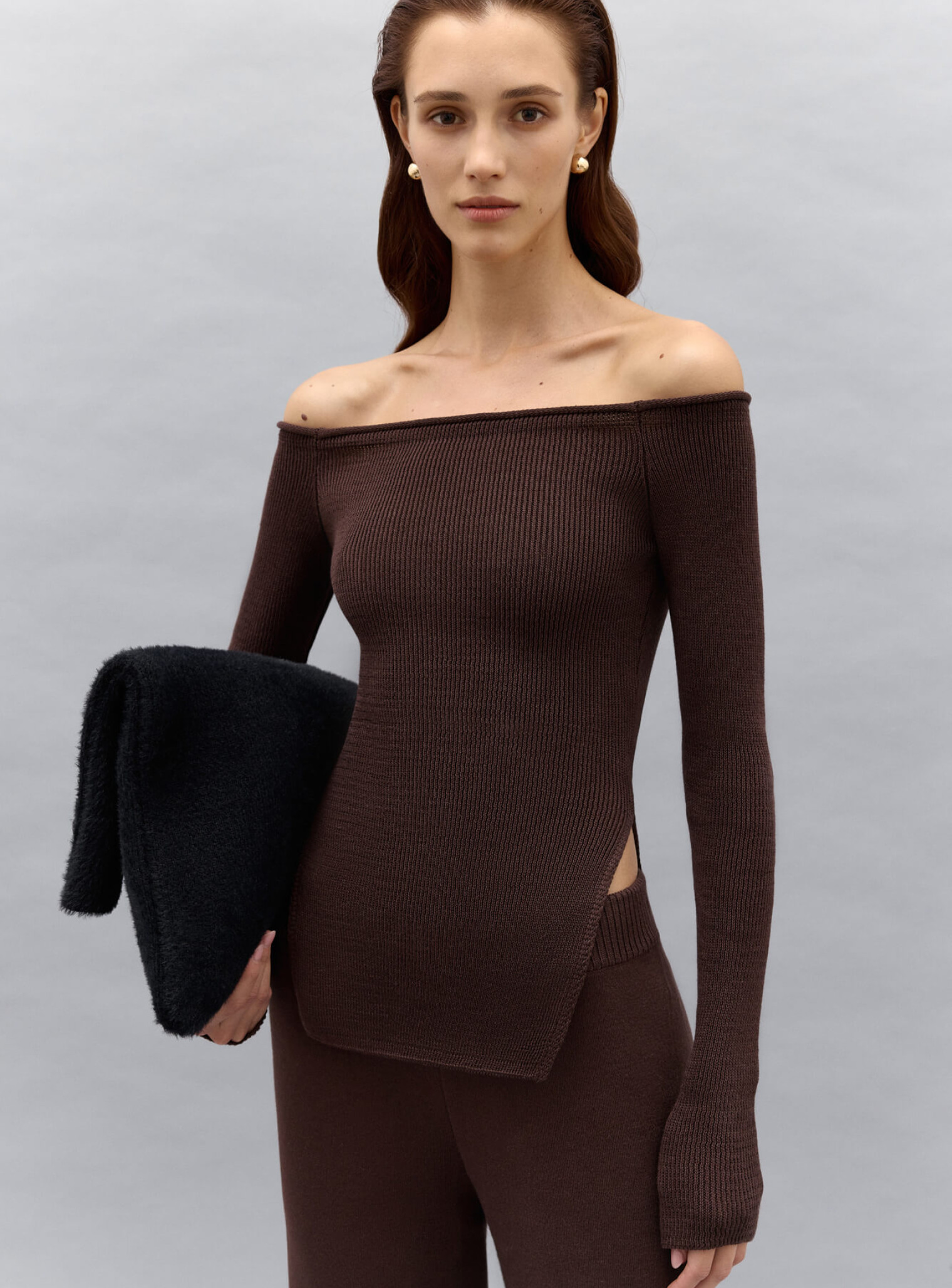 Эффектный топ с обнаженными плечами и разрезами по бокам. Выполнен из фактурного трикотажа в рубчик, облегающего силуэт. Хорошо держится на плечах, за счет вставки плотного спандекса.  Сочетается в комплект со штанами прямого кроя.