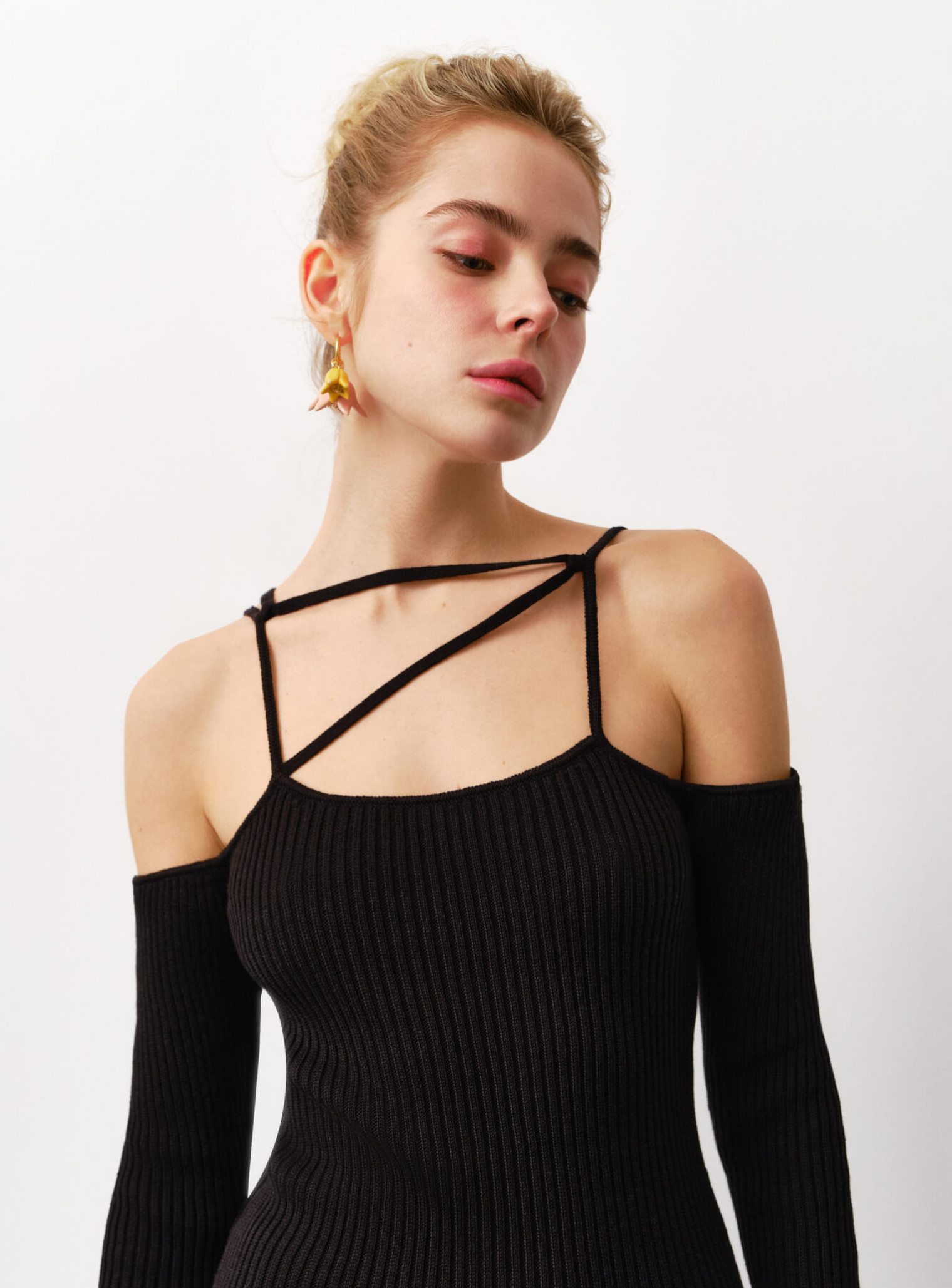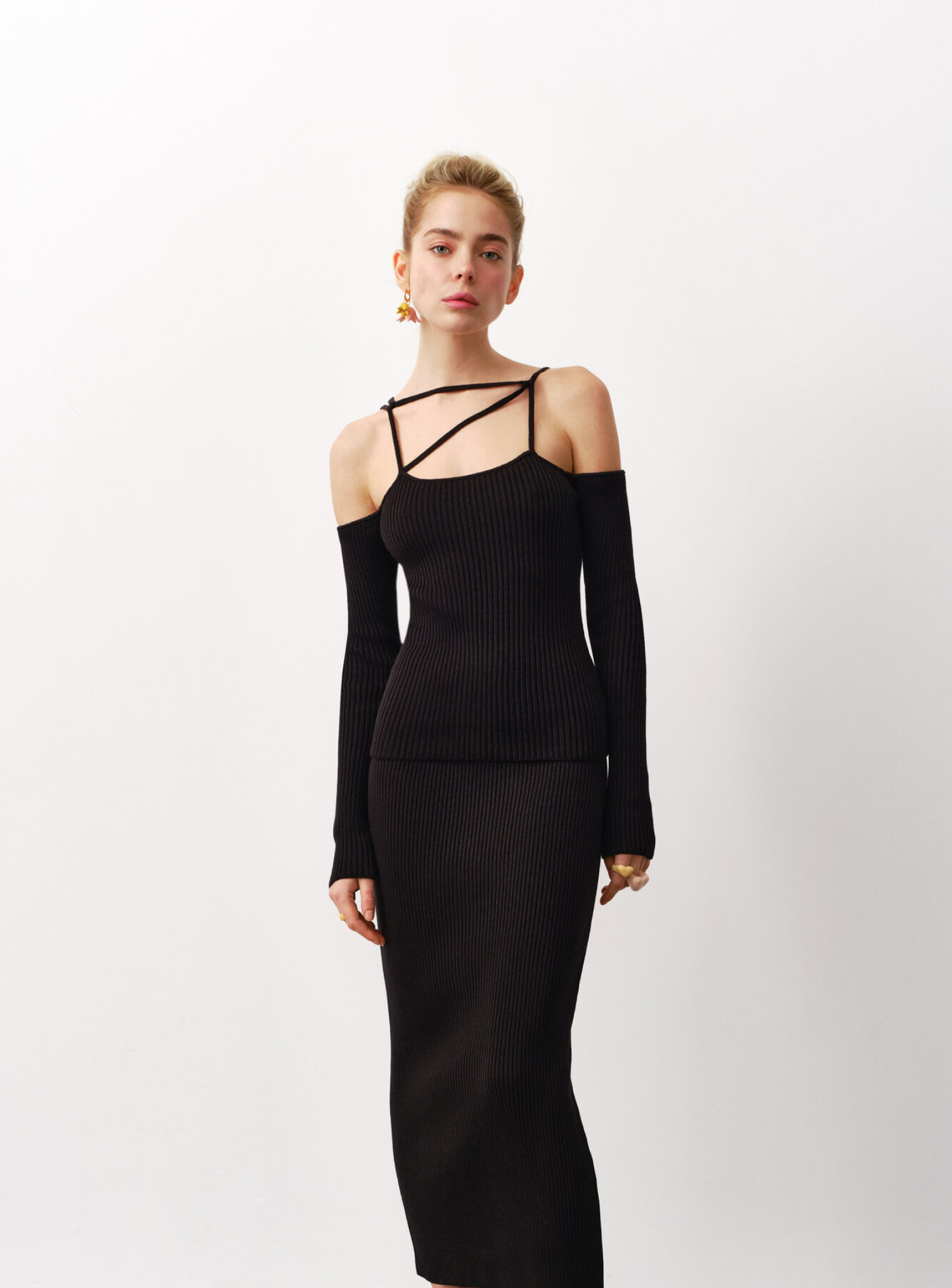 Трендовый топ с обнаженными плечами, деликатно декорированными полоской ткани, которую можно завязывать в разных вариациях. Подчеркивает хрупкую часть женского тела - ключицы и создает интересные линии в образе.