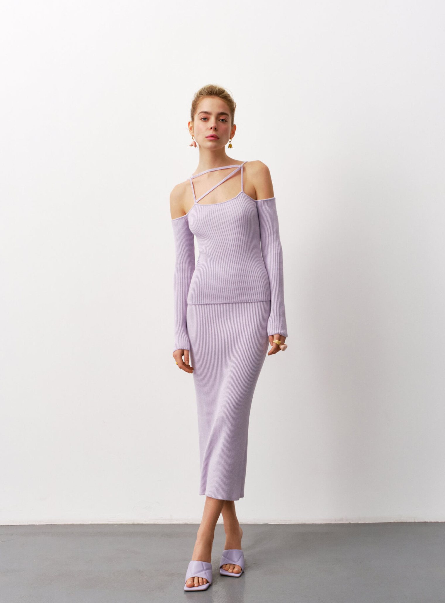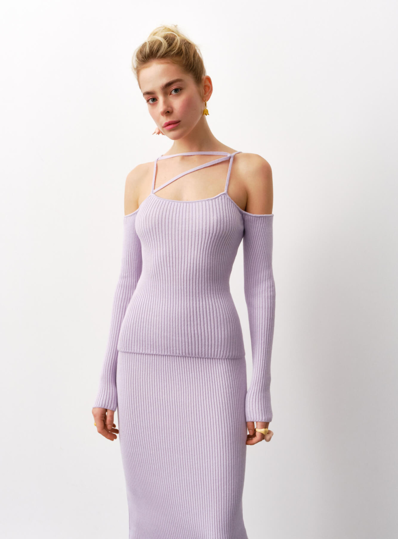 Трендовый топ с обнаженными плечами, деликатно декорированными полоской ткани, которую можно завязывать в разных вариациях. Подчеркивает хрупкую часть женского тела - ключицы и создает интересные линии в образе.