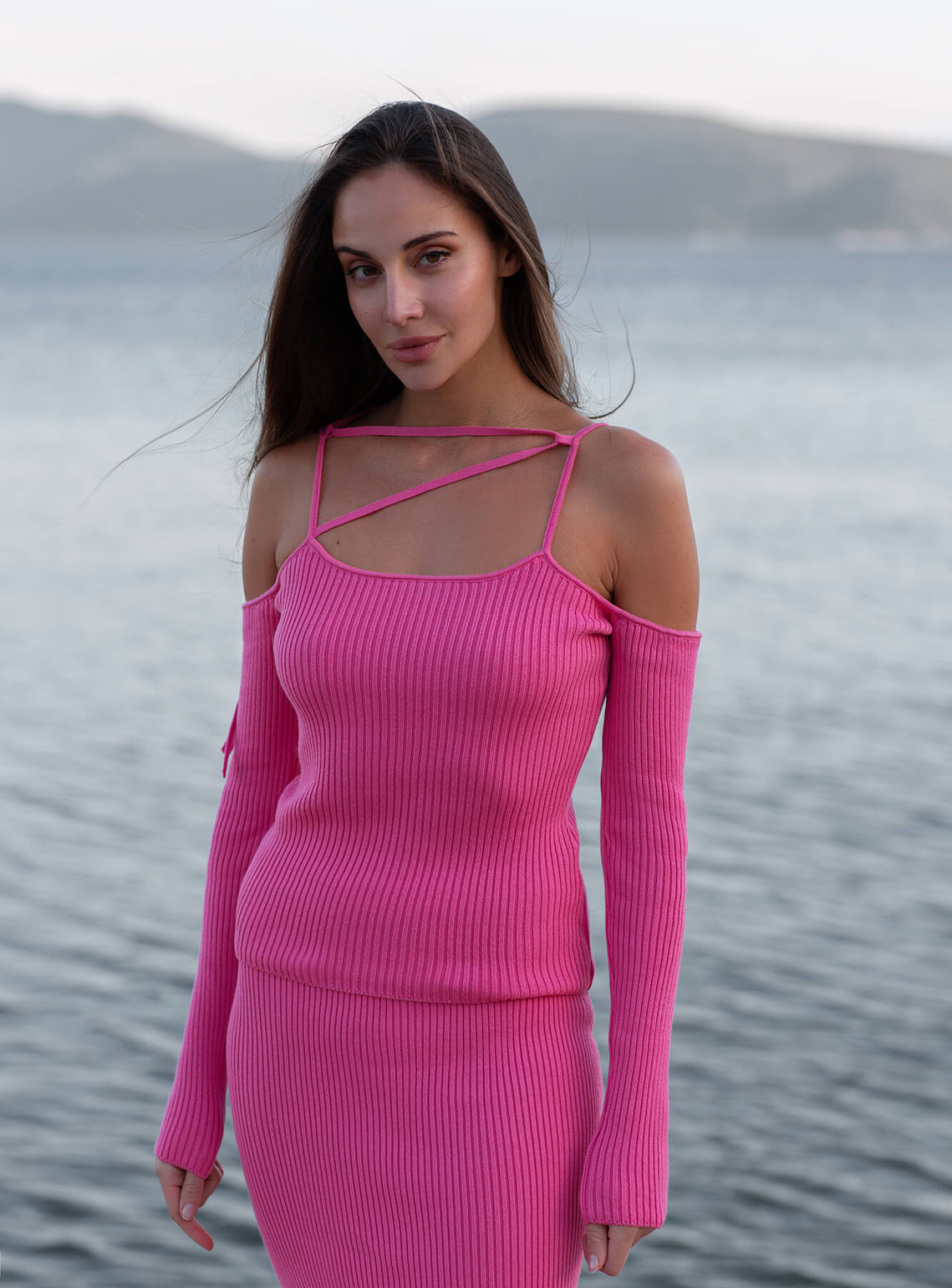 Трендовый топ с обнаженными плечами, деликатно декорированными полоской ткани, которую можно завязывать в разных вариациях. Подчеркивает хрупкую часть женского тела - ключицы и создает интересные линии в образе.