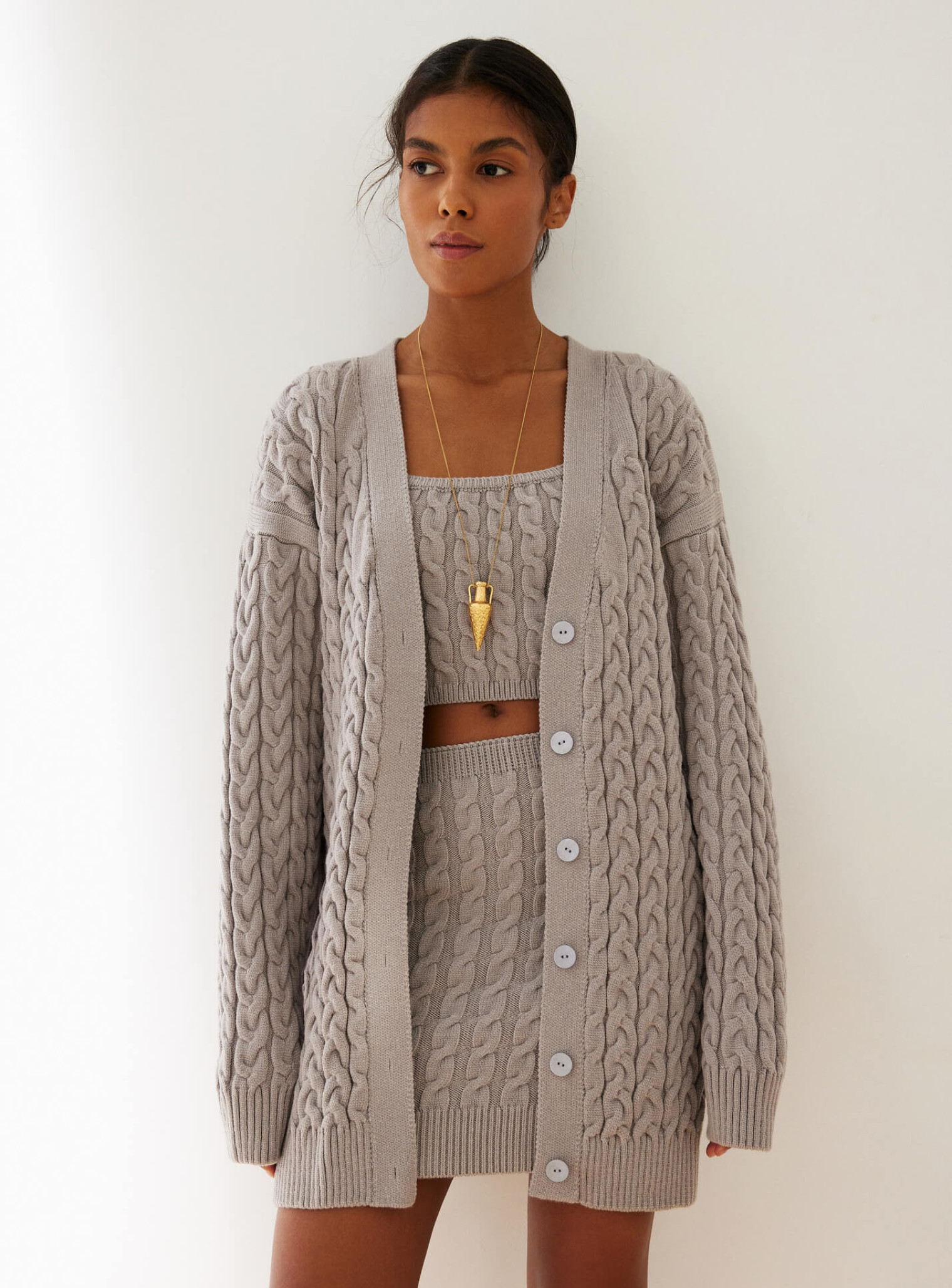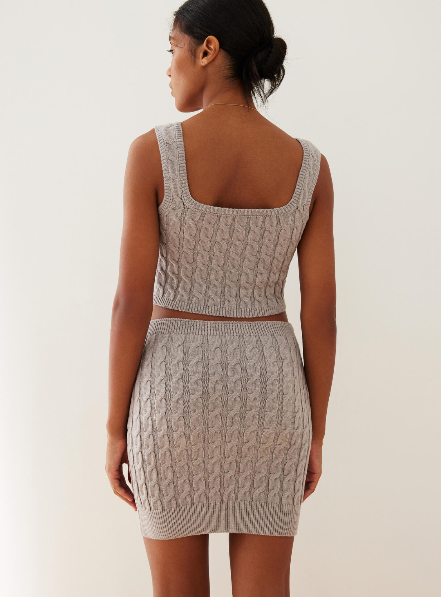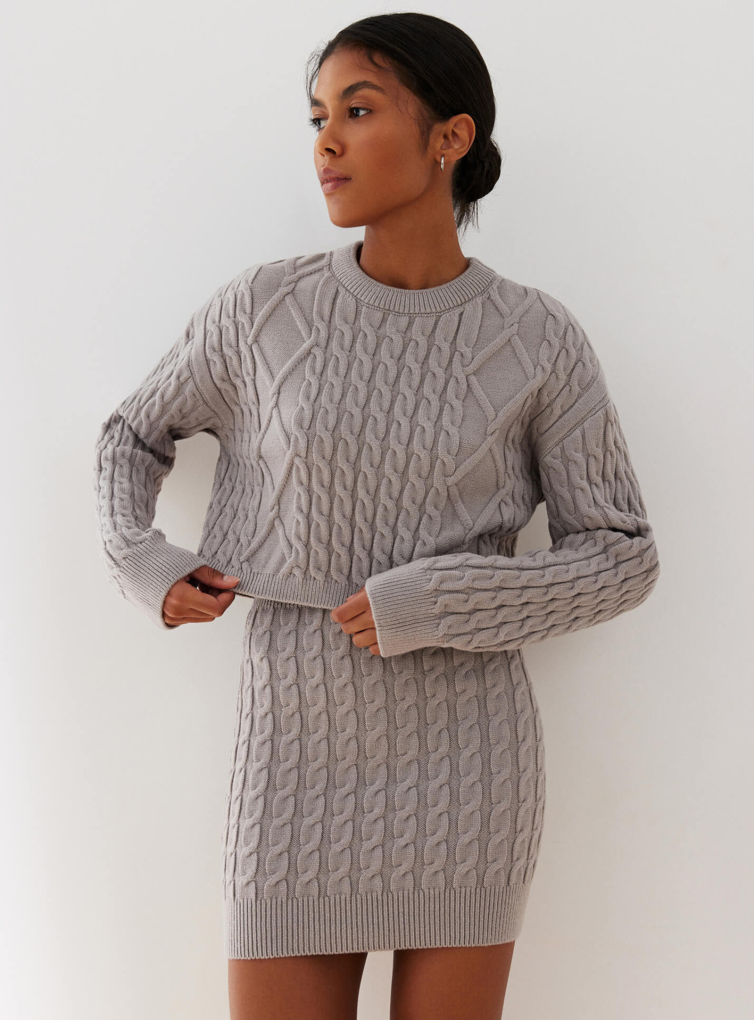 Силуэтная мини-юбка с фактурным узором, с комфортной резинкой, которая позволяет посадить юбку на линии талии. Сочетается в костюме с укороченным джемпером, или топом и кардиганом с фактурным узором.